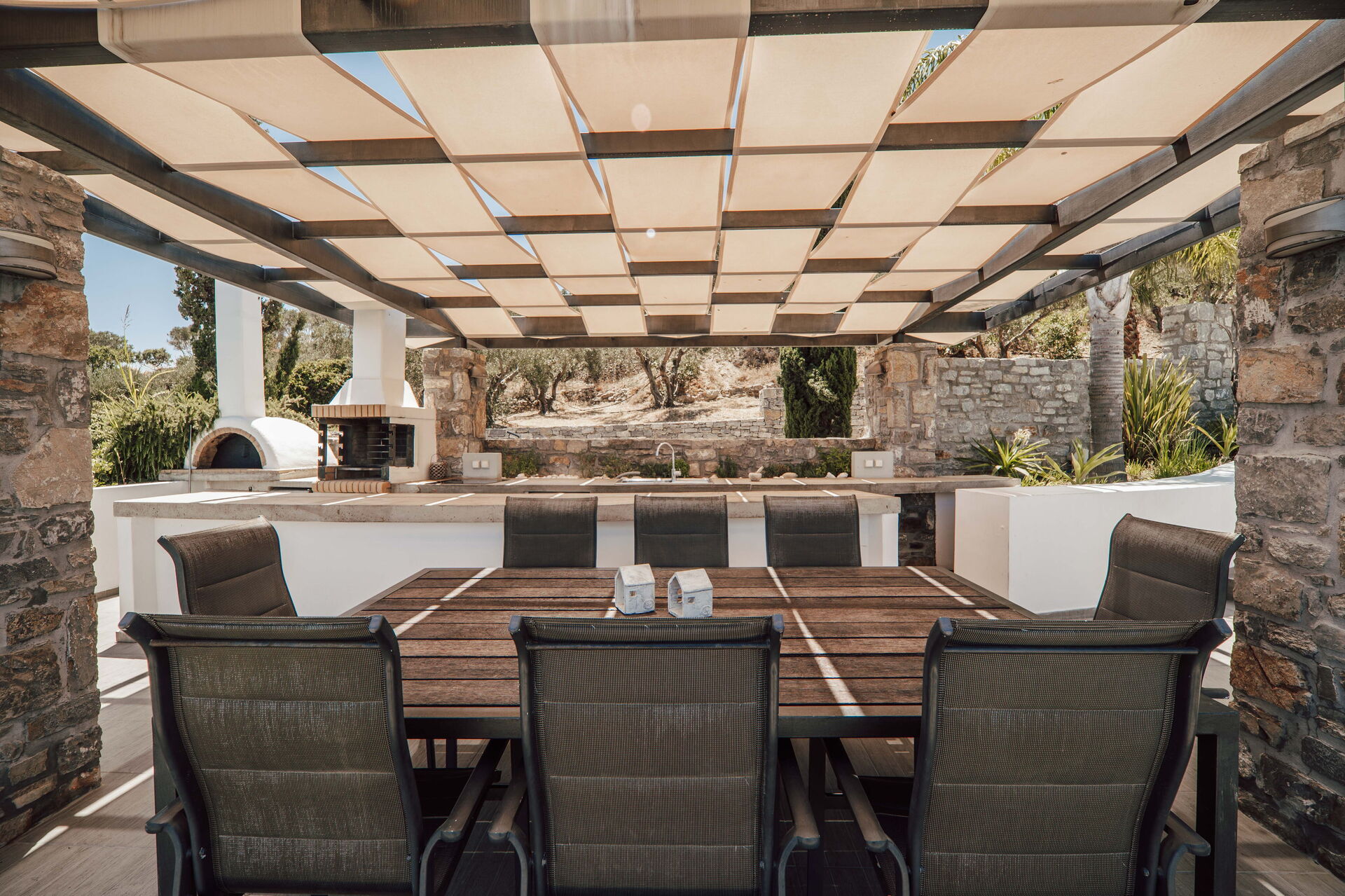 - privat udendørsområde med udendørskøkken og pavillon med bord og stole til måltider under åben himmel
