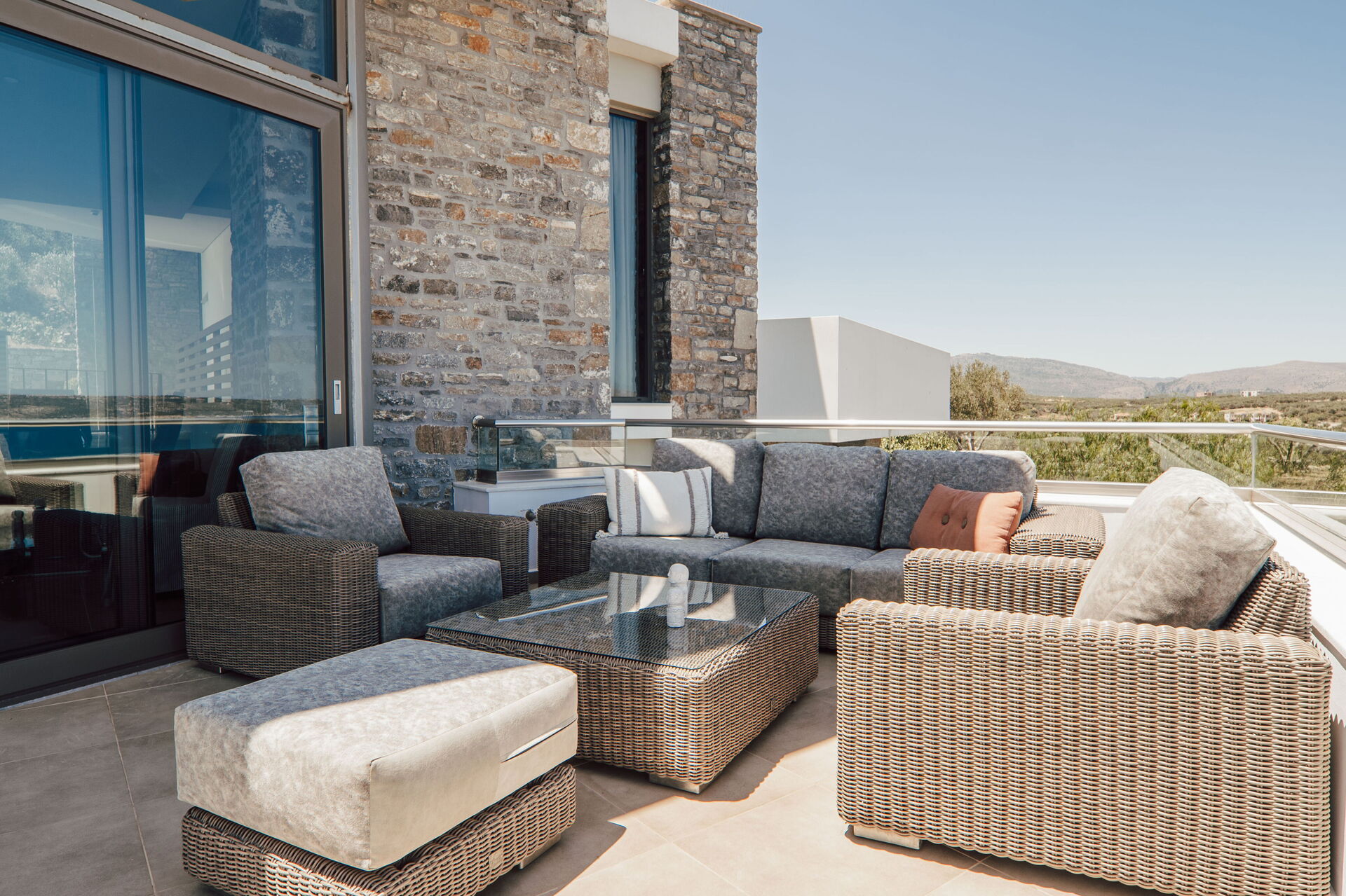 The rattan sofa and armchairs on the terrace outside the living room had thick and comfortable cushions.