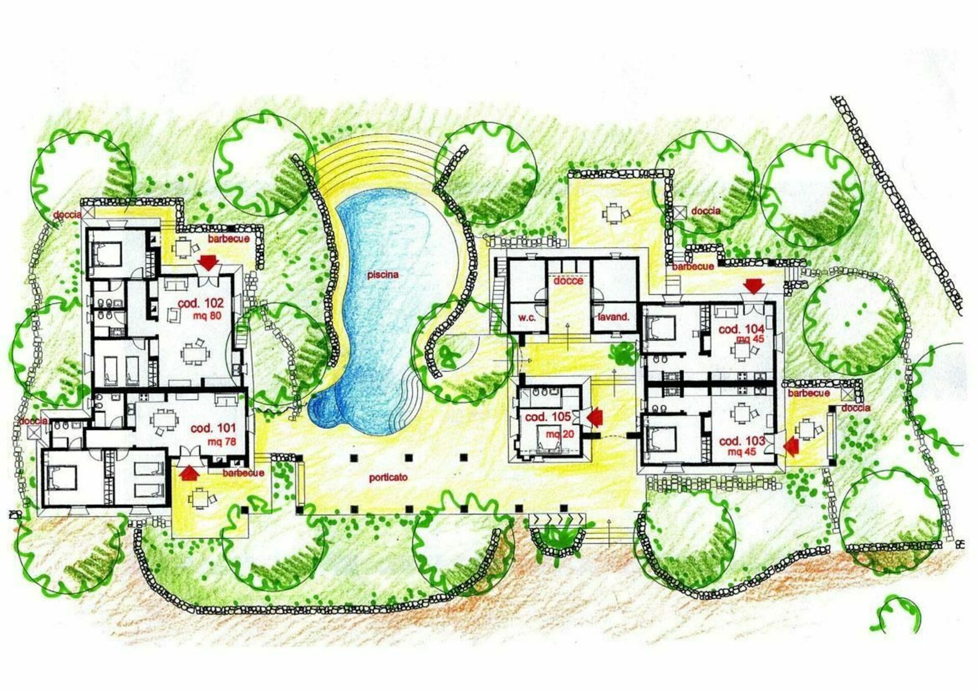 Bygningen er opdelt i 6 enheder og indvendigt bevarer de traditionelle karakteristika for trulli, der findes i Puglia; hver lejlighed byder på elegant indretning og har sin egen private terrasse med bord, stole og grill, hvor måltiderne kan nydes i det fri.