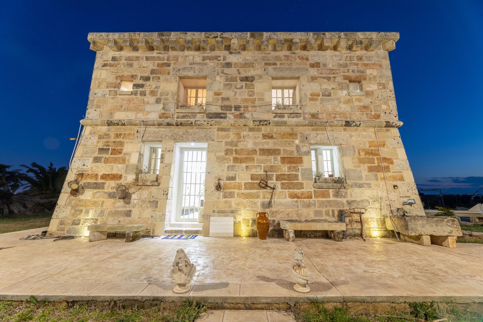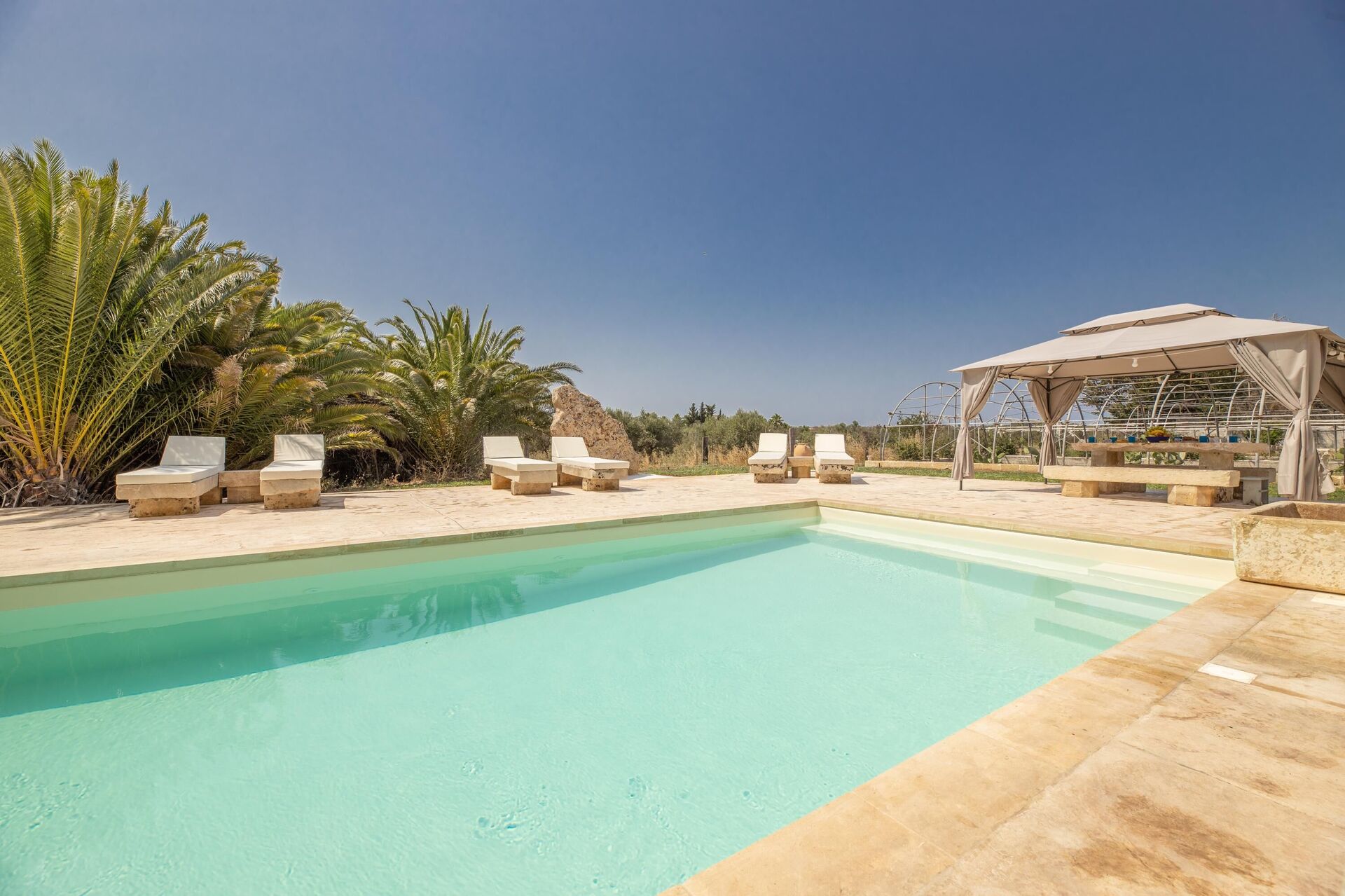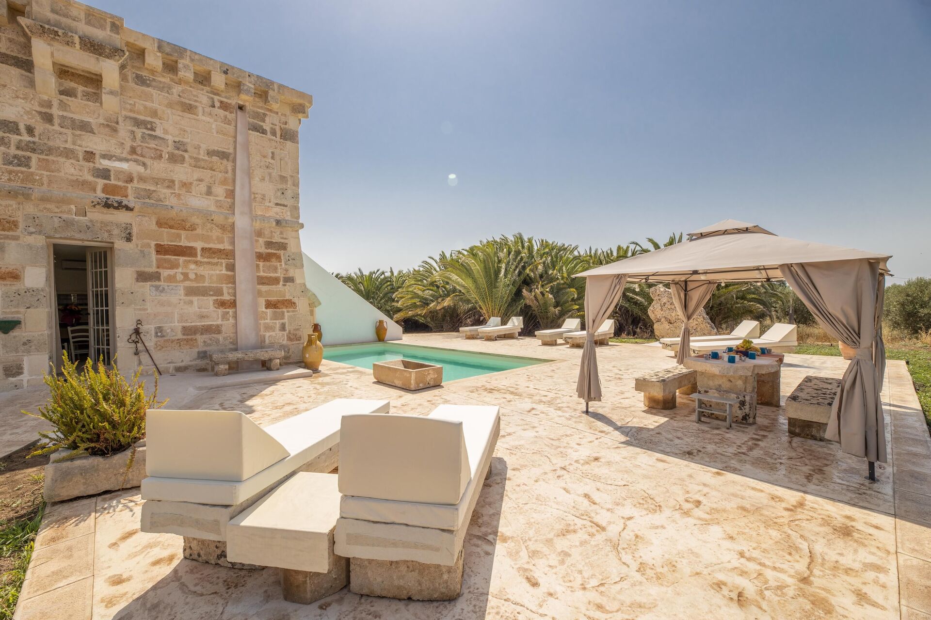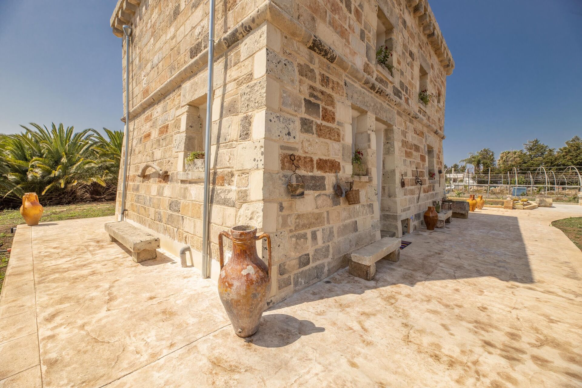 Huset er enkelt indrettet i stil med husets traditionelle struktur. Haven er meget stor, omkring 5000 m2 med en elegant swimmingpool, der har karakteristiske sten liggestole. Lige ved poolen er der et område med markiser, der giver skygge til stenbordet og -stolene. Ejendommens stil er gennemført med flere smukke arealer i haven med stenmøbler.