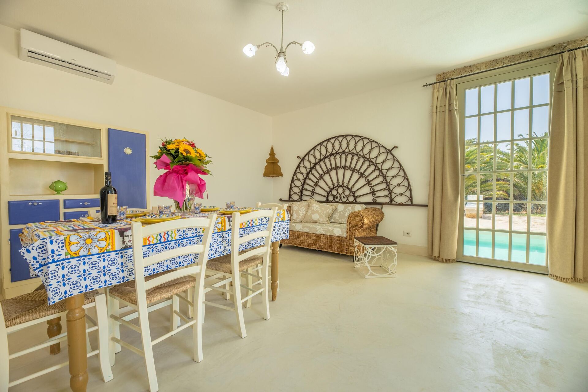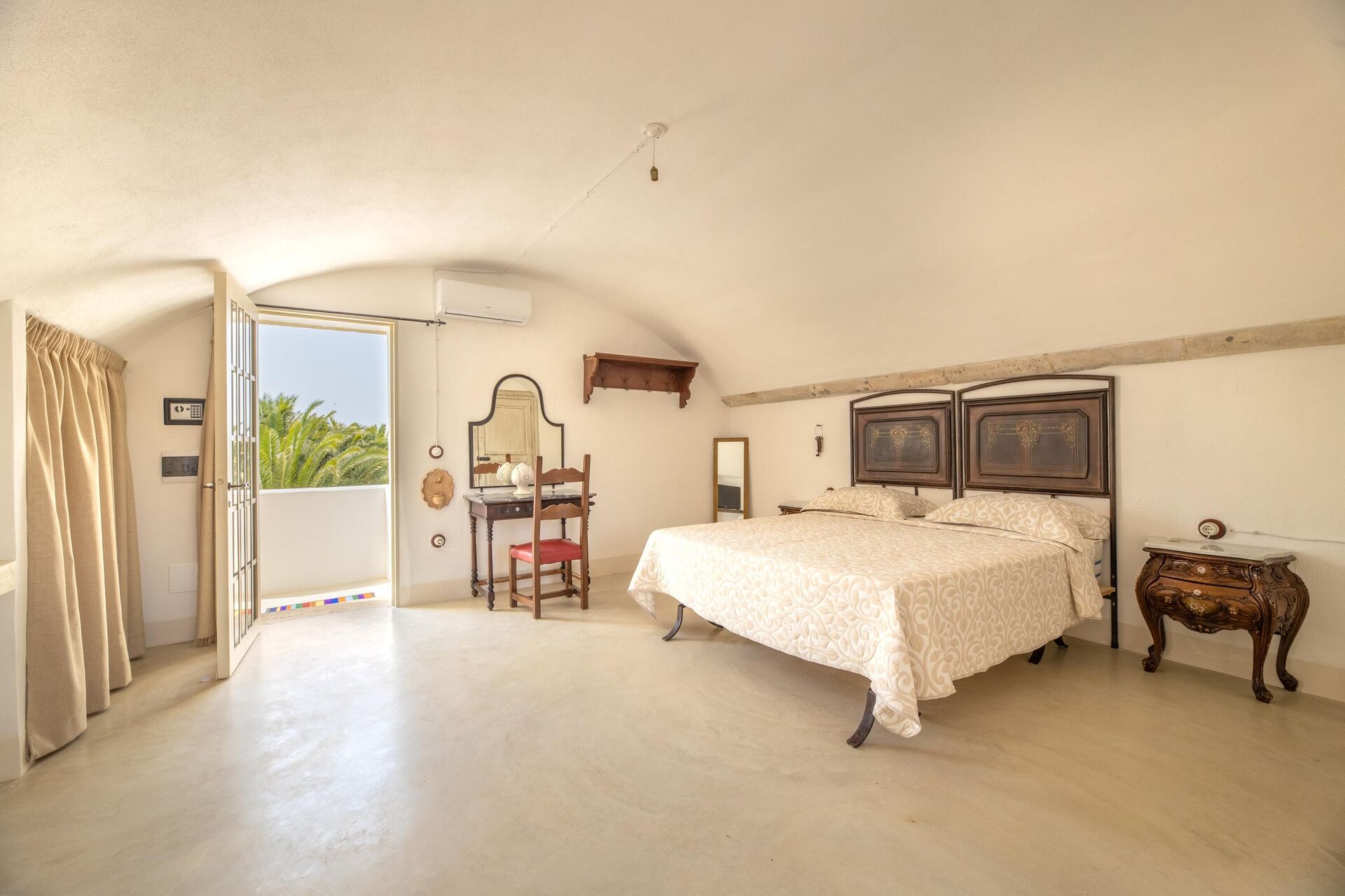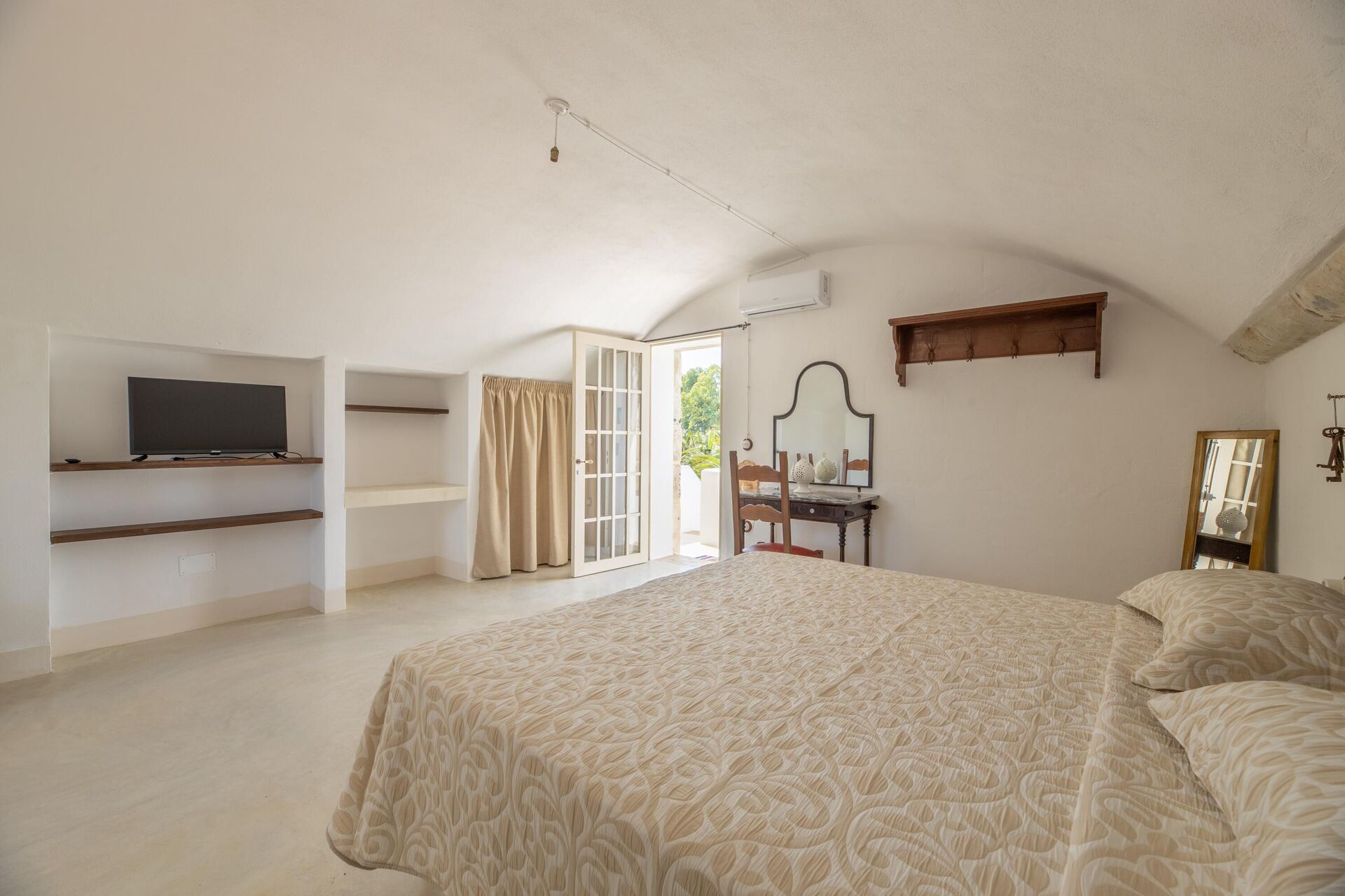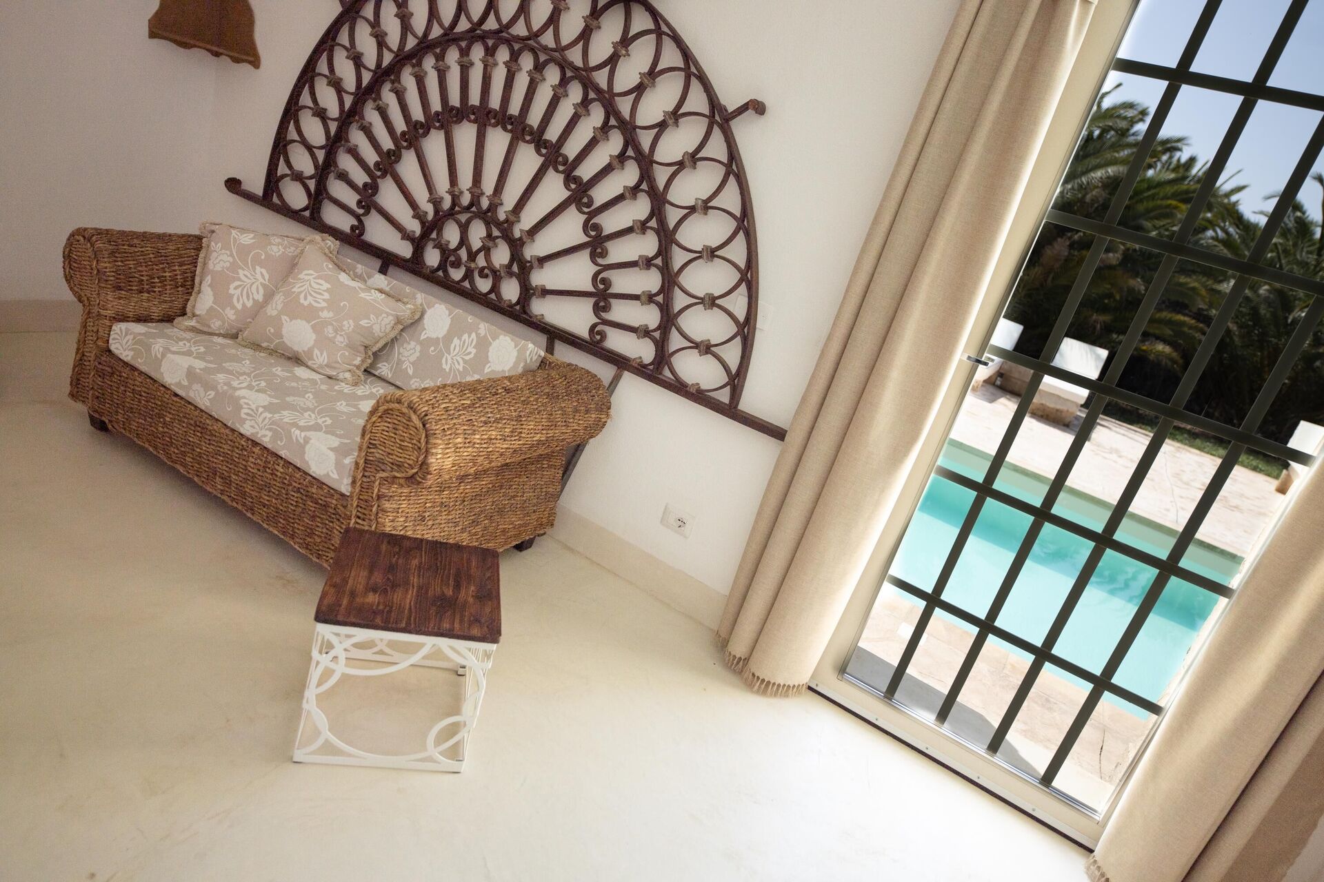 Huset er enkelt indrettet i stil med husets traditionelle struktur. Haven er meget stor, omkring 5000 m2 med en elegant swimmingpool, der har karakteristiske sten liggestole. Lige ved poolen er der et område med markiser, der giver skygge til stenbordet og -stolene. Ejendommens stil er gennemført med flere smukke arealer i haven med stenmøbler.