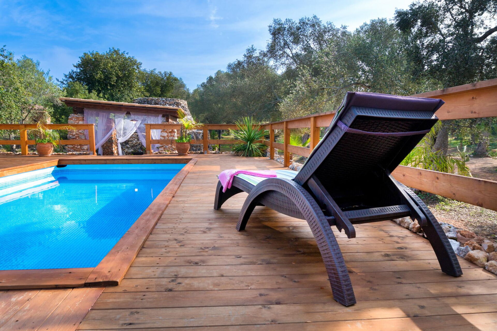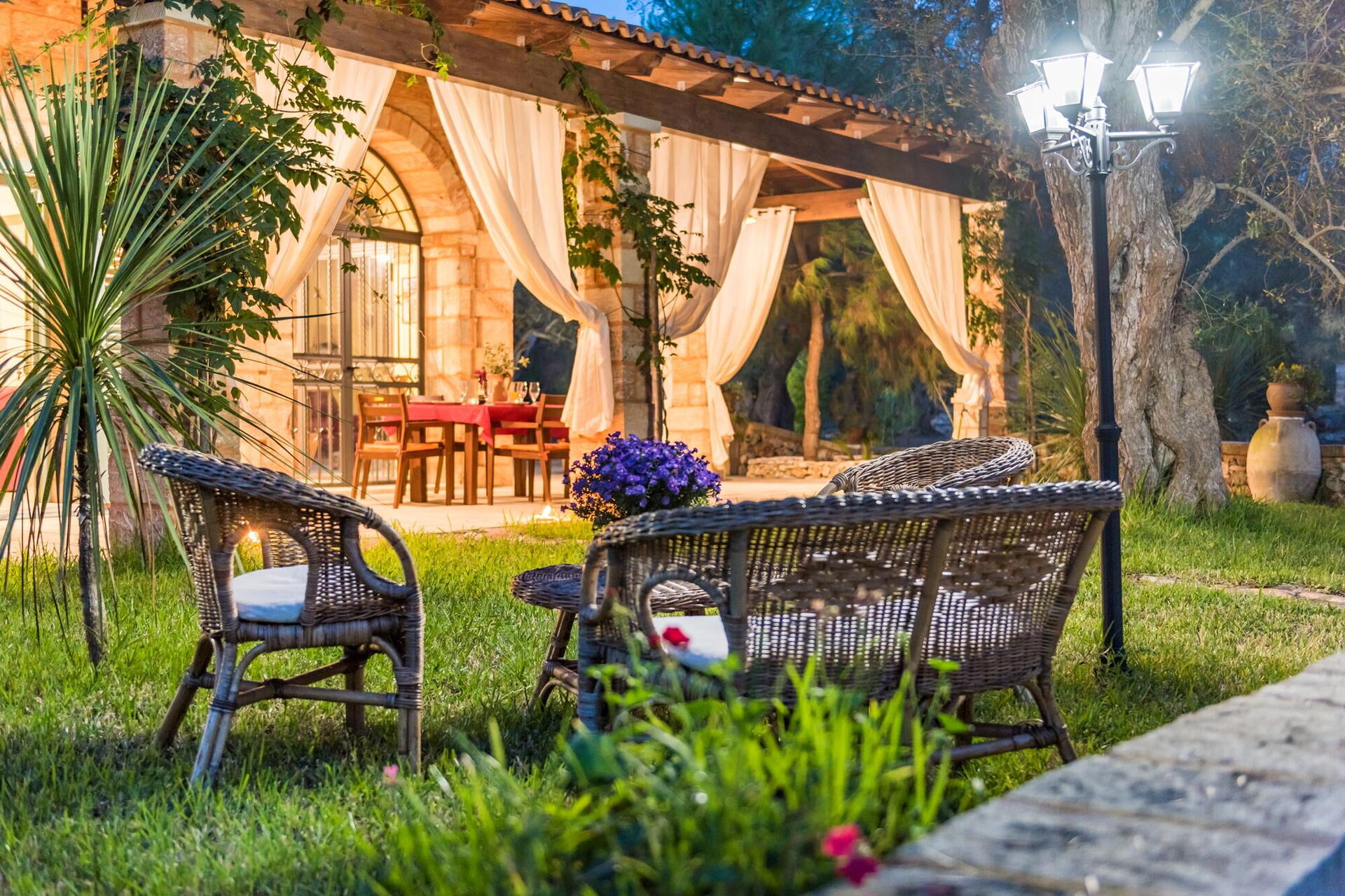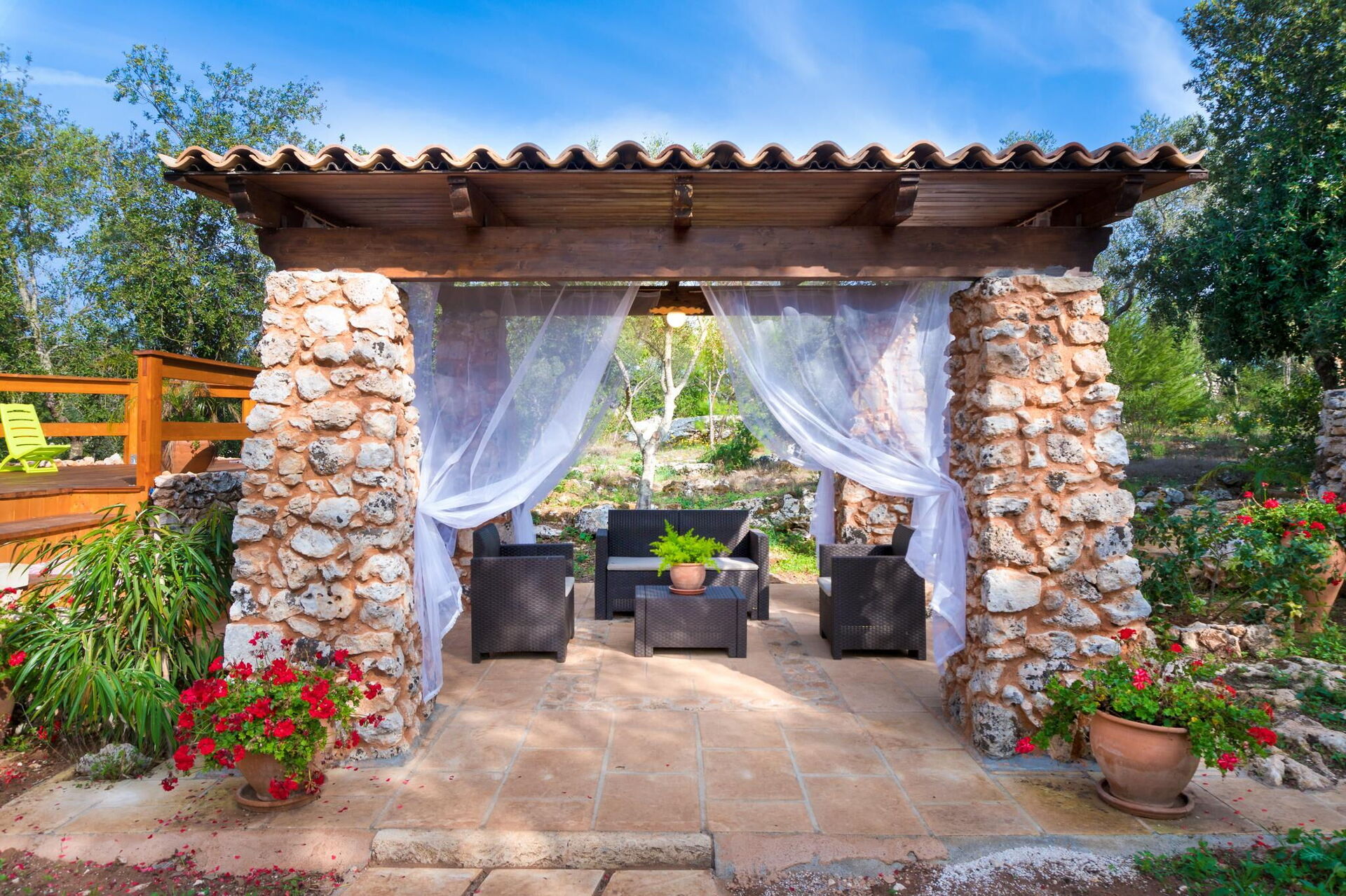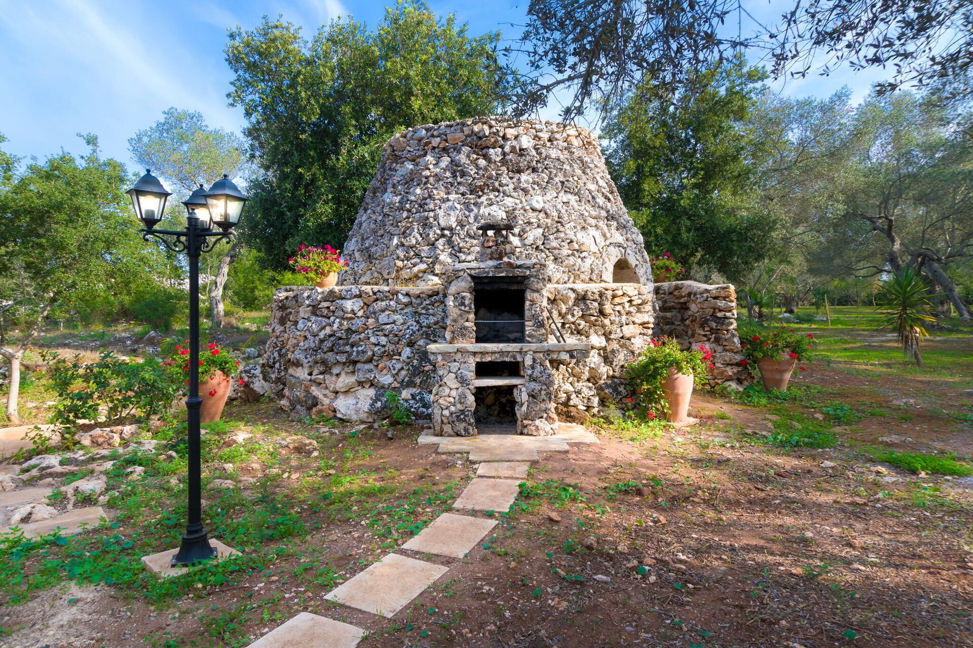 Huset er smagfuldt indrettet med hvælvede lofter og karakteristiske tufa stenvægge, og takket være sine 3 soveværelser og en enkelt sovesofa, kan det rumme op til 7 personer. Haveområdet er stort med træer, buske og planter typiske for Middelhavsområdet samt en privat swimmingpool til gæsternes rådighed, en elegant pavillon og flere afslapningsområder.