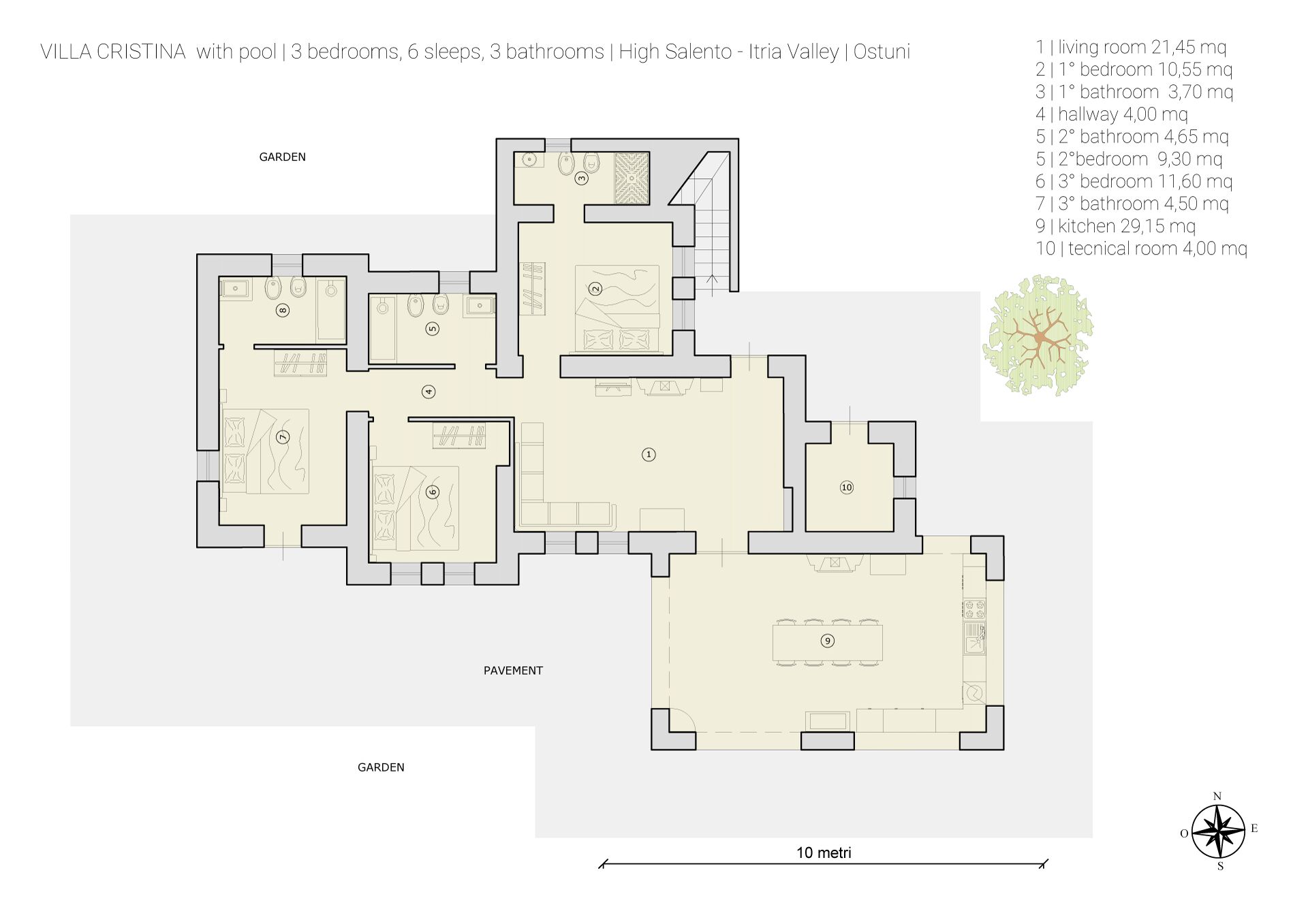 Sommerhuset har 3 soveværelser og er velegnet til en familie eller en gruppe venner, der ønsker at holde ferie sammen i Puglia.