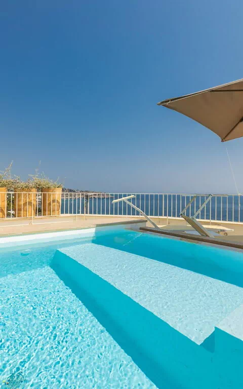 - Terrasse med panoramaudsigt over havet og privat opvarmet pool (3 m x 3 m, 1,3 m dyb)