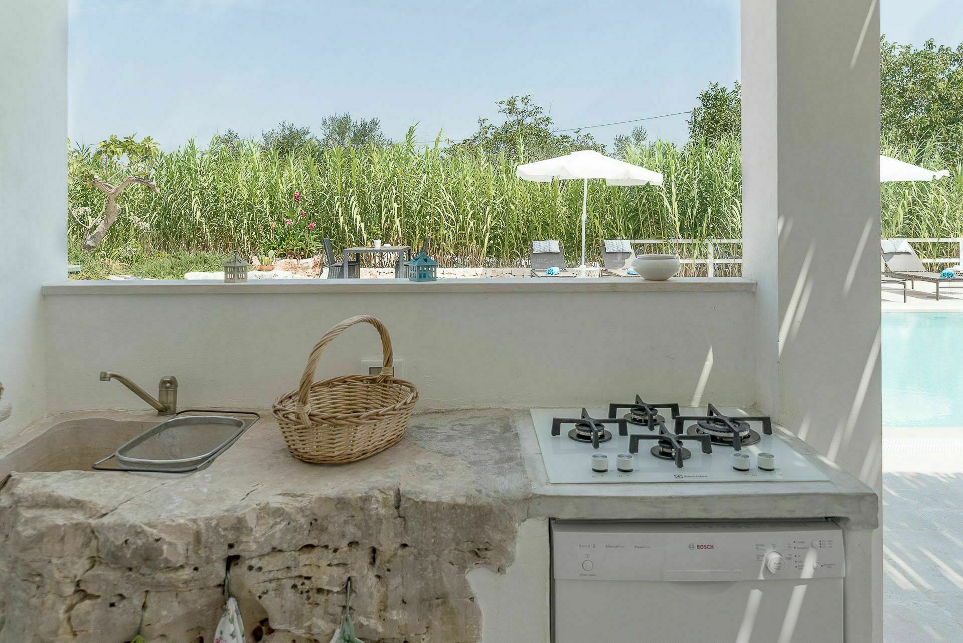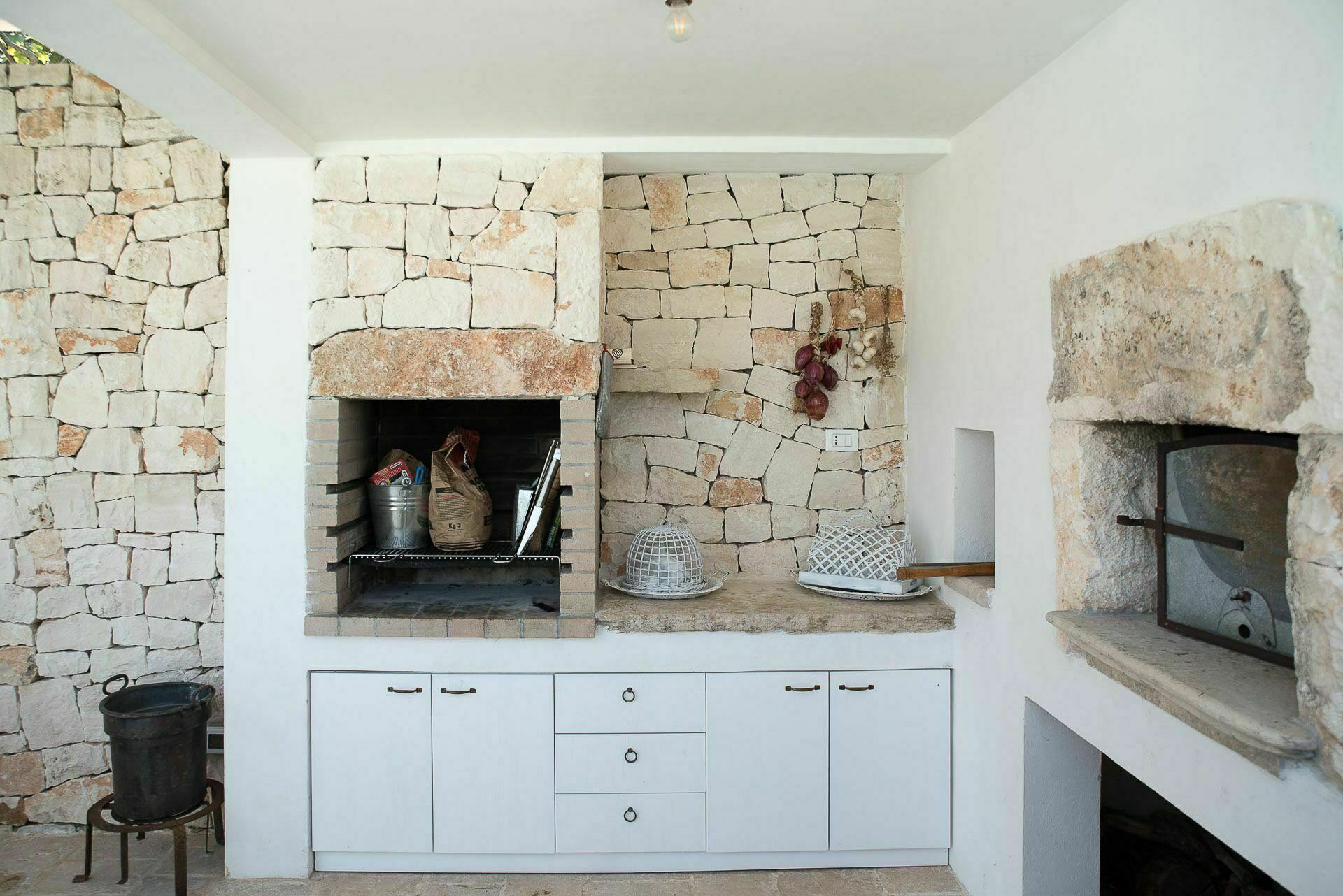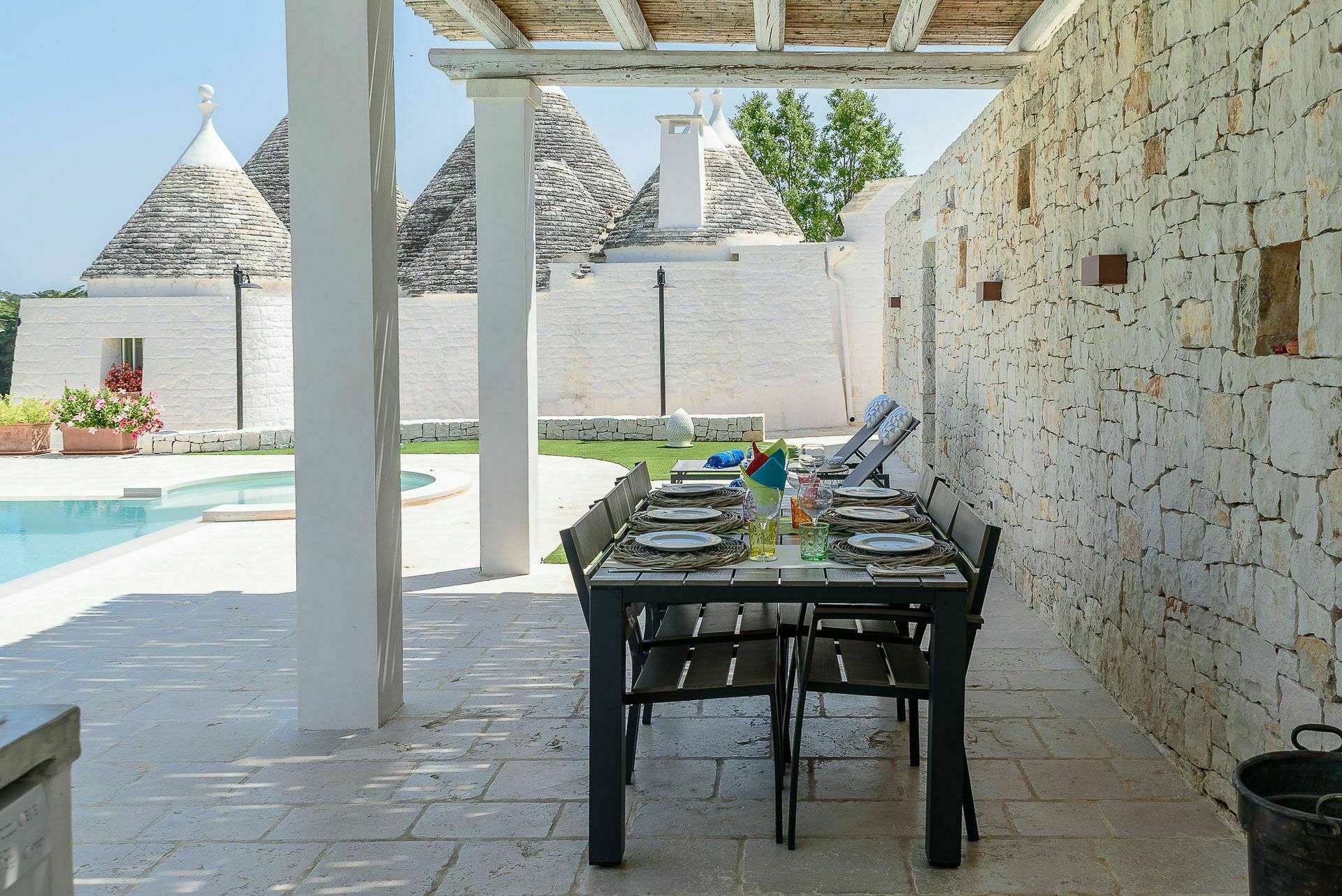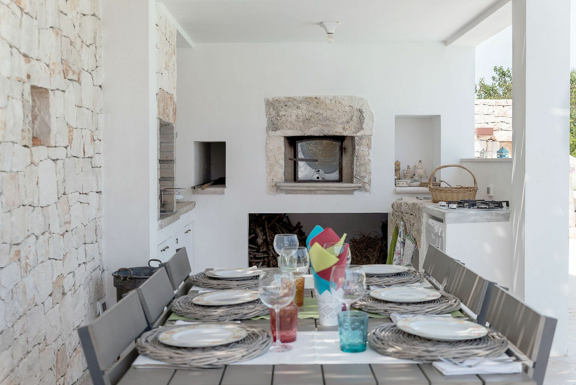Trulloutleien har også en stor overdækket veranda nær poolen med et udendørs køkken med opvaskemaskine, brændeovn, grill og spiseplads. Nær verandaen er der et loungeområde med stensæder.