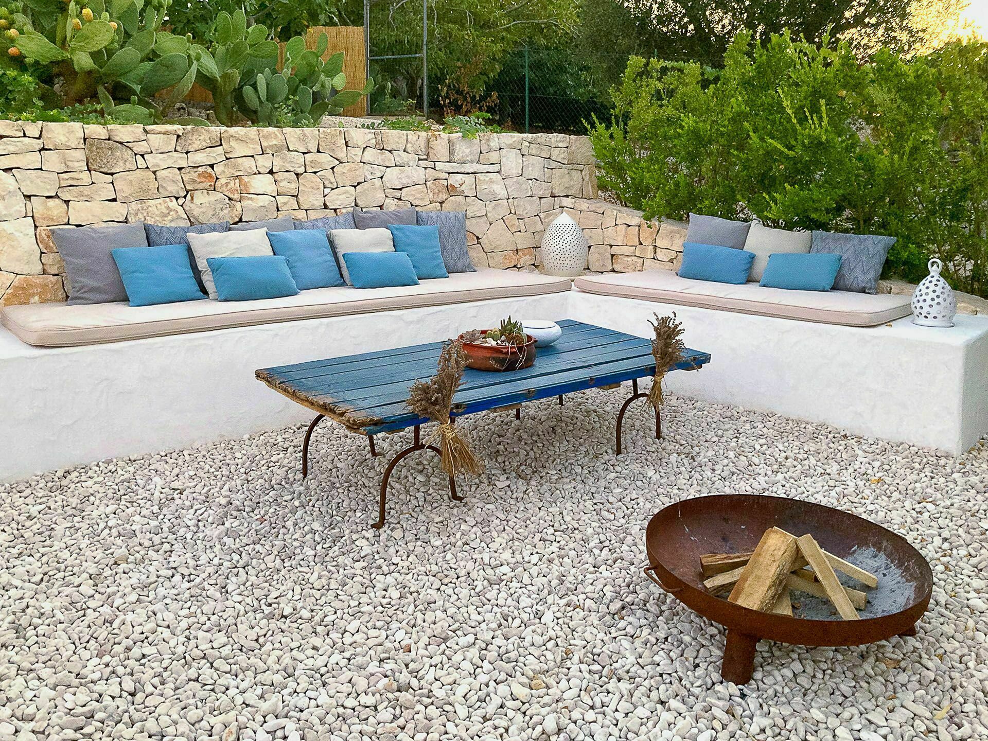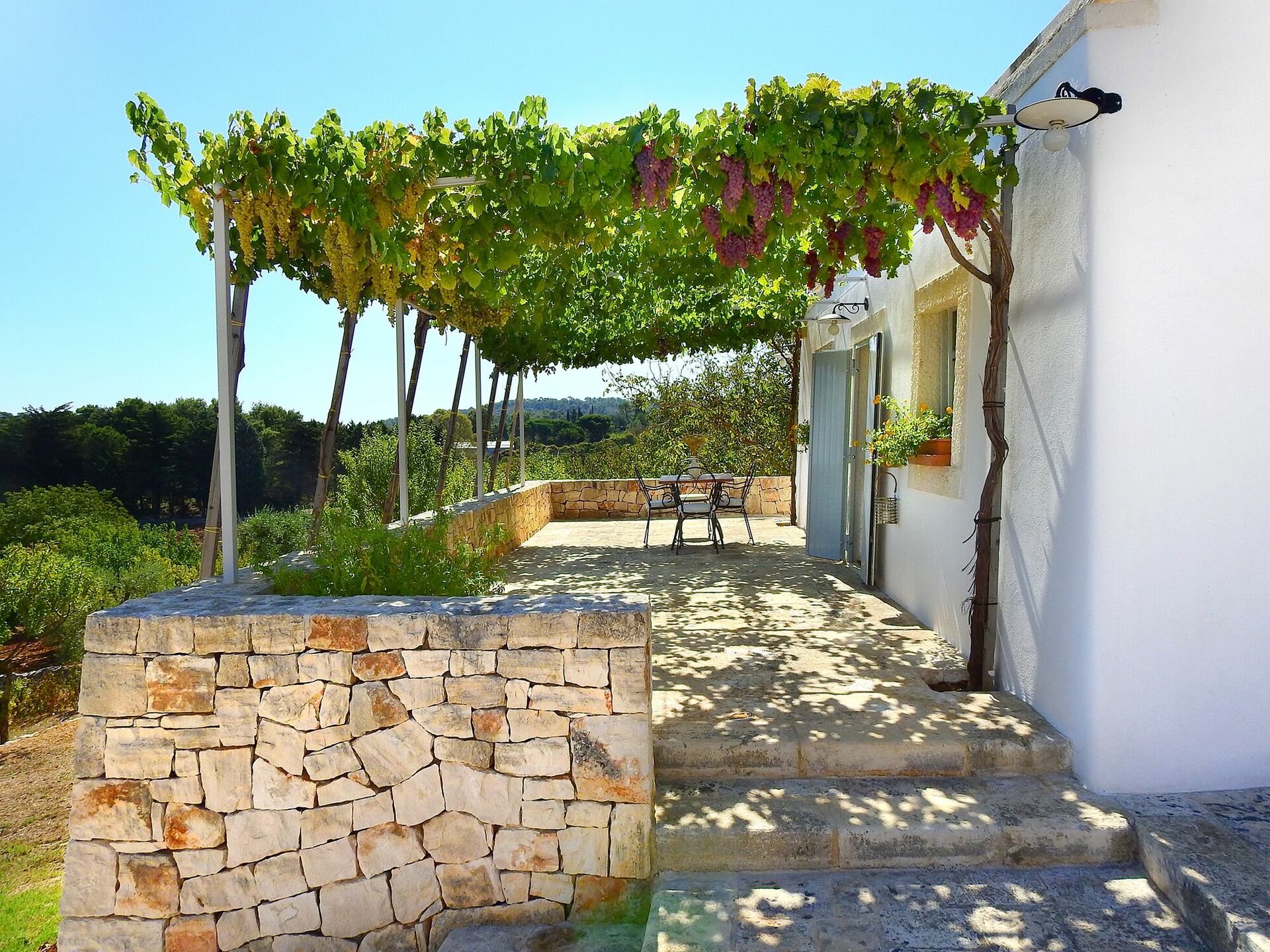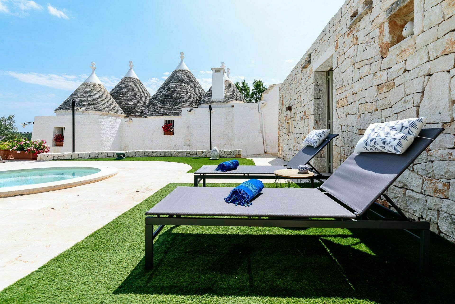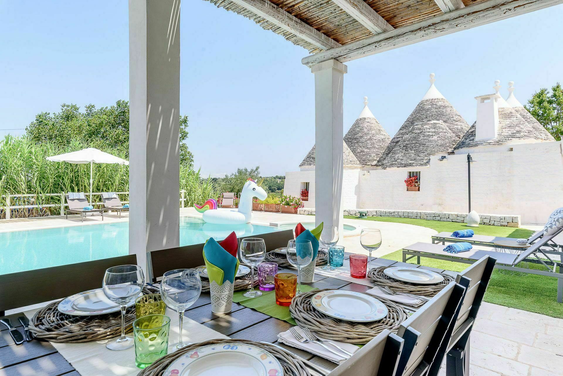 Trulloutleien har også en stor overdækket veranda nær poolen med et udendørs køkken med opvaskemaskine, brændeovn, grill og spiseplads. Nær verandaen er der et loungeområde med stensæder.