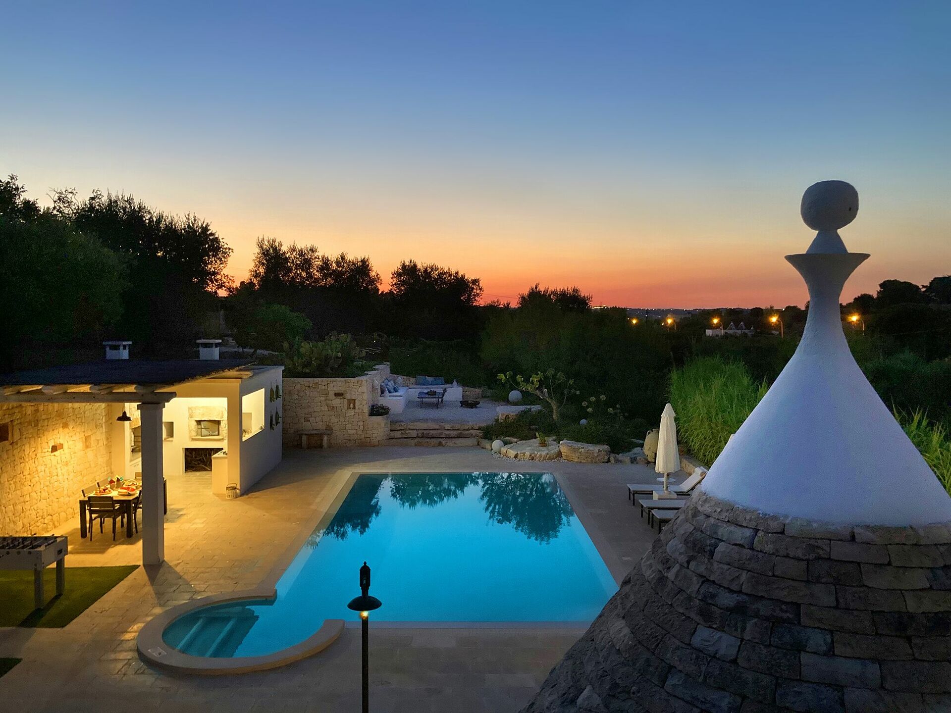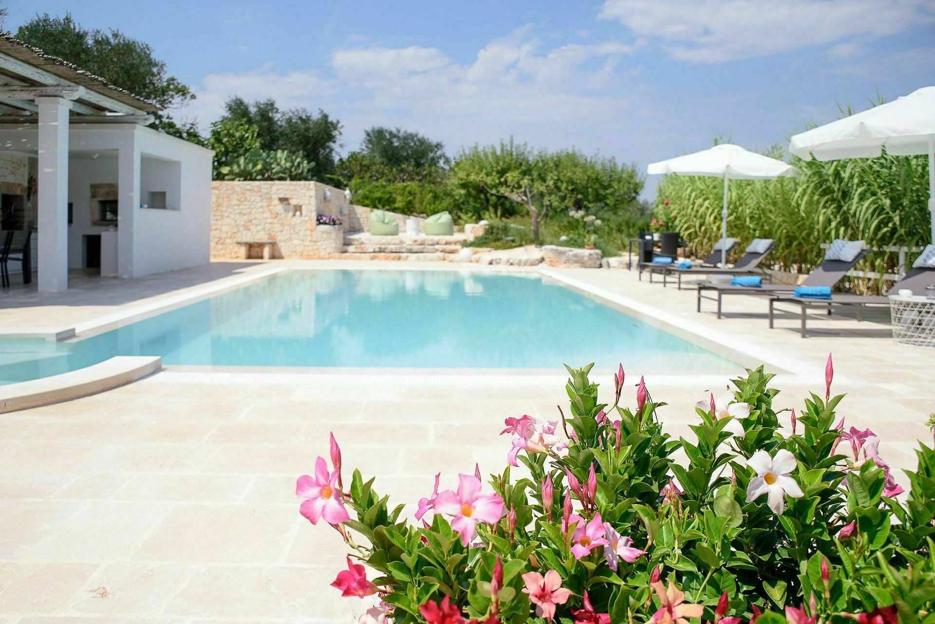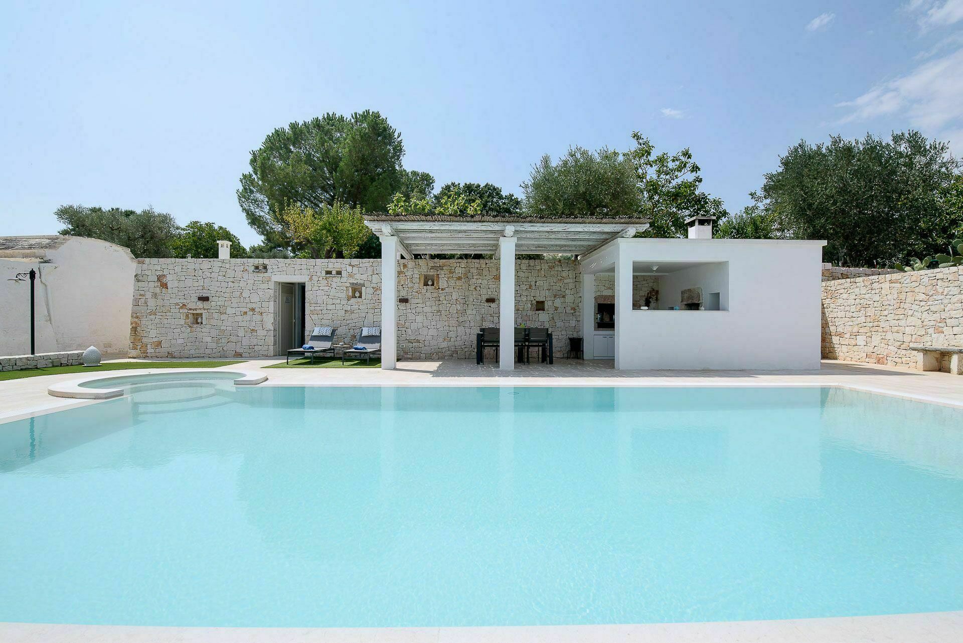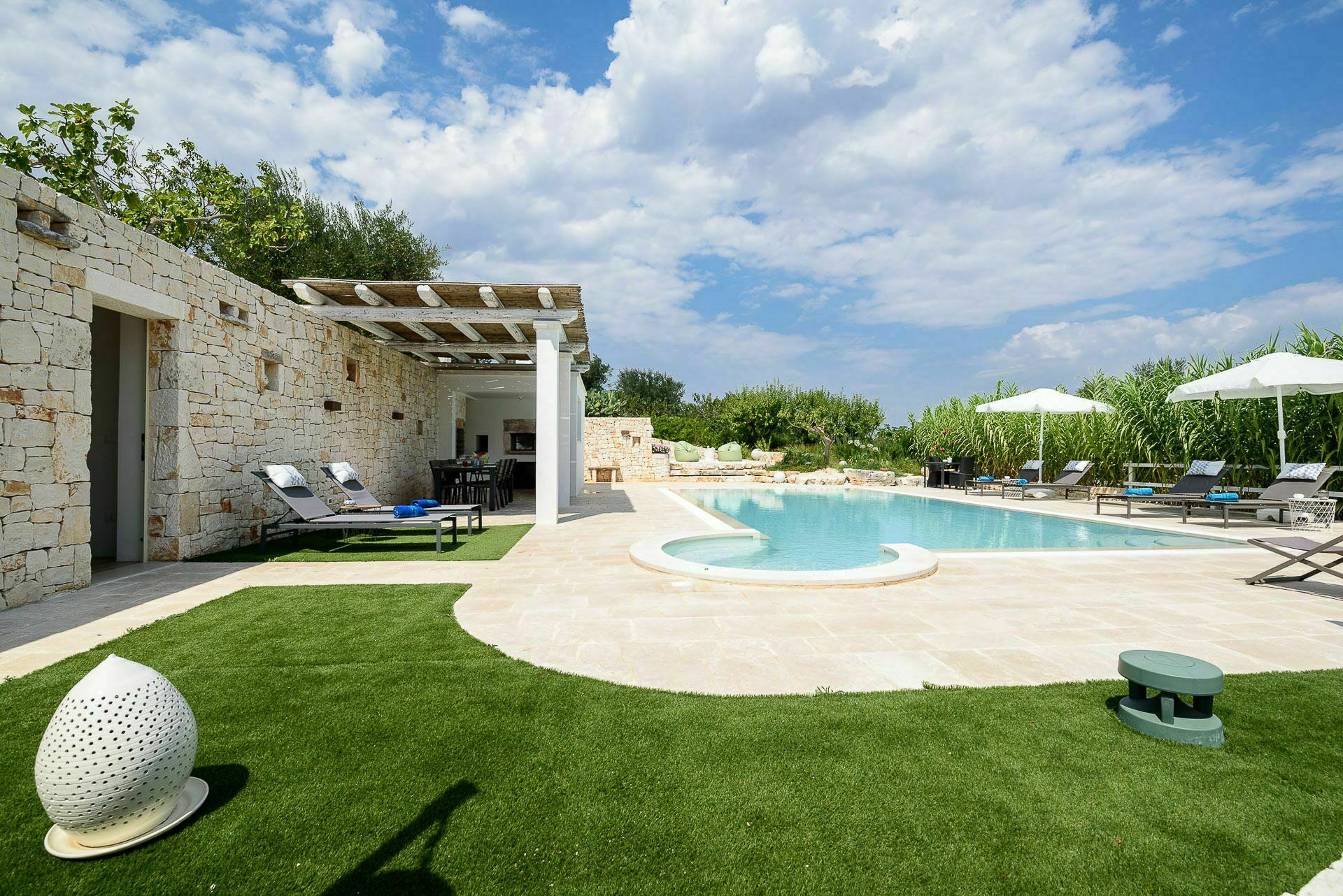 En stor velholdt have omgiver ejendommen. Bag feriehuset er der en spektakulær saltvandspool flankeret af en elegant grøn græsplæne. Poolen har romerske trapper for nem adgang og et område med afslappende massagestråler. Her er det perfekt at nyde solen og freden i det apuliske landskab fra liggestolene ved poolen.