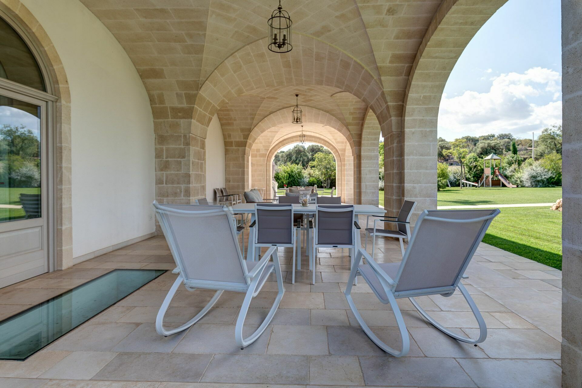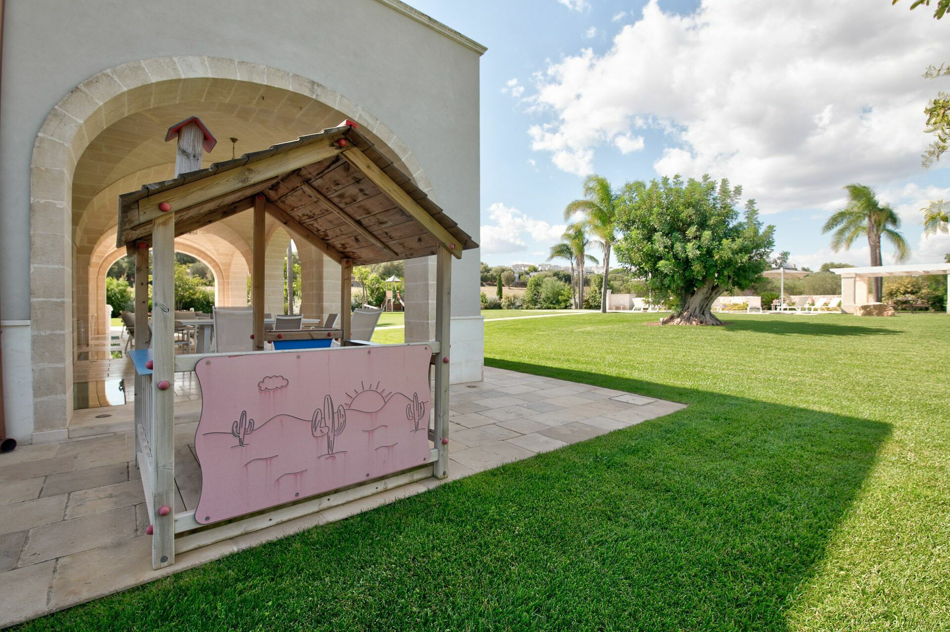 Ved poolen er der en moderne pavillon med spisebord. En rummelig veranda med udsigt over poolen, en anden spiseplads og et område til afslapning strækker sig langs hele villaens side. Udendørs er der også en lille legeplads til børn tæt på poolen.