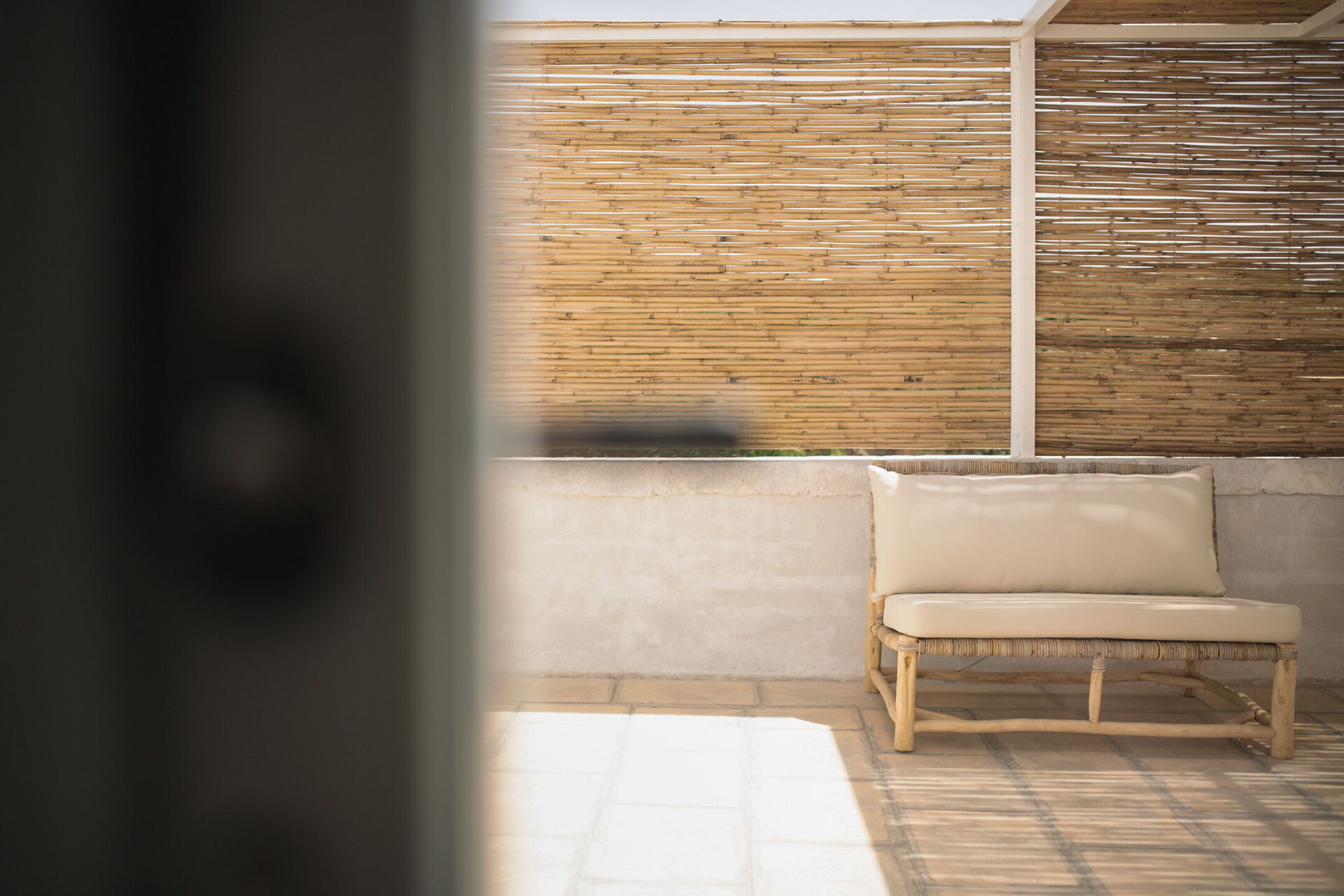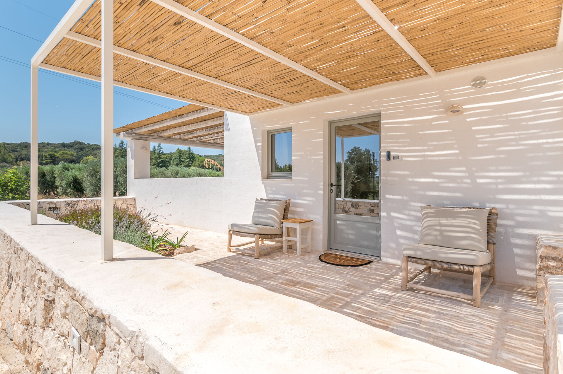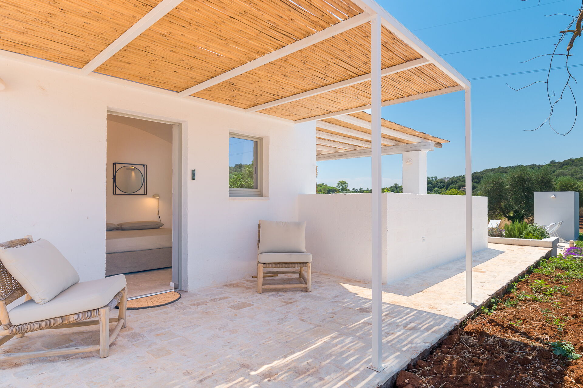 Alle soveværelser har direkte udgang til en terrasse med bord og lænestol.