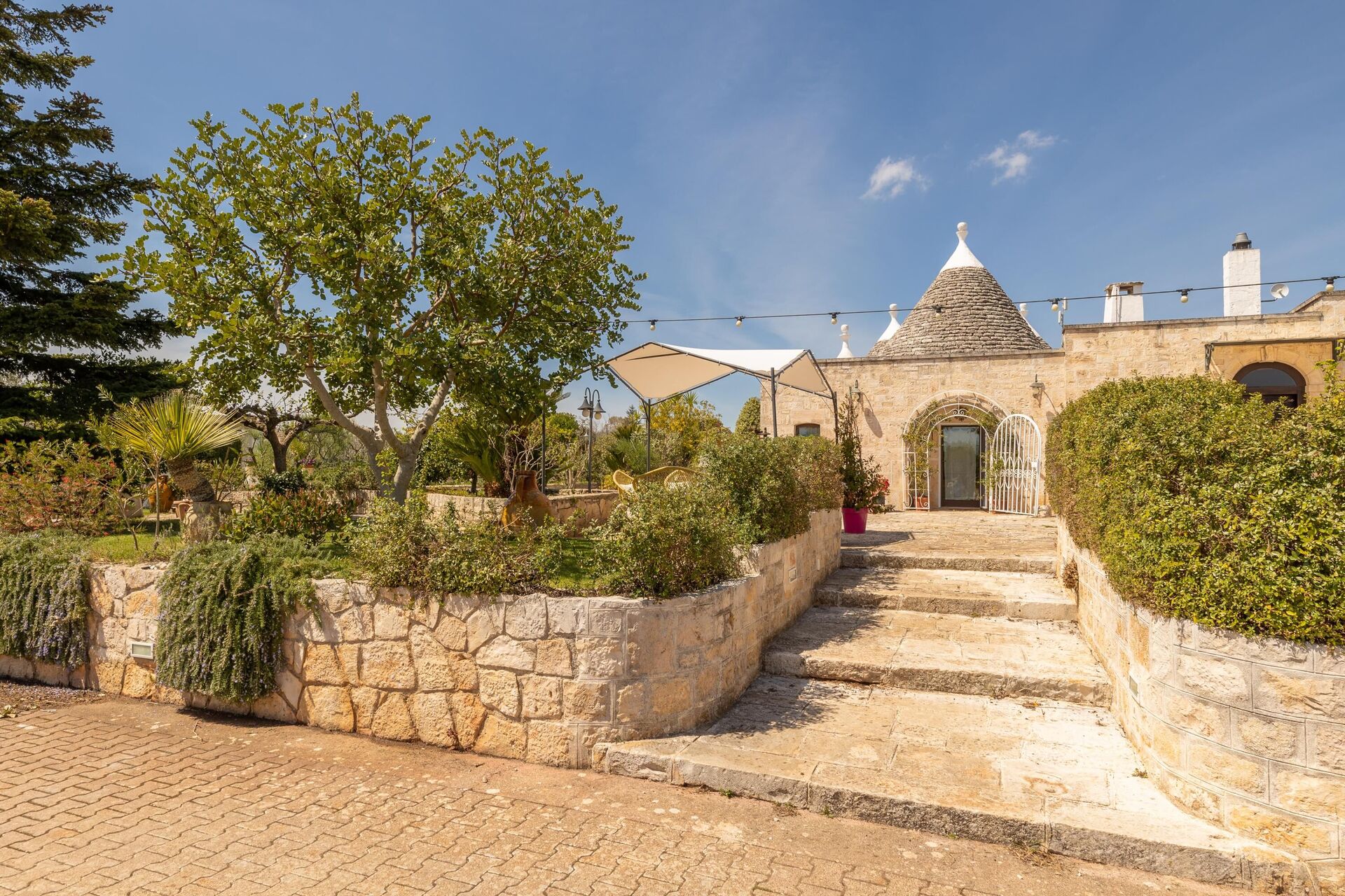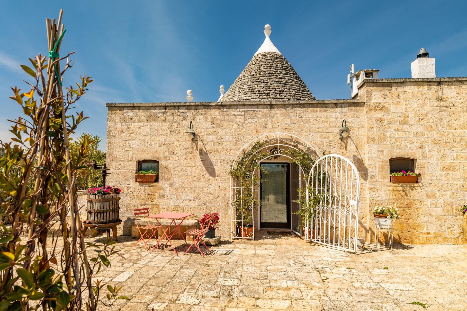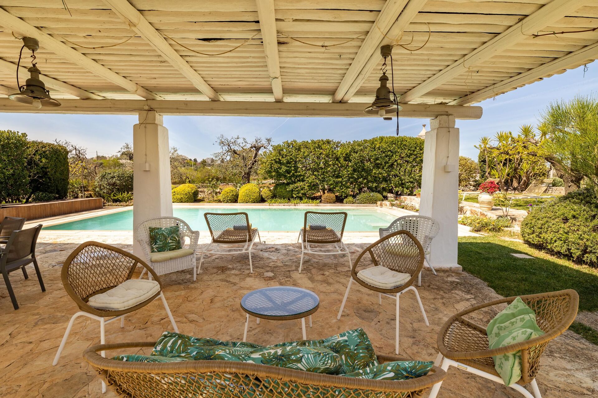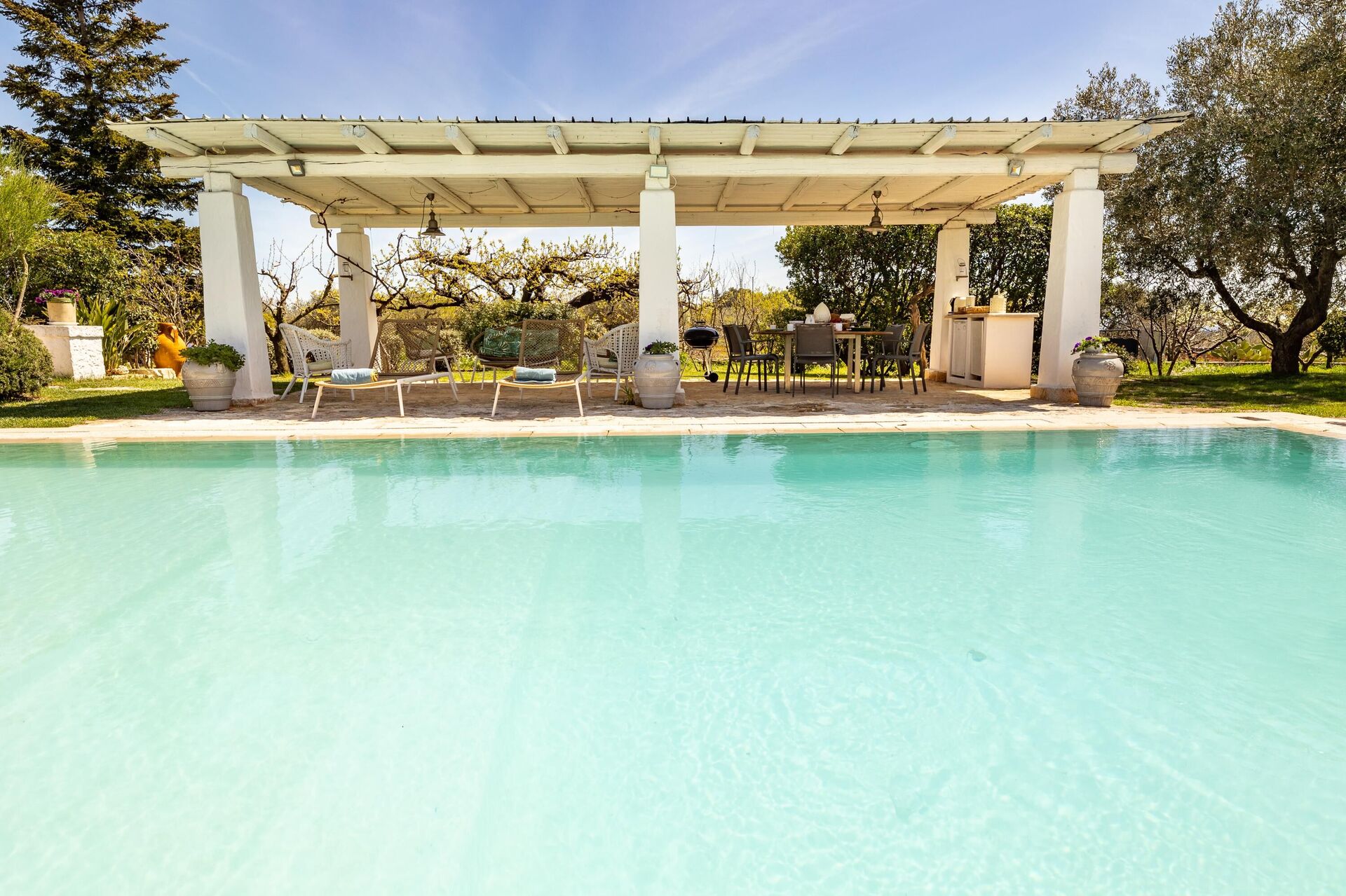 Trulloen er enkelt indrettet i ægte tradition for trulloens historie. Trulloen ligger i en 1000 m2 stor have med træer og middelhavsvegetation, den private pool er elegant og forbinder til trulloen med en charmerende brostensbelagt sti. Ved poolen er der en stor pergola med stole, perfekt til at slappe af med en bog i skyggen. Foran huset er der også en solsejl og stole til at slappe af i Salentos friske luft.
