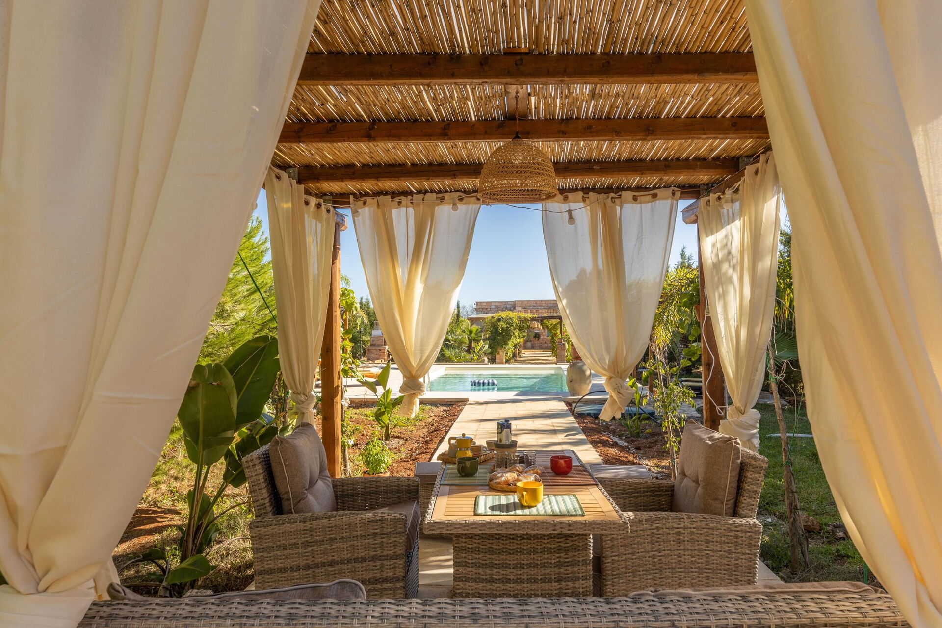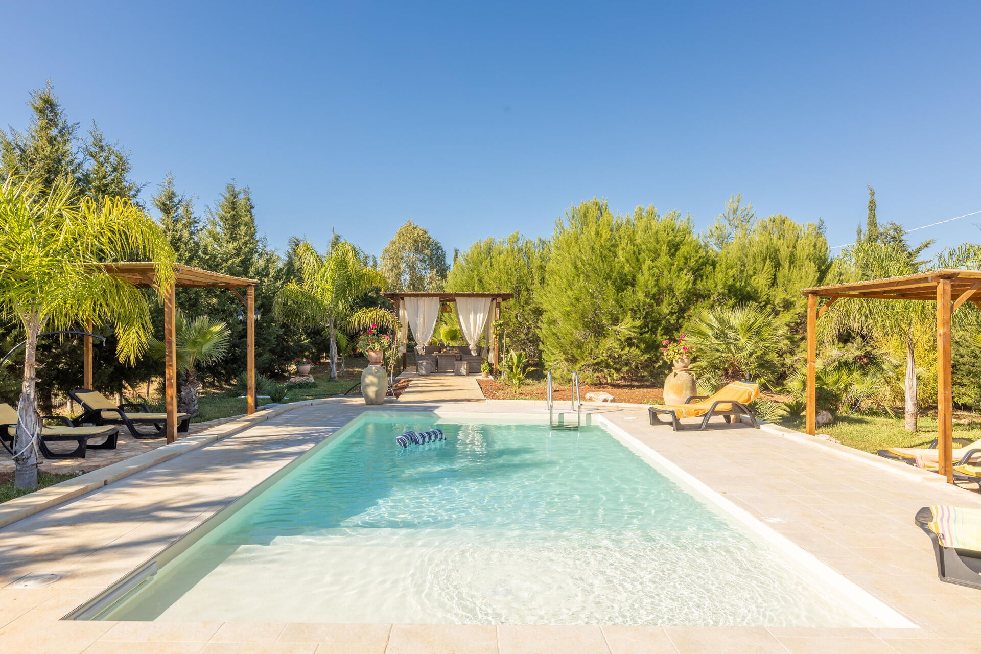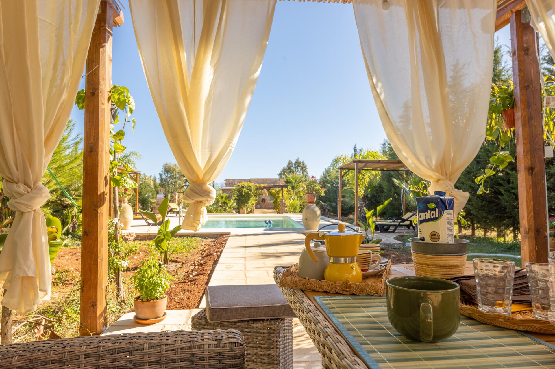 Huset er omgivet af en stor have med frodig vegetation bestående af træer og middelhavsplanter. Her finder du en privat swimmingpool til gæsterne, en veranda med udendørs spiseplads og flere områder til afslapning.