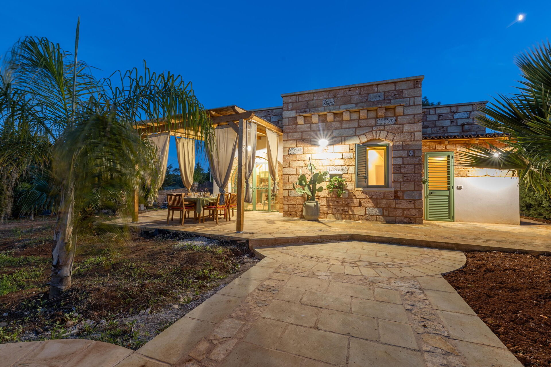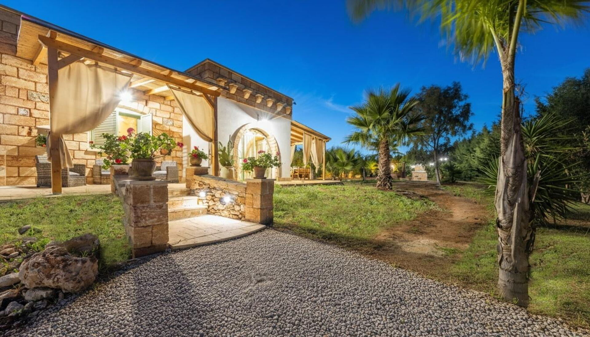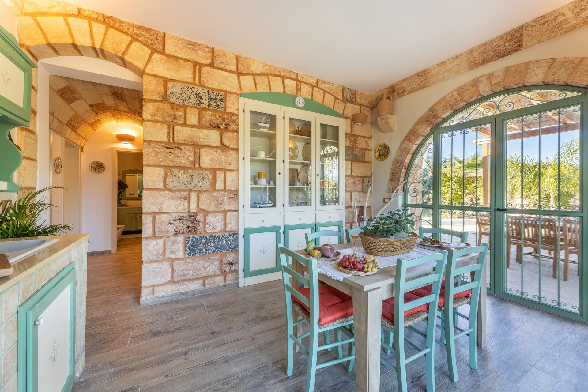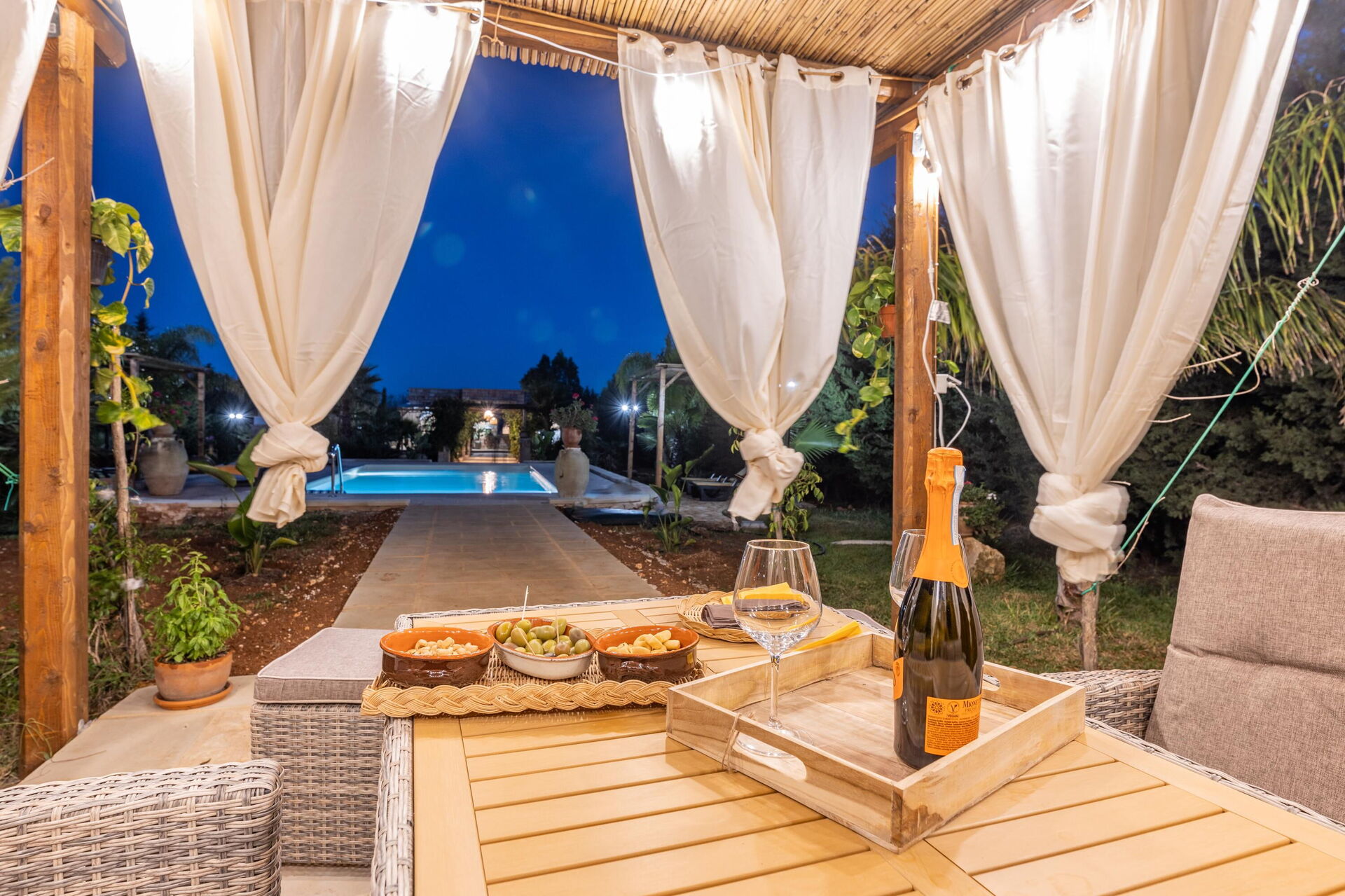 Huset er omgivet af en stor have med frodig vegetation bestående af træer og middelhavsplanter. Her finder du en privat swimmingpool til gæsterne, en veranda med udendørs spiseplads og flere områder til afslapning.