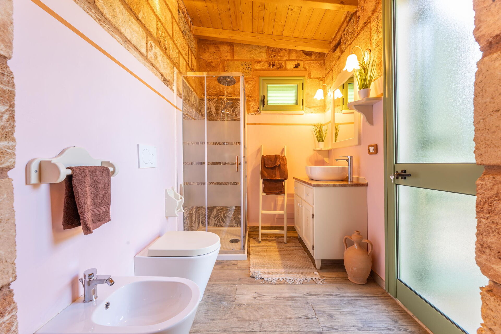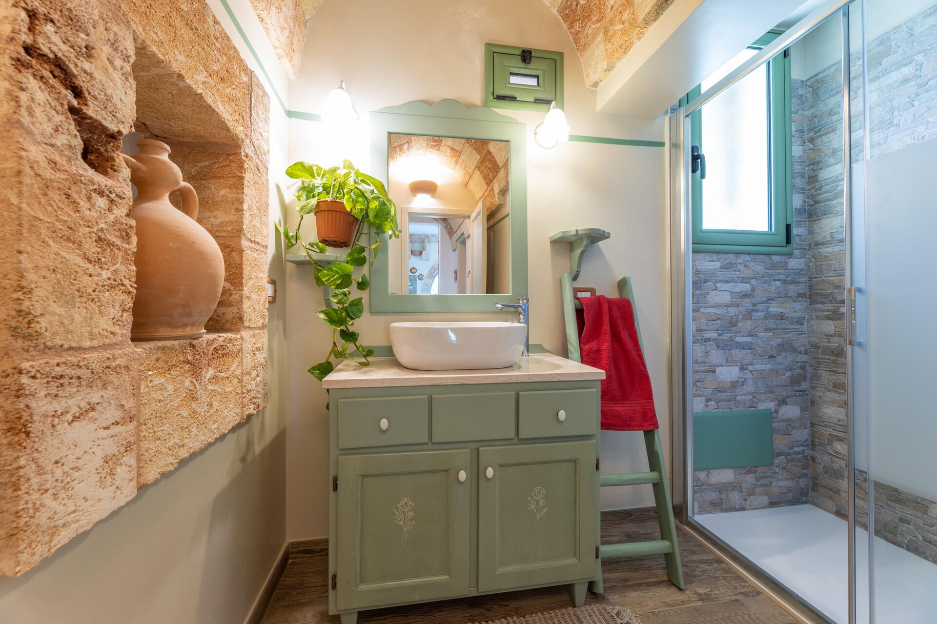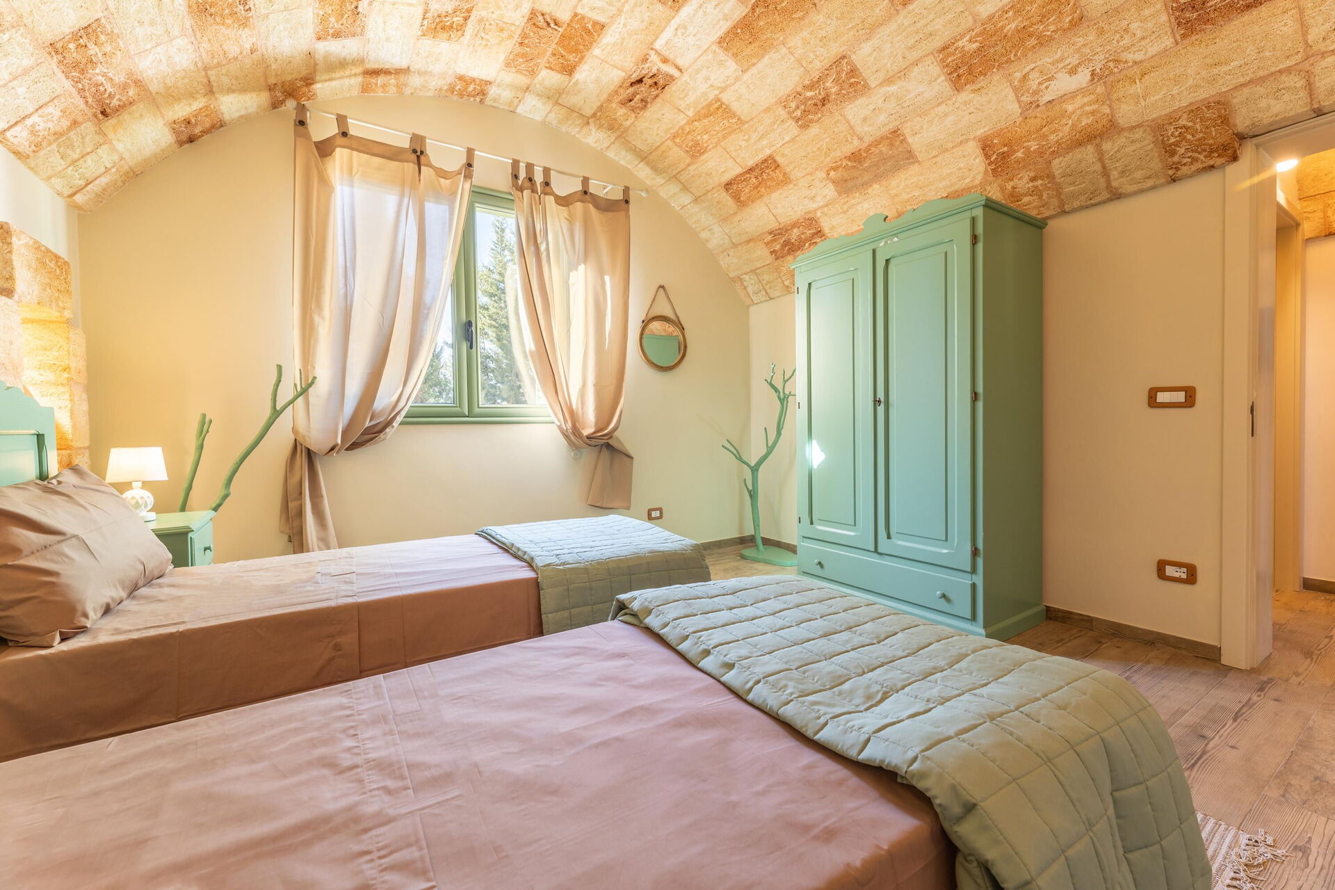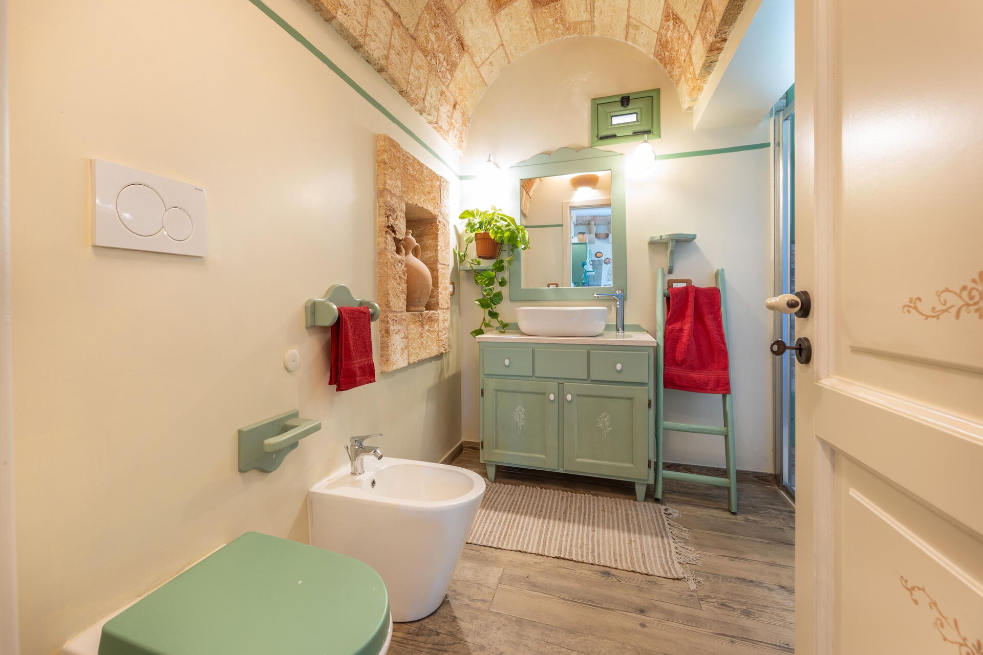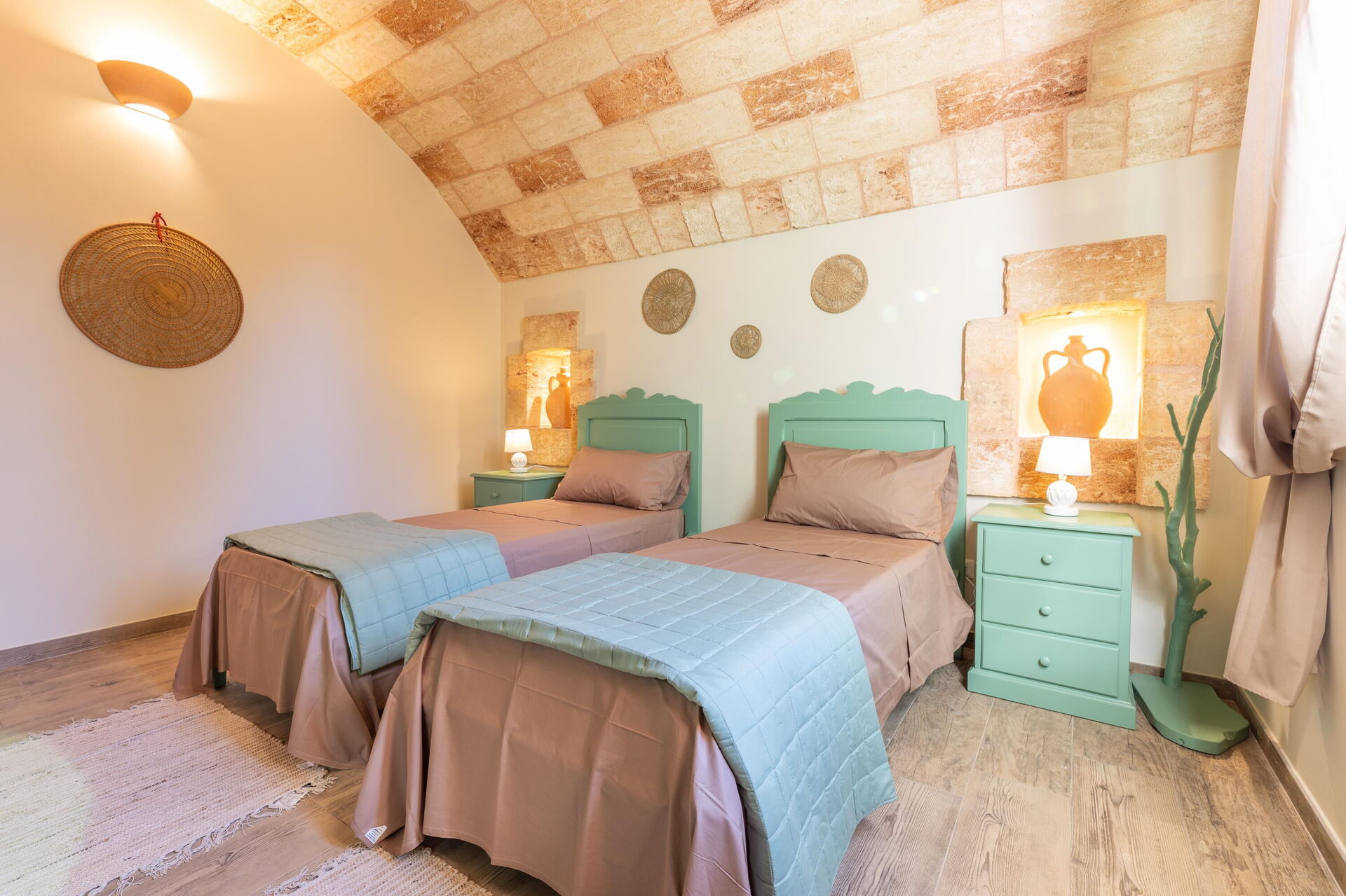 Feriehuset er smagfuldt indrettet og har hvælvede lofter samt synlige, traditionelle tufsten i flere af rummene.
