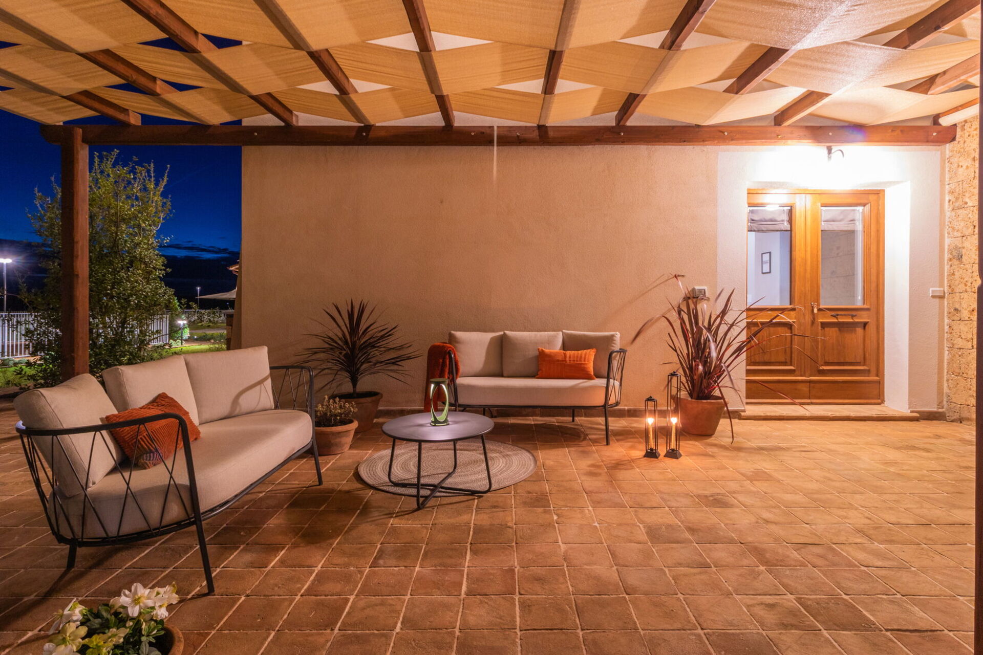 - naturskøn veranda med træpergola, solafskærmning og udendørs spiseplads