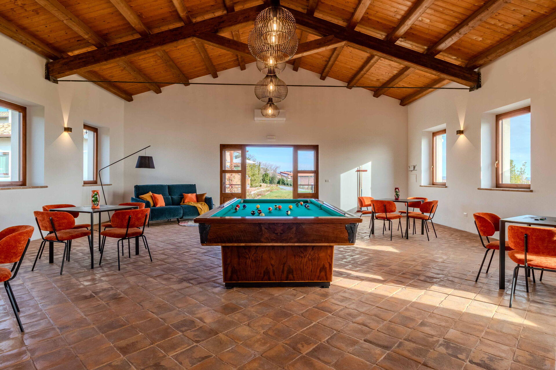 Stueetage: (tilgængelig fra haven over poolen og ikke indvendigt forbundet med de øvrige enheder): opholdsstue (aircondition) med små sofaer og lænestole, billardbord, bordfodbold og stor vægprojektor.