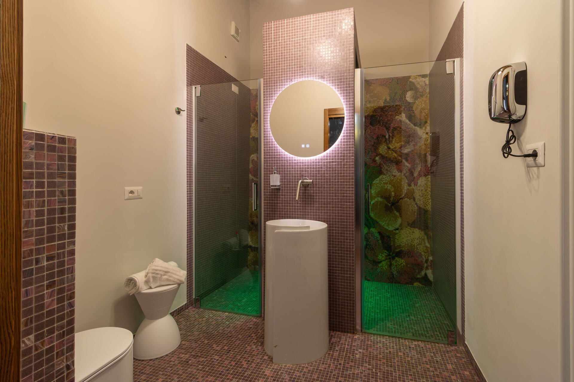Stueetage (tilgængelig fra haven over poolen og ikke indvendigt forbundet med de øvrige enheder): fitnessrum med træningsudstyr, WC og multisensoriske brusere.