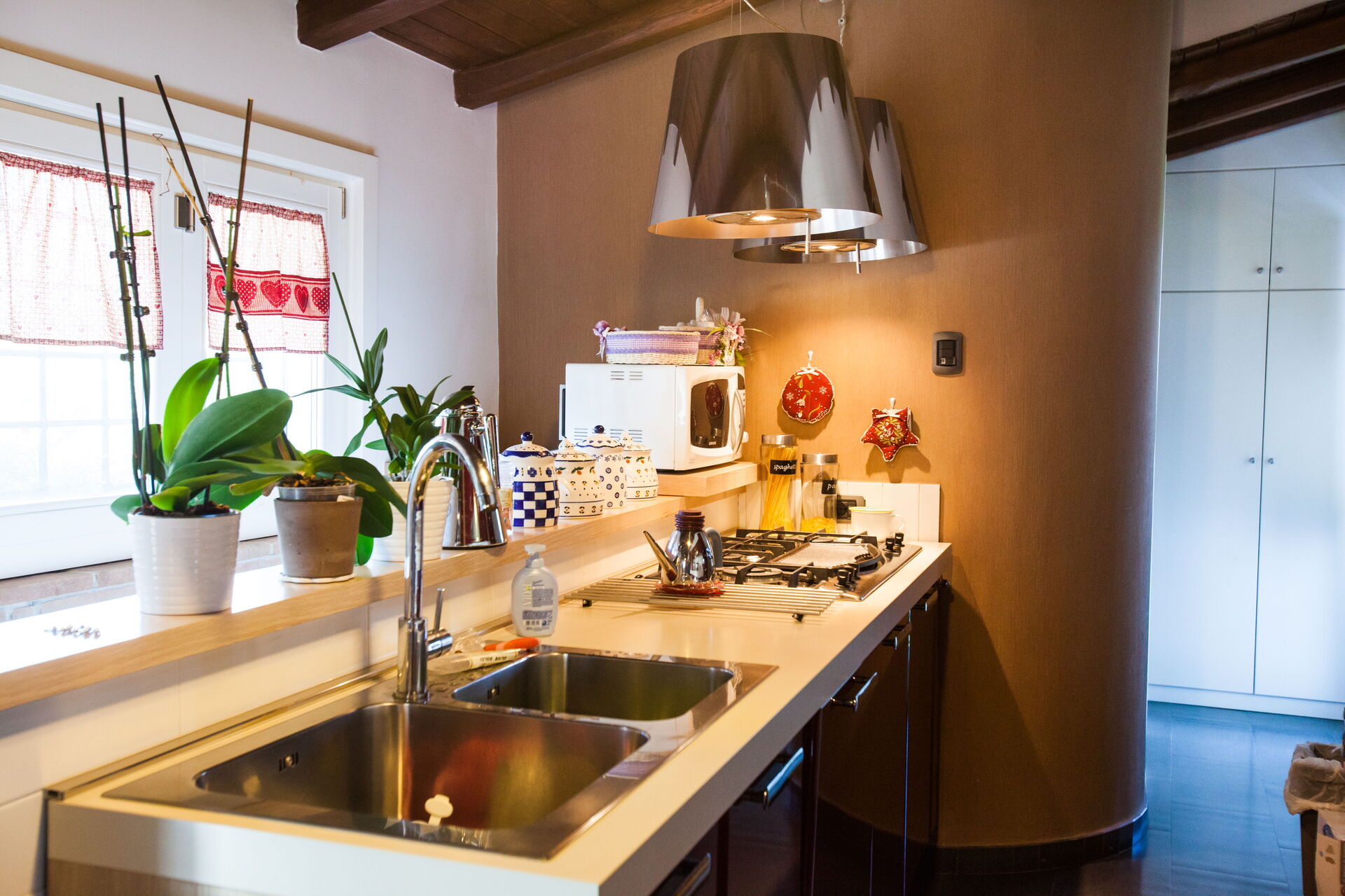 Spisestue med køkken (kogeplader, ovn, køleskab, fryser, opvaskemaskine, mikroovn, brødrister, espressomaskine) og udgang til haven, badeværelse med bruser.