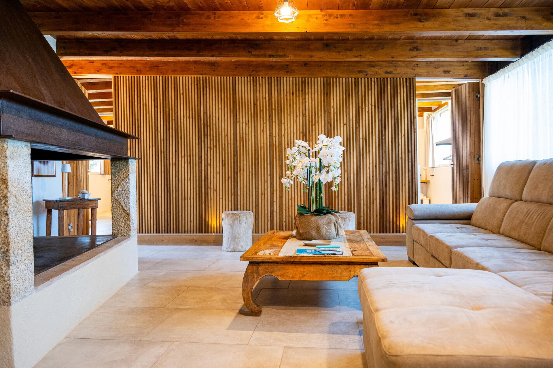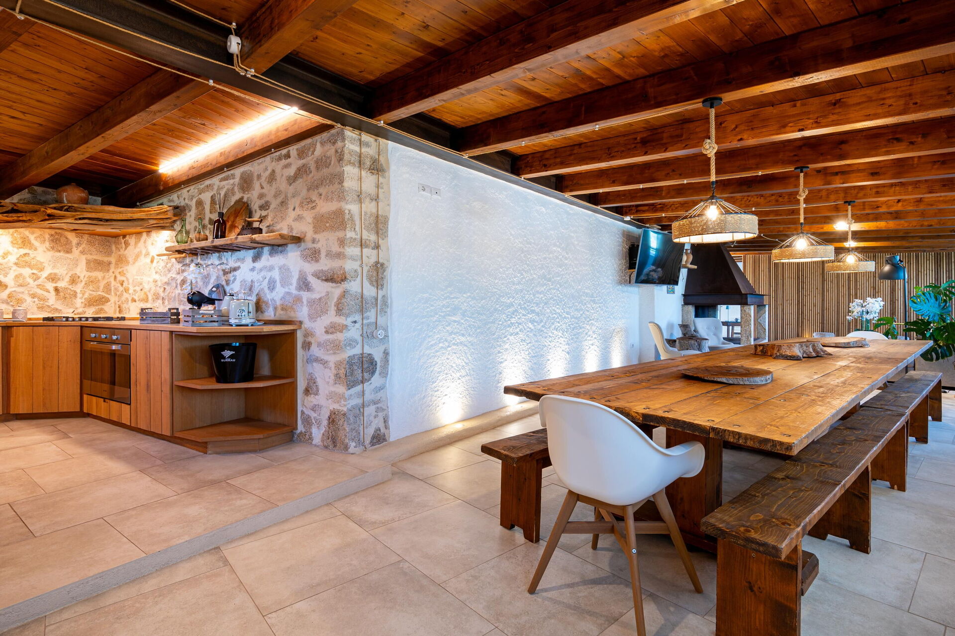 Stueetage: opholdsstue med pejs og spiseområde, køkken (kogeplade, ovn, køleskab, fryser, opvaskemaskine, mikrobølgeovn, espressomaskine), dobbeltværelse (aircondition) med privat badeværelse med bruser, dobbeltværelse (aircondition), 2 badeværelser med bruser.