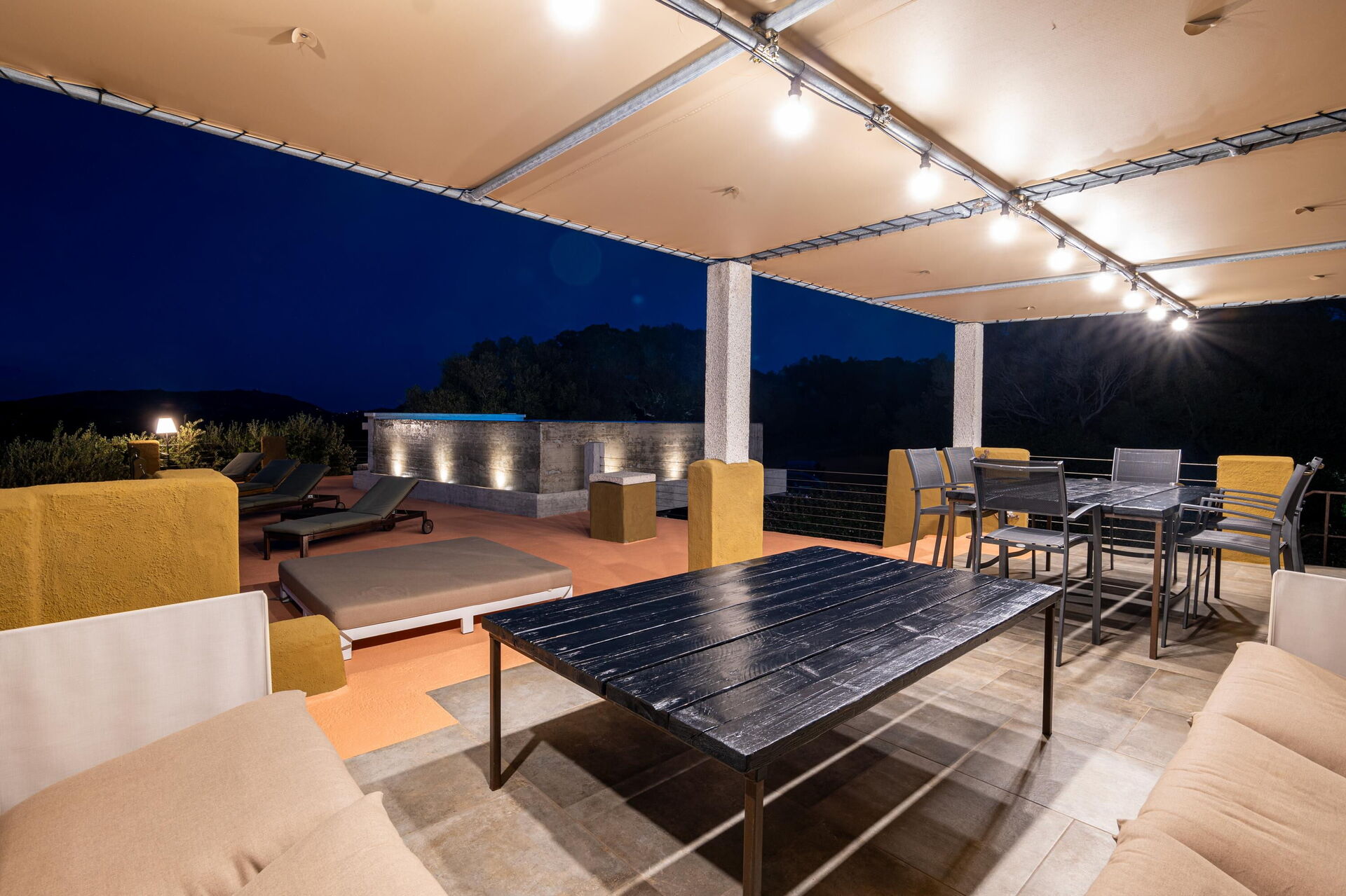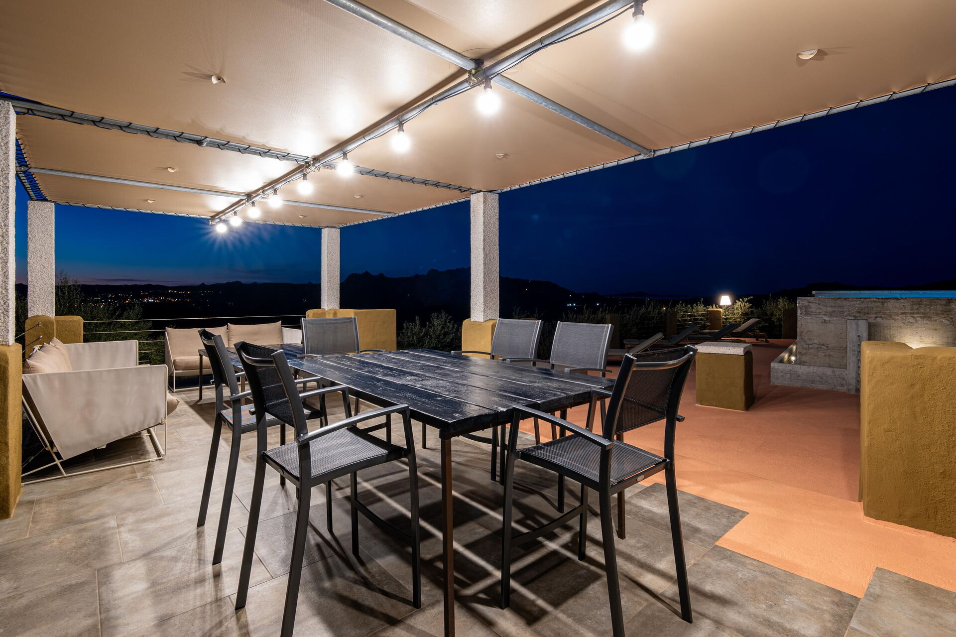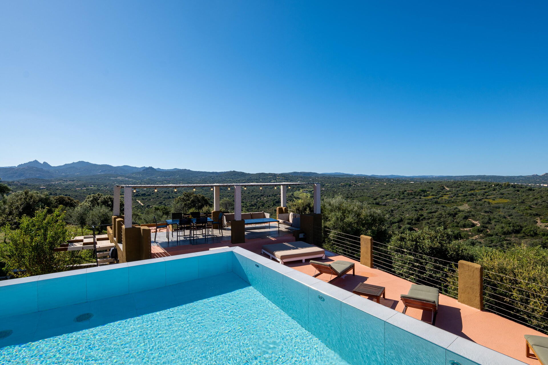 Første sal: (Kun tilgængelig udefra og ikke forbundet med resten af villaen indvendigt): terrasse-solområde med en pavillon møbleret med bord og stole til udendørs spisning, samt en privat pool med panoramaudsigt.