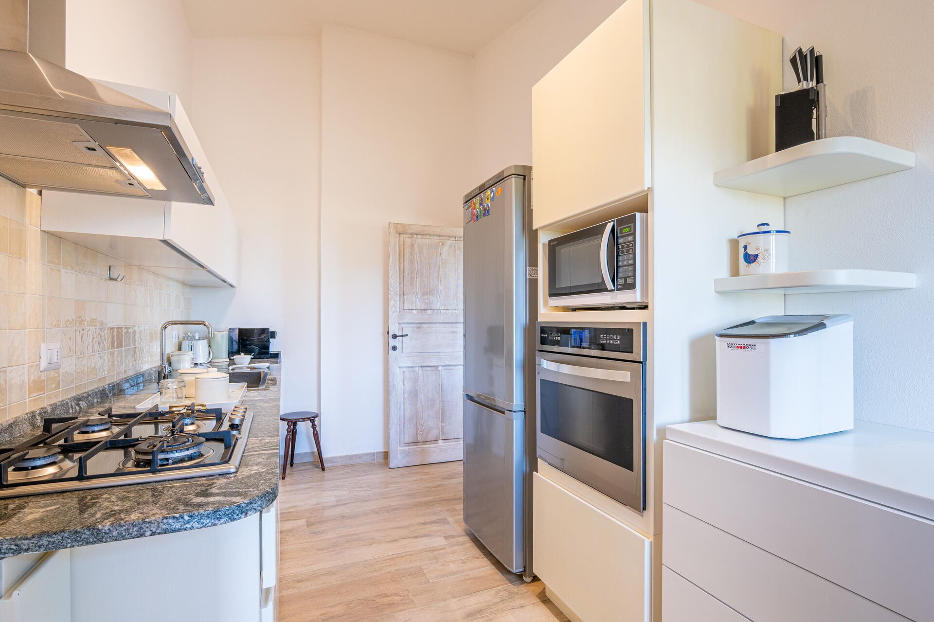 Stueetage: lys opholdsstue (satellit-tv) med spiseområde, køkken (kogeplade, ovn, køleskab, fryser, opvaskemaskine, mikrobølgeovn, espressomaskine) med adgang til terrasse med udendørs spiseplads og panoramaudsigt over havet; dobbeltværelse, dobbeltværelse (sengen kan opdeles i 2 enkeltsenge efter anmodning), badeværelse med bruser, soveværelse med fransk seng (140 cm x 190 cm), badeværelse med bruser og vaskemaskine.