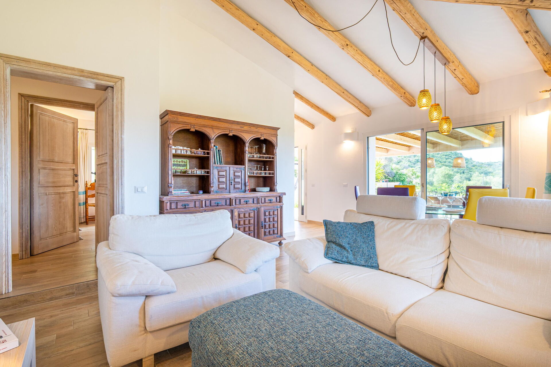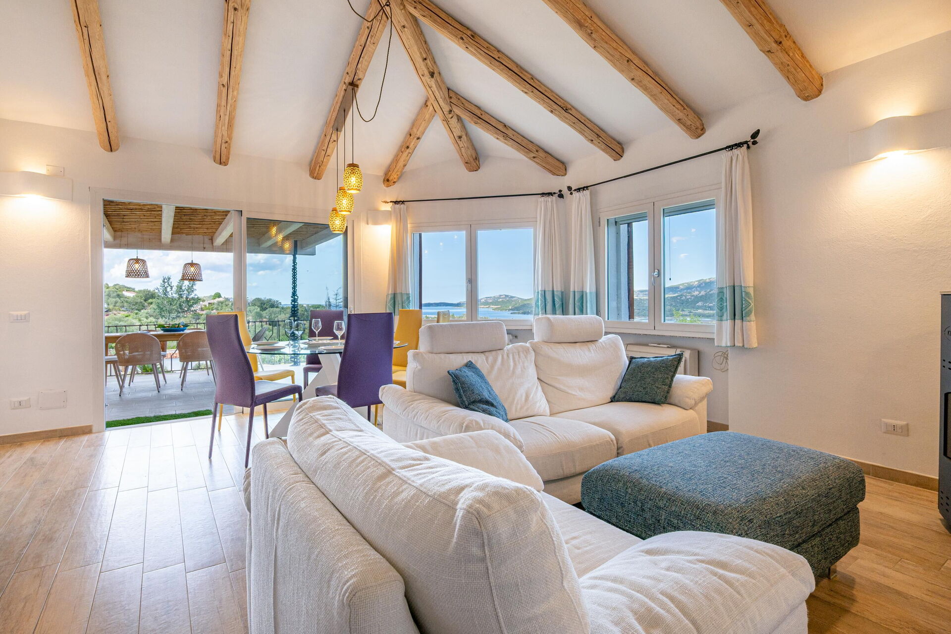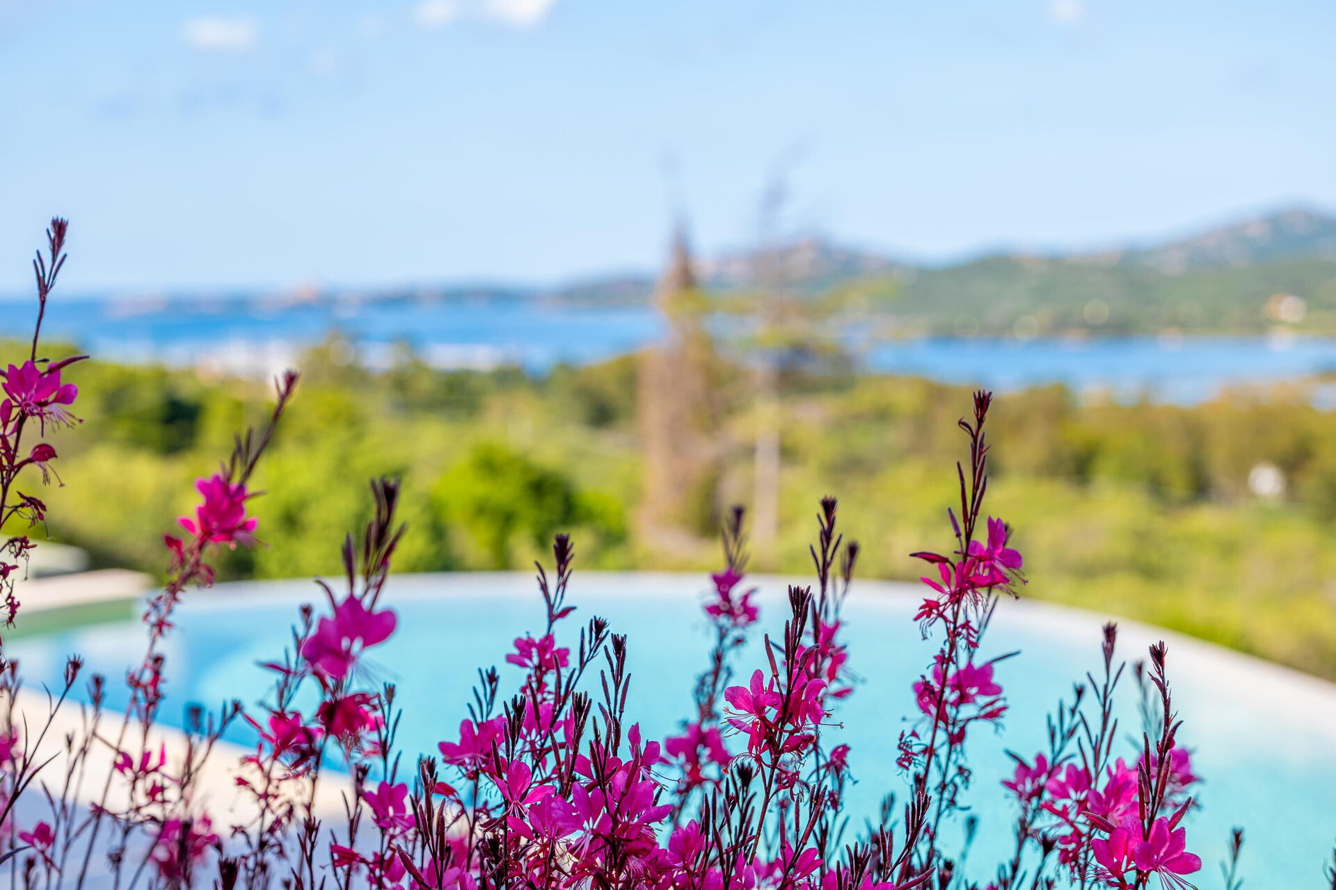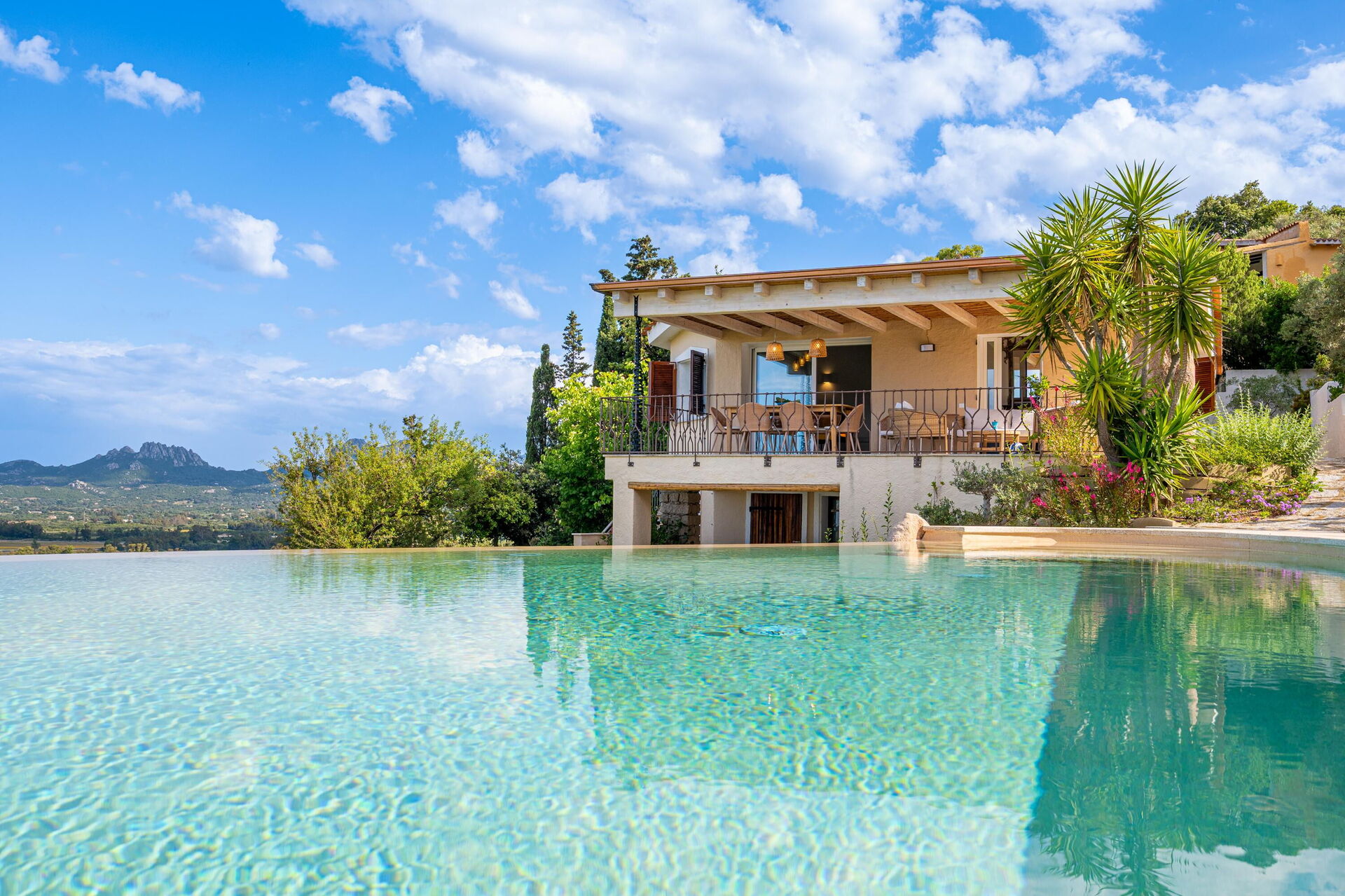 Udendørs findes der mange naturskønne områder, hvor du kan slappe af sammen med familie eller venner – fra terrassen med spisebord og stole til det store poolområde med havudsigt, perfekt til uforglemmelige øjeblikke i solen på Sardinien.