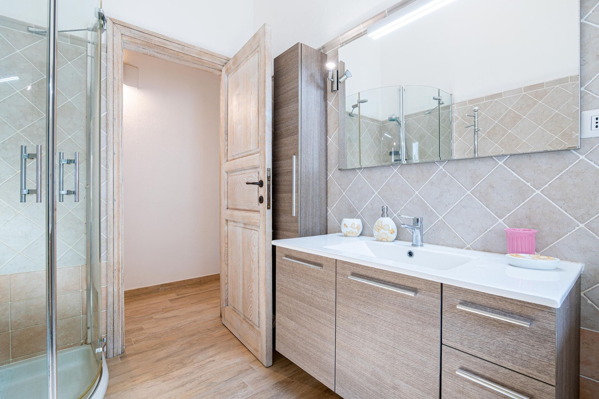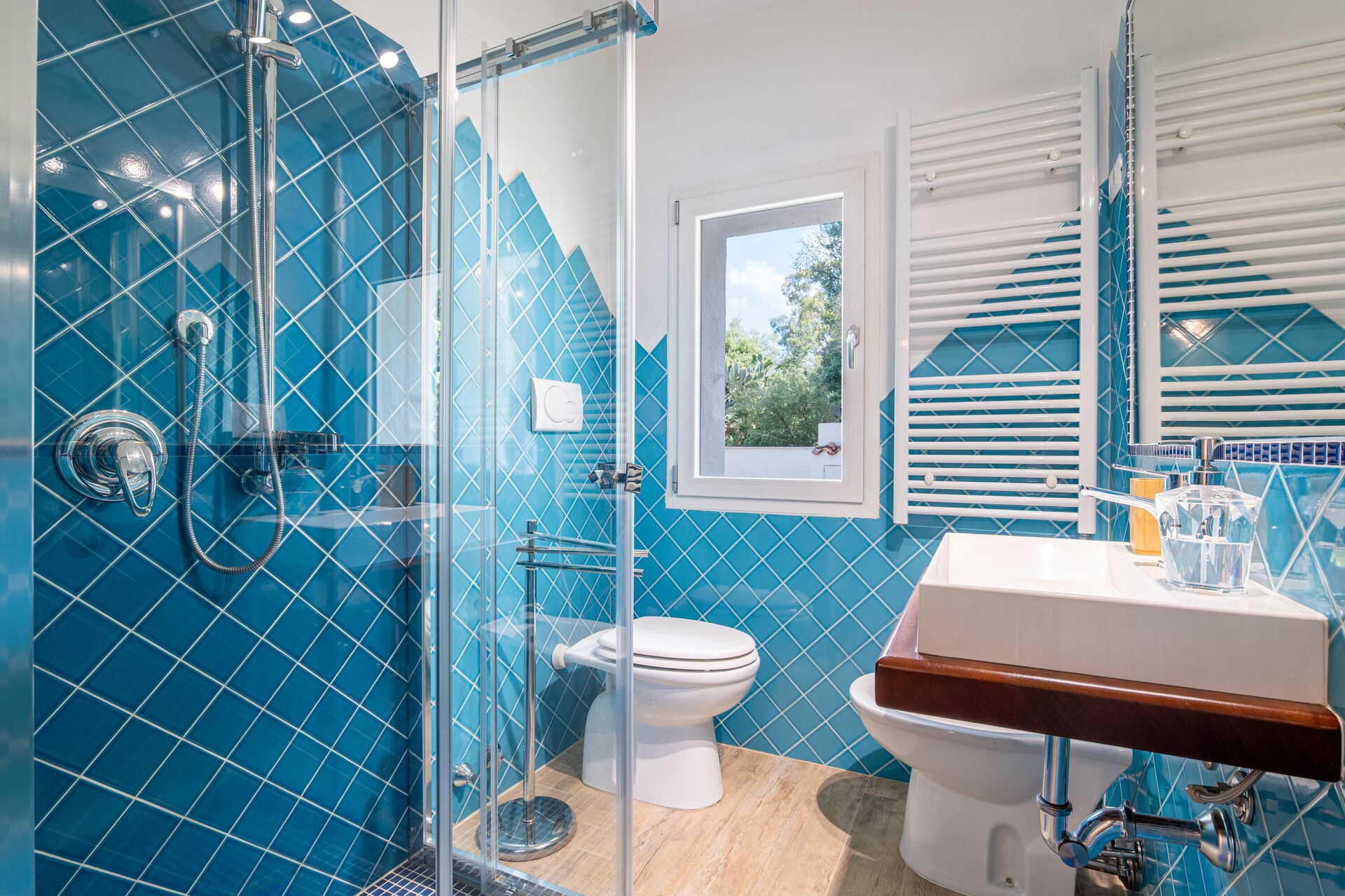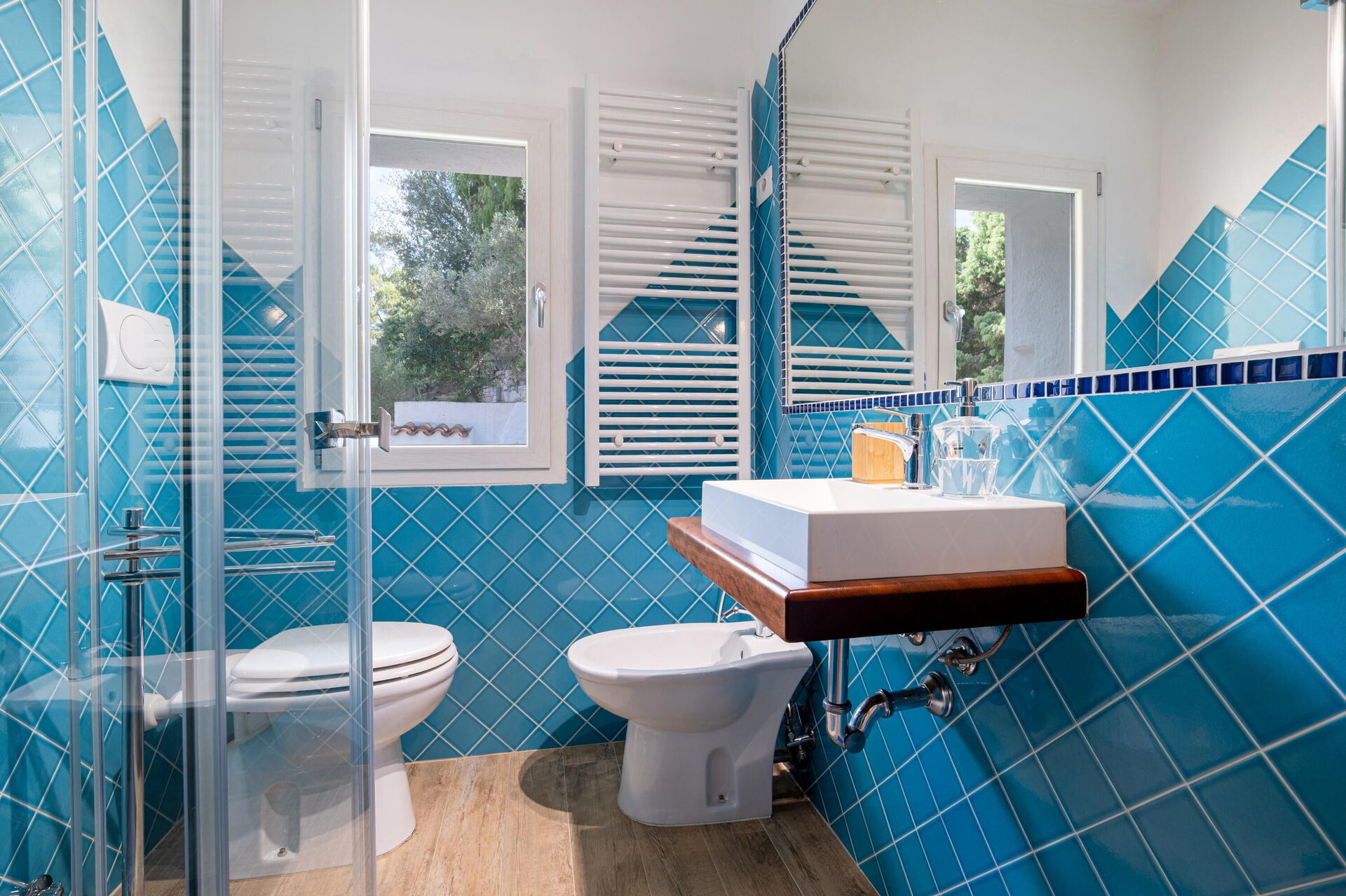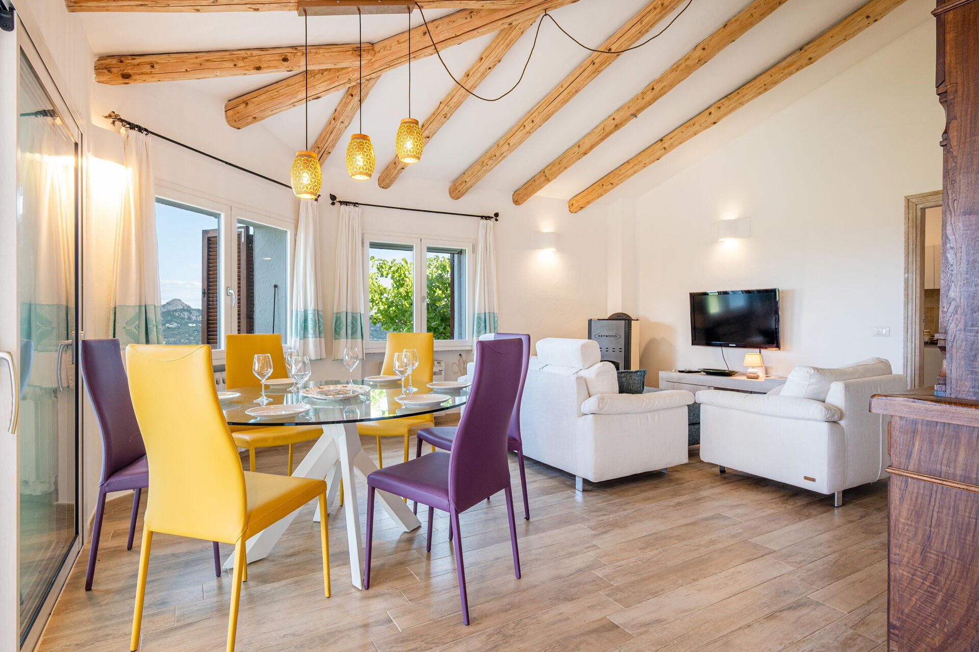 Udendørs findes der mange naturskønne områder, hvor du kan slappe af sammen med familie eller venner – fra terrassen med spisebord og stole til det store poolområde med havudsigt, perfekt til uforglemmelige øjeblikke i solen på Sardinien.