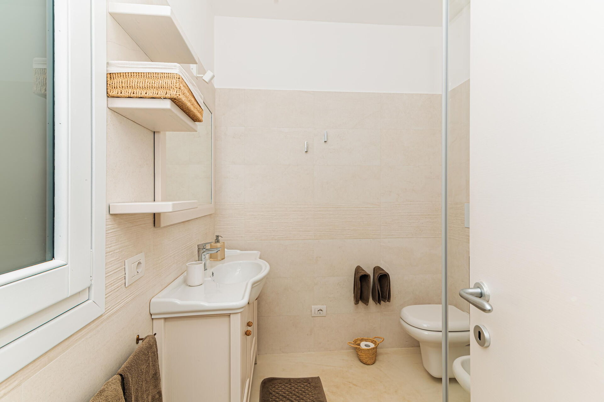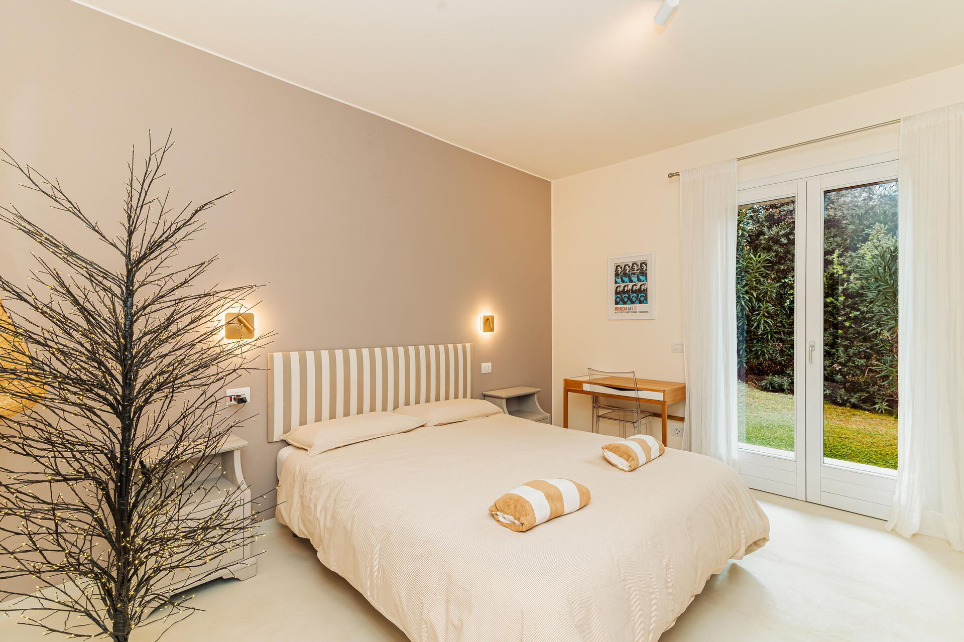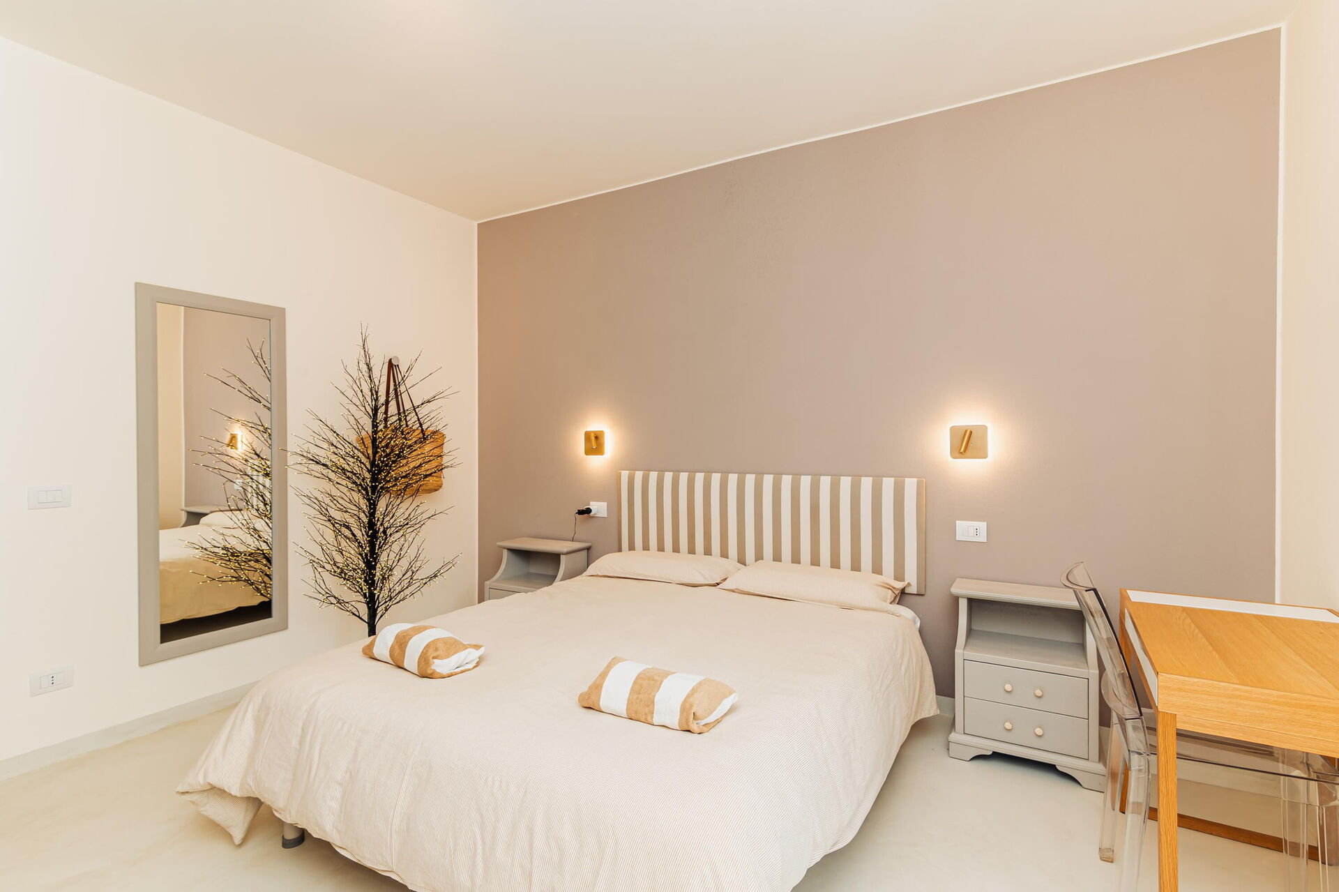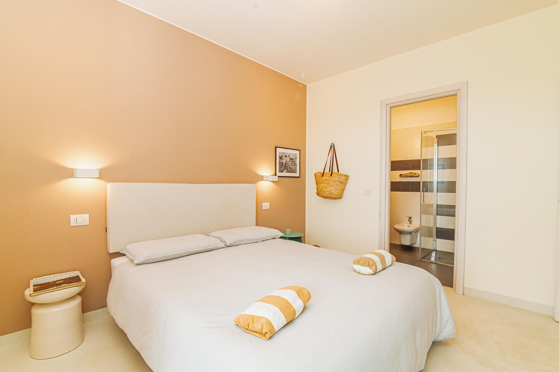 3 trin op: 3 dobbeltværelser (aircondition), hver med eget badeværelse med bruser (soveværelserne har også udgang til det fri), vaskerum.