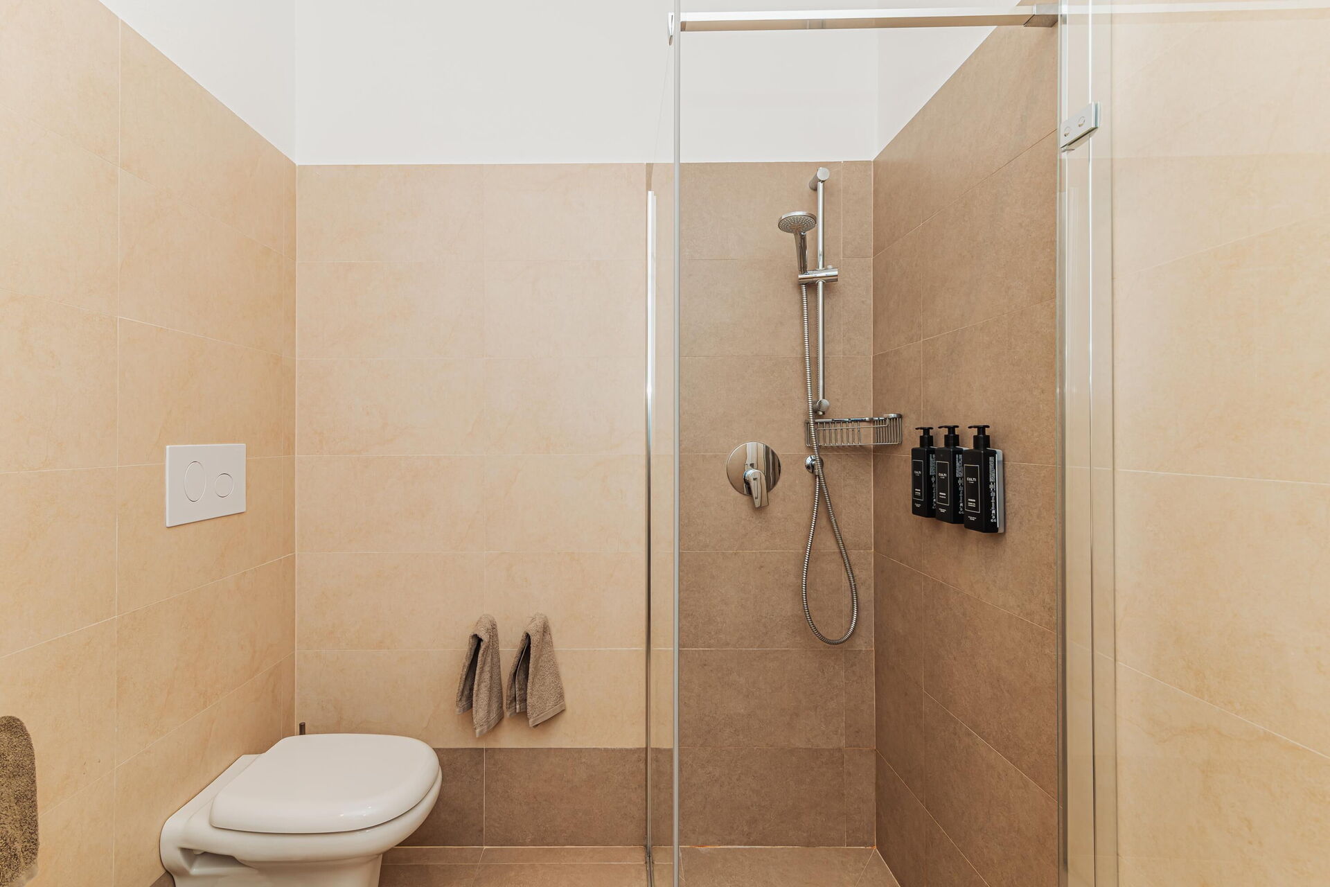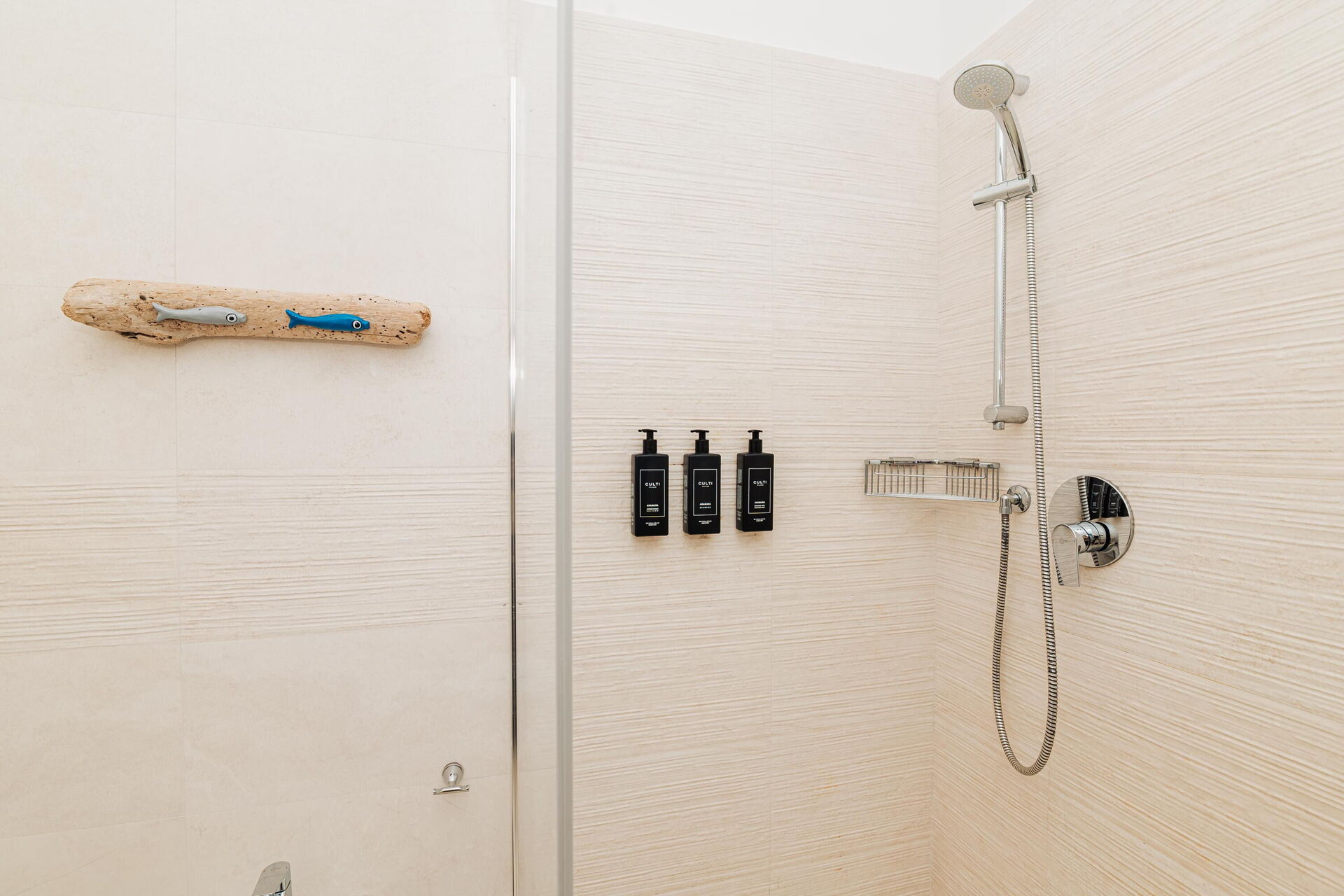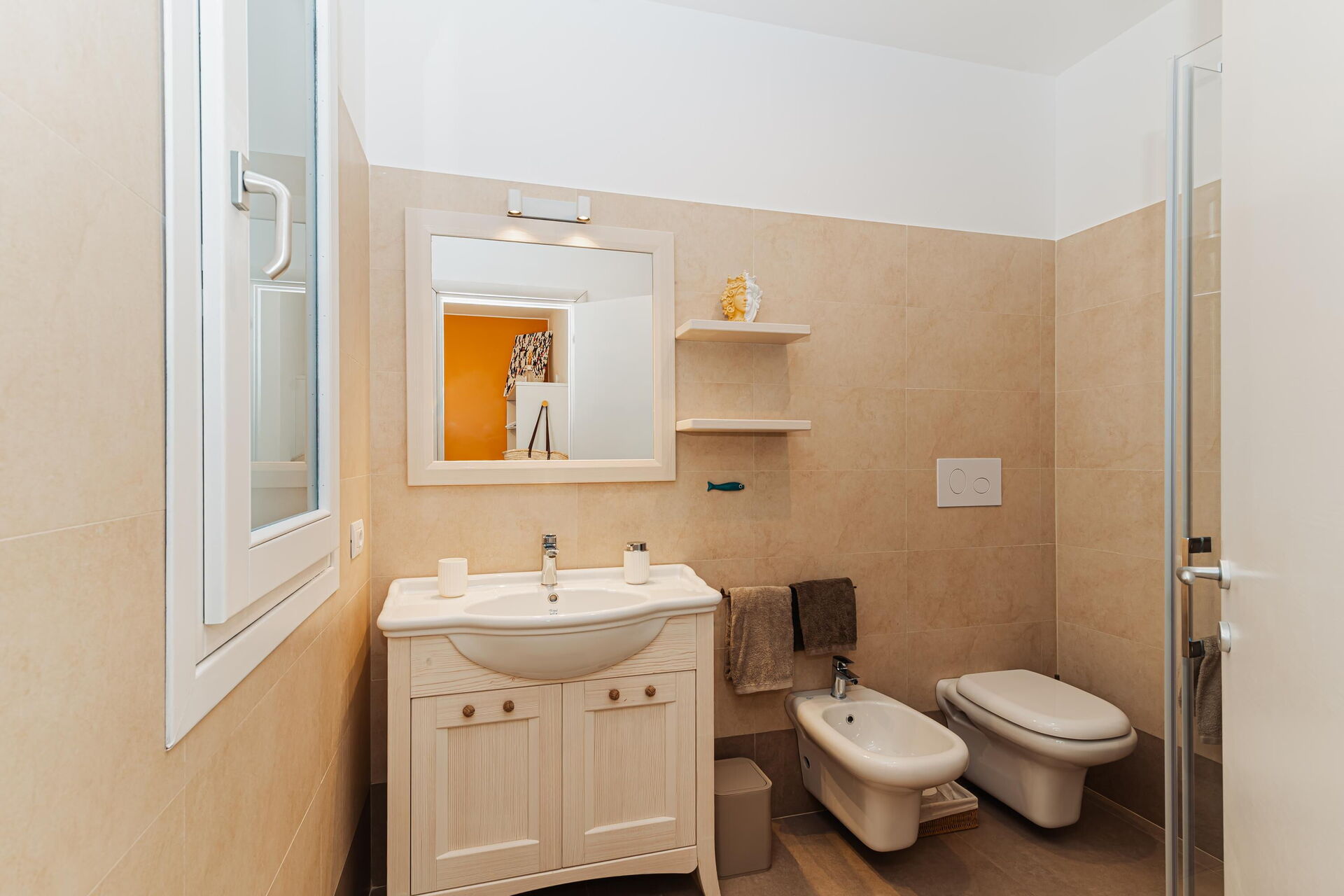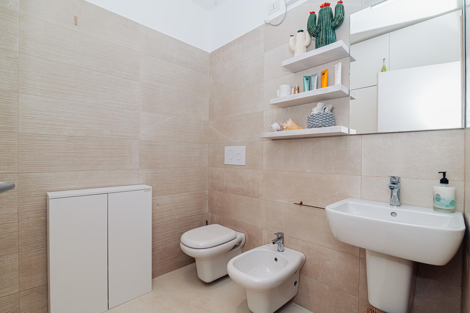 3 trin op: 3 dobbeltværelser (aircondition), hver med eget badeværelse med bruser (soveværelserne har også udgang til det fri), vaskerum.