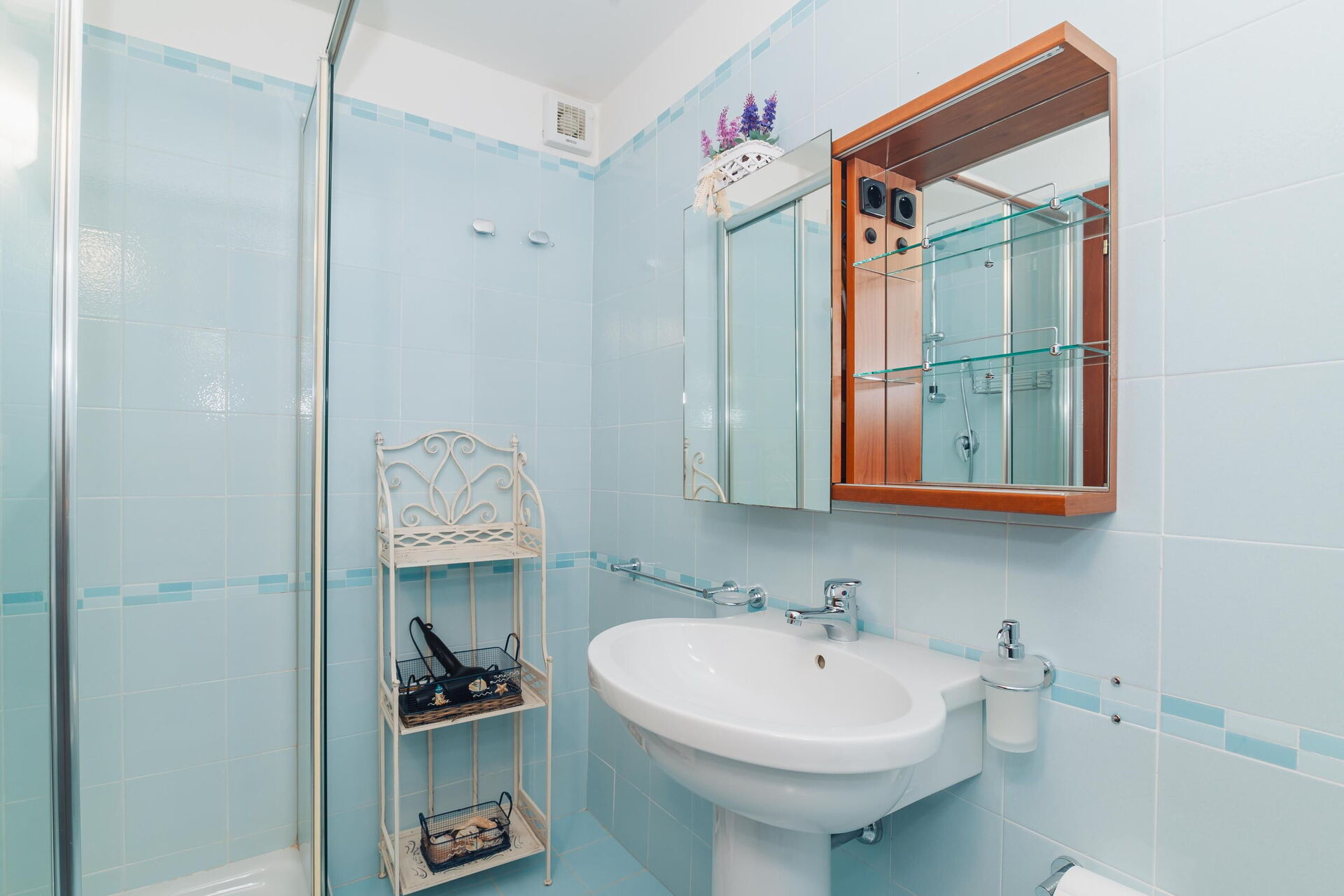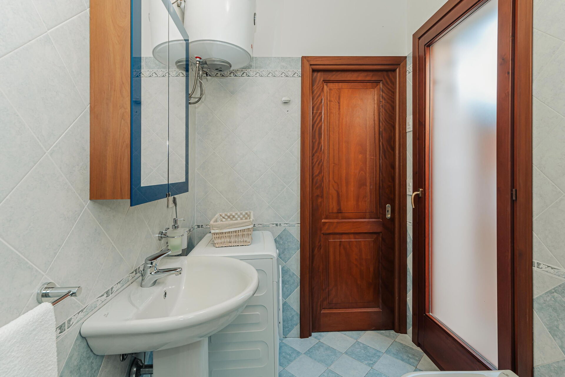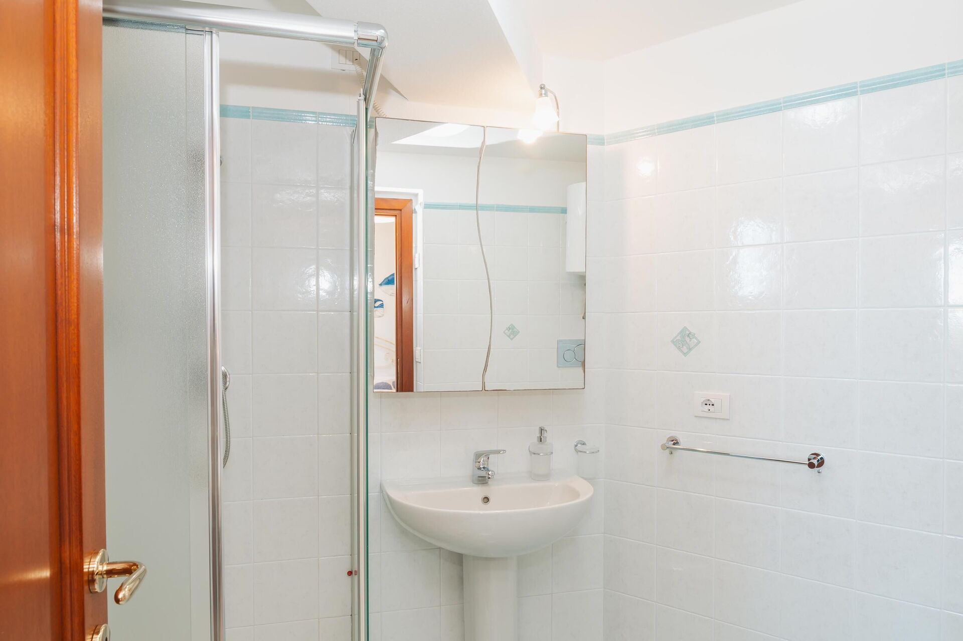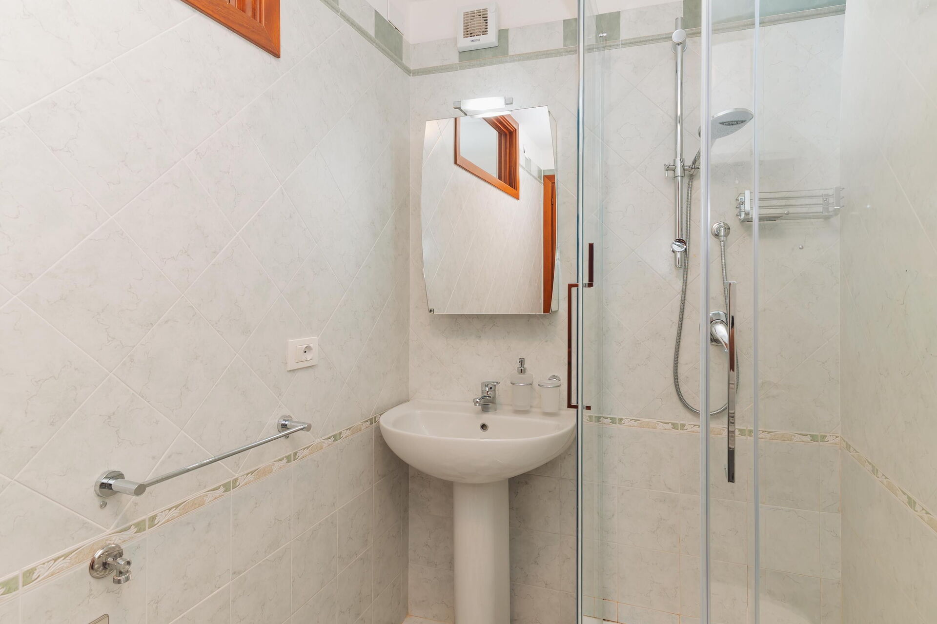 4 trin op: spisestue (aircondition), køkken (kogeplade, ovn, køleskab, fryser, opvaskemaskine, mikrobølgeovn, espressokaffemaskine, brødrister), badeværelse med bruser (vaskemaskine), dobbeltværelse (aircondition) med udgang til det fri, badeværelse med bruser.