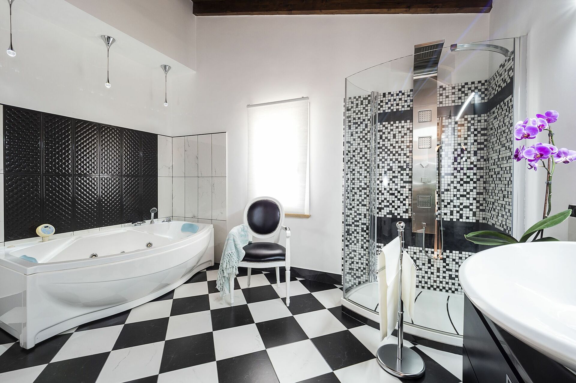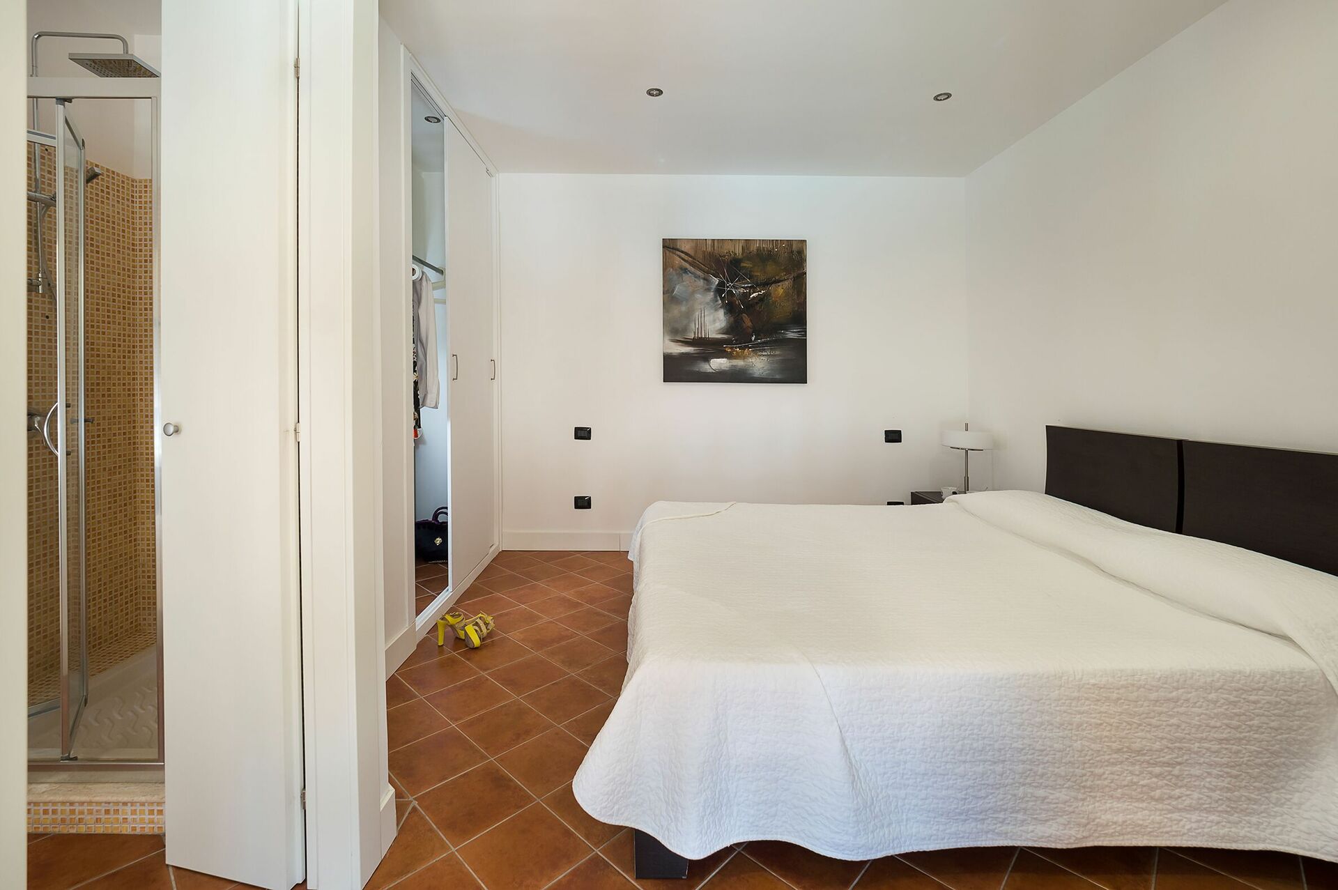 Stueetagen (adgang via en åben trappe og elevator): Soveværelse med luksus badeværelse og jacuzzi og et soveværelse med fransk seng og bad.