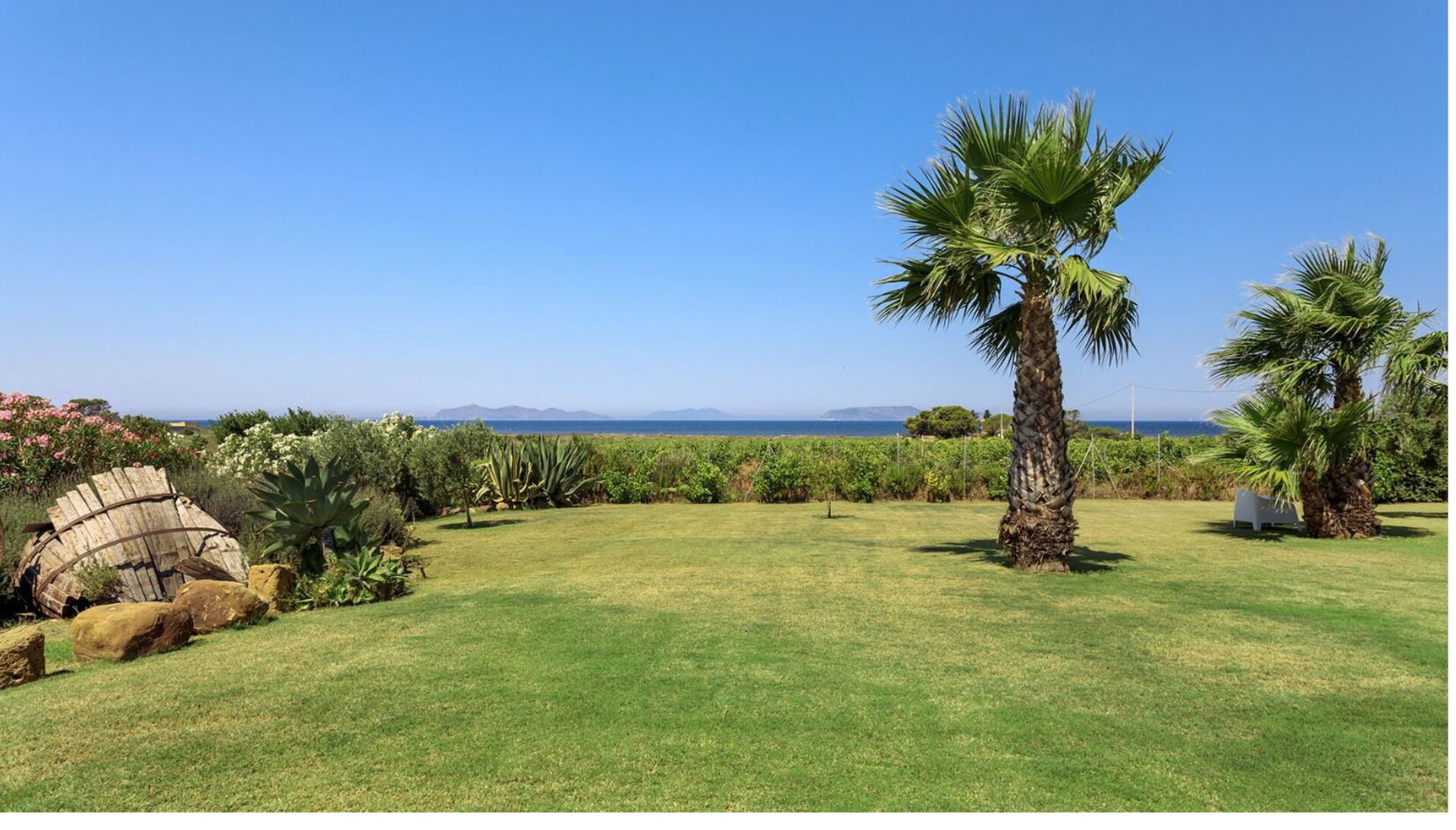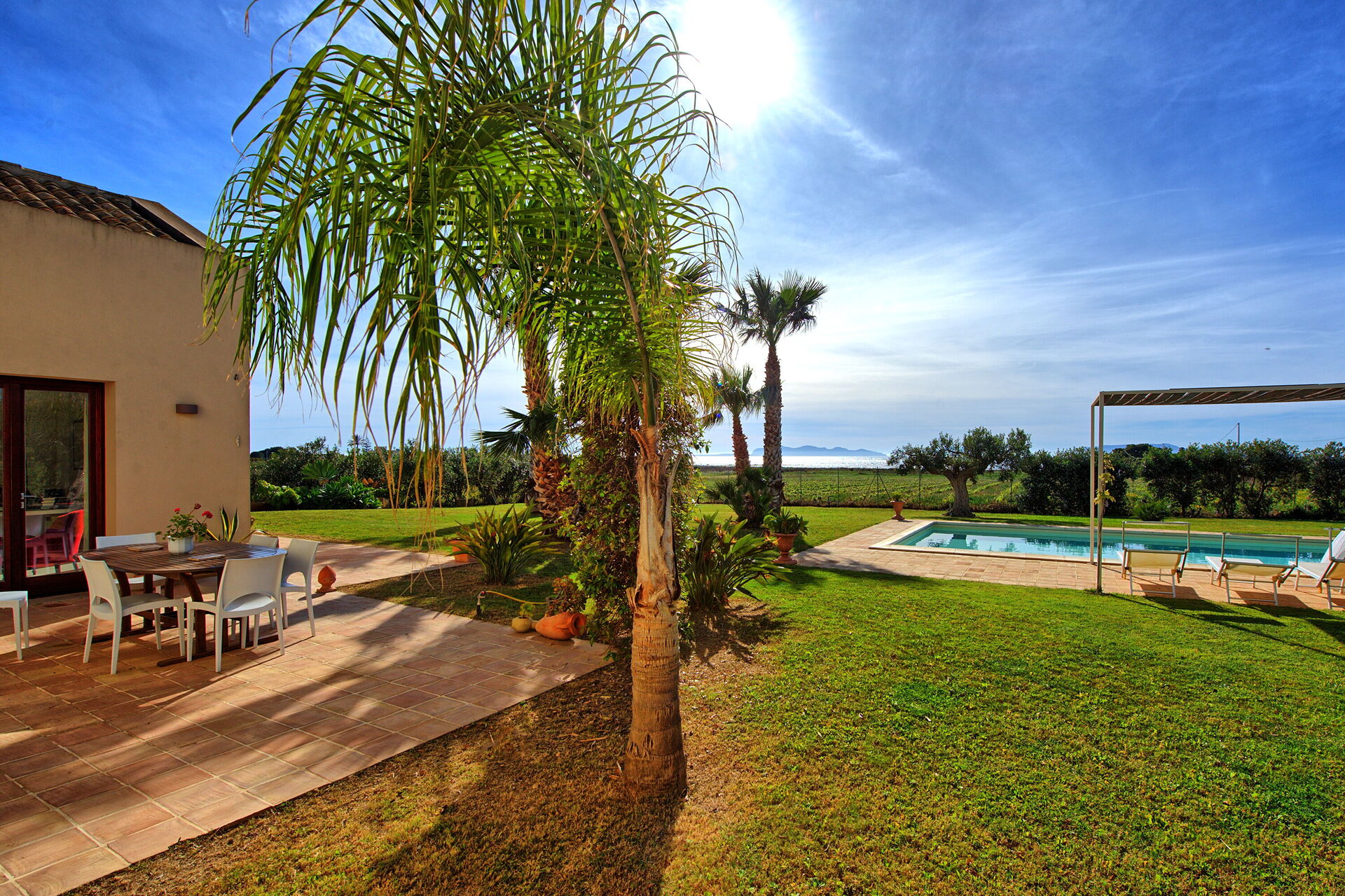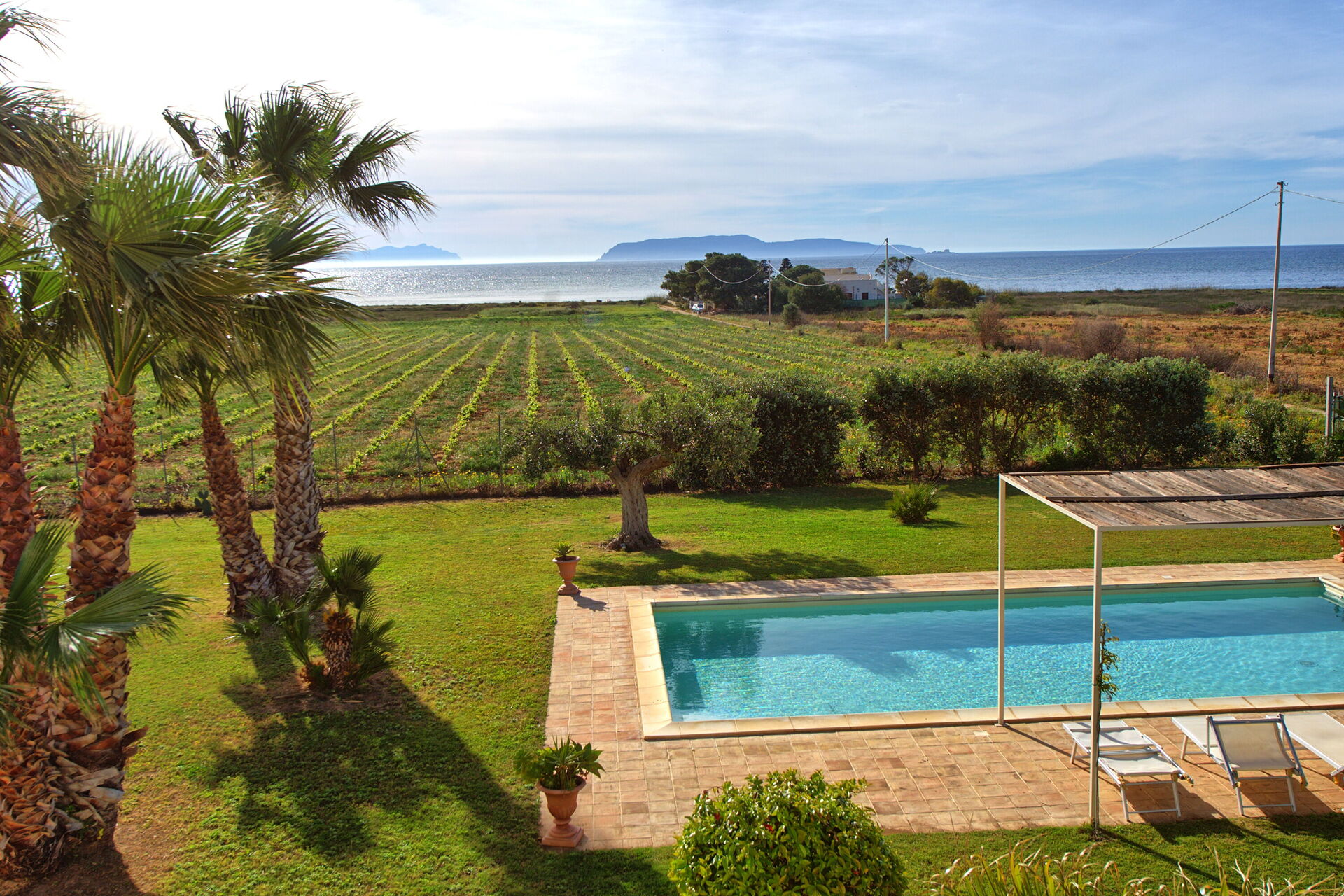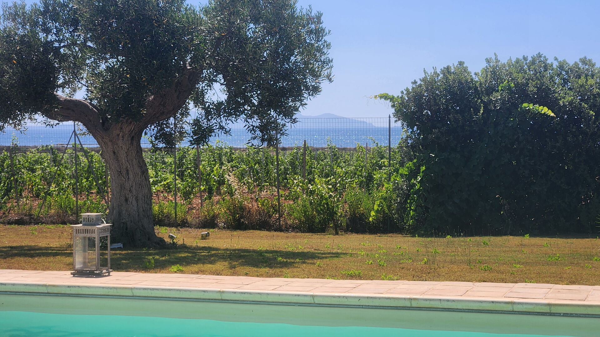 Sommerhuset har en dejlig panorama-havudsigt fra poolen og de rummelige terrasser, ikke mindst mod nabogrunden, der er en vingård.