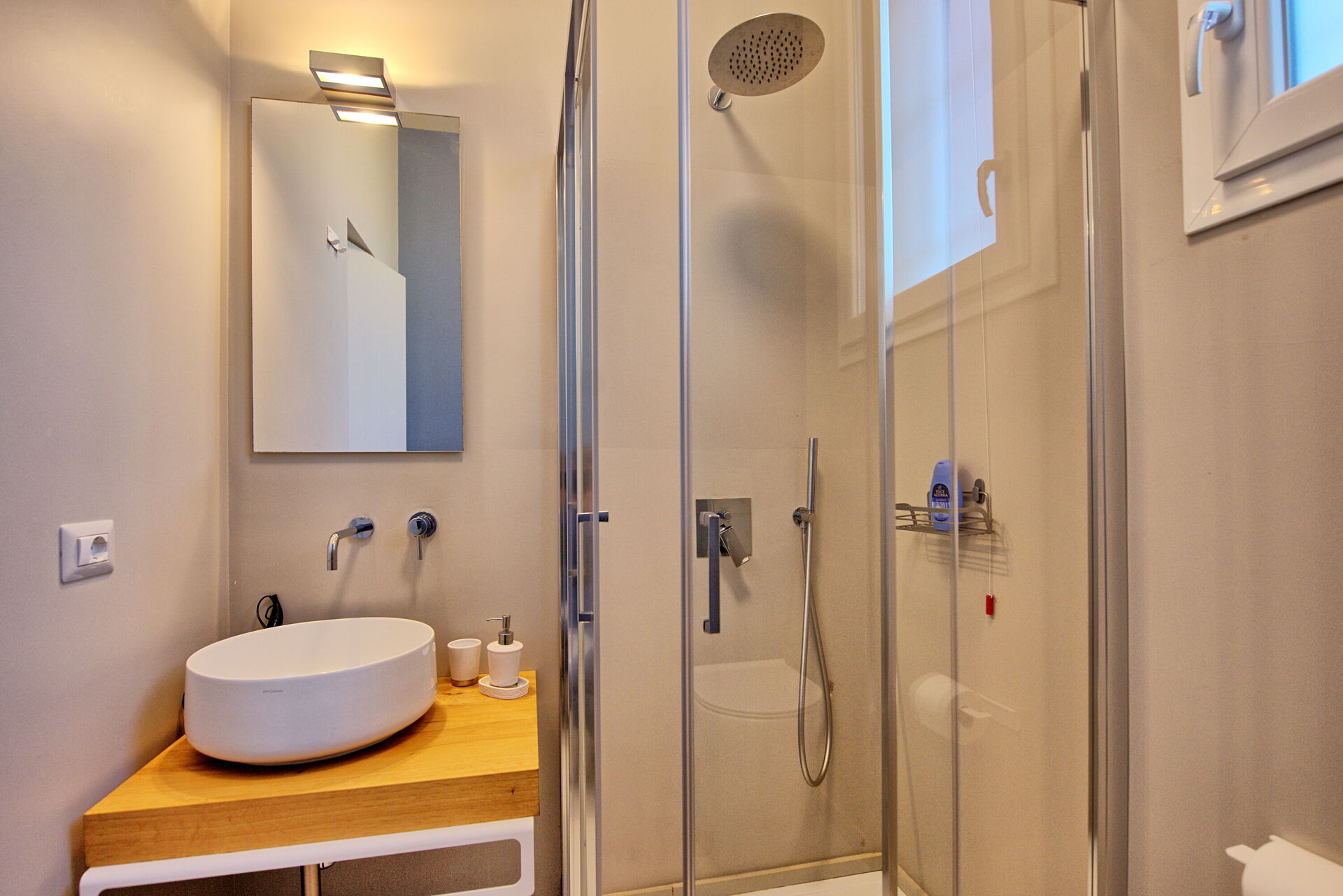 Forhøjet stueetage (adgang op 7 trin fra haven): stue med spiseplads, køkken (ovn, fryser, mikroovn, opvaskemaskine, 4 kogeplader, espressomaskine, amerikansk kaffemaskine) og adgang til den overdækkede, møblerede terrasse; 3 soveværelser med dobbeltsenge hver med eget badeværelse med bruser.