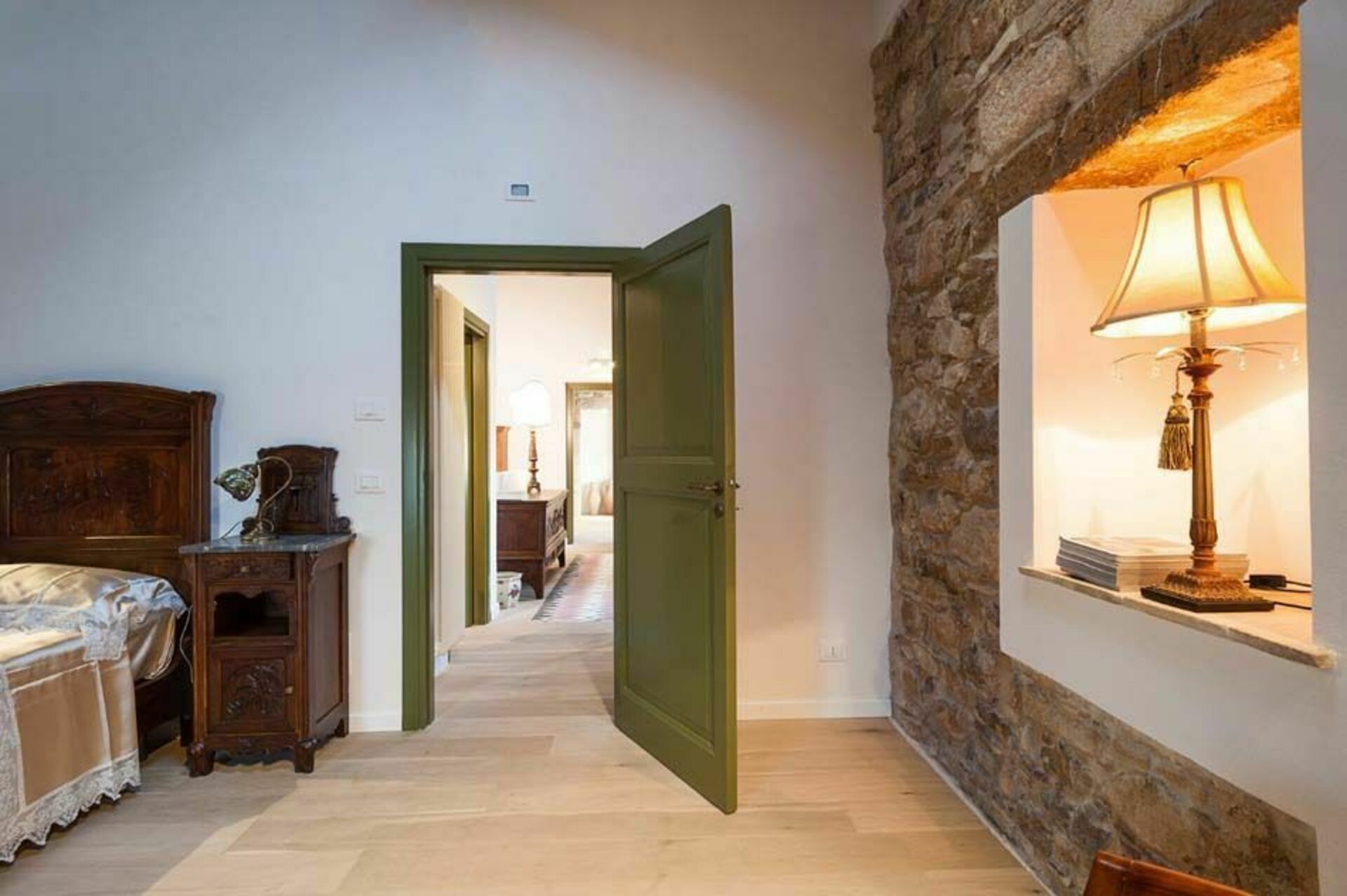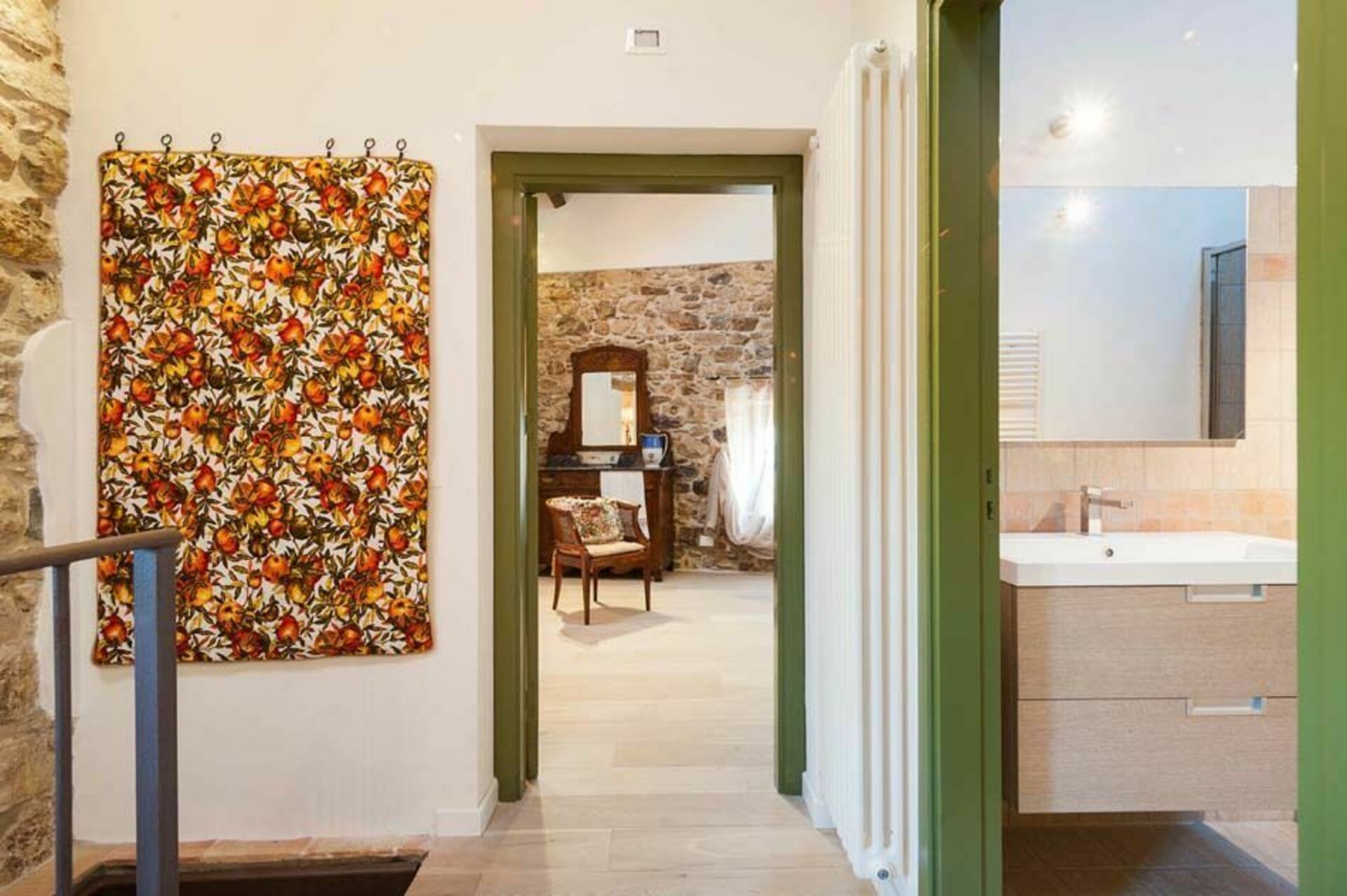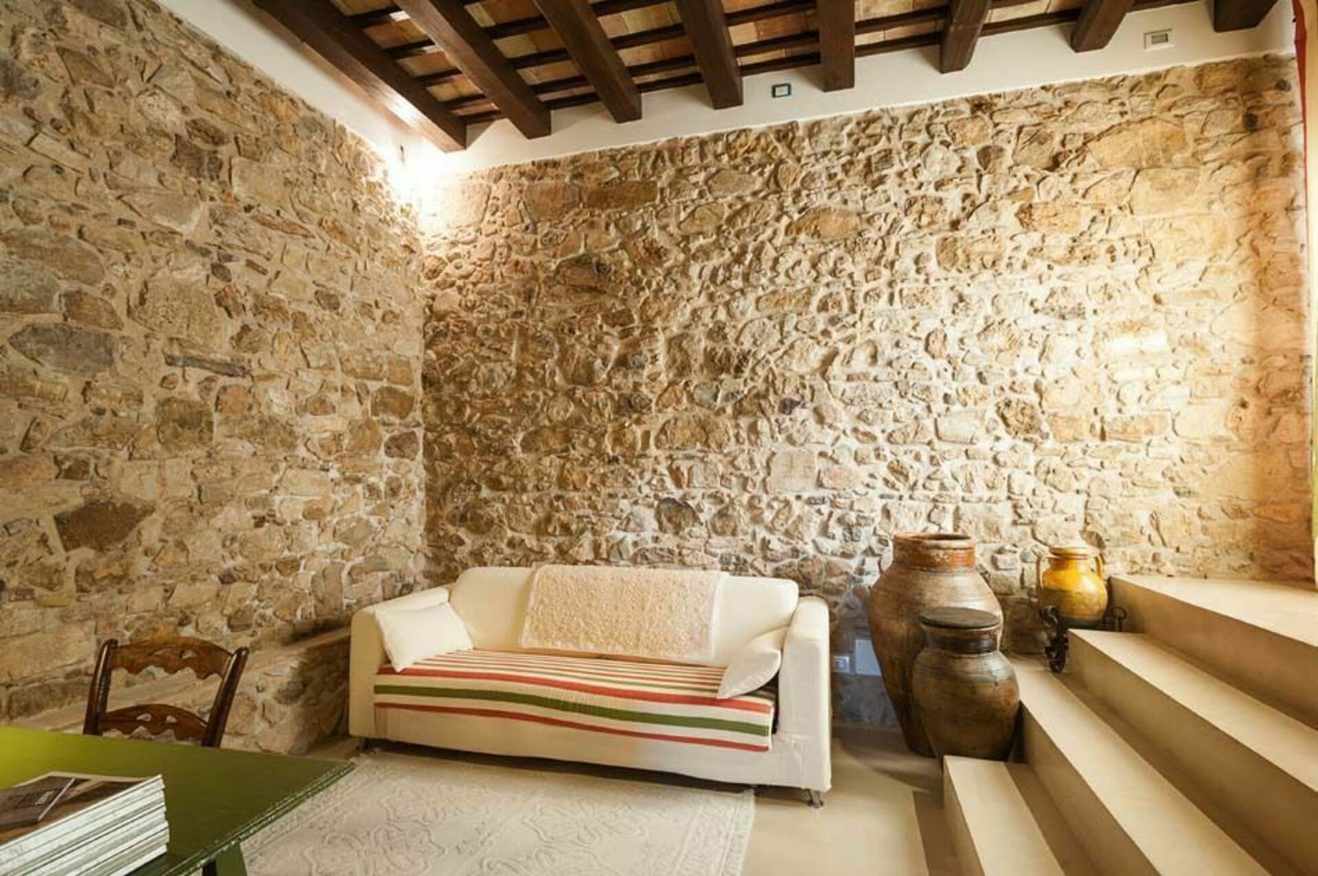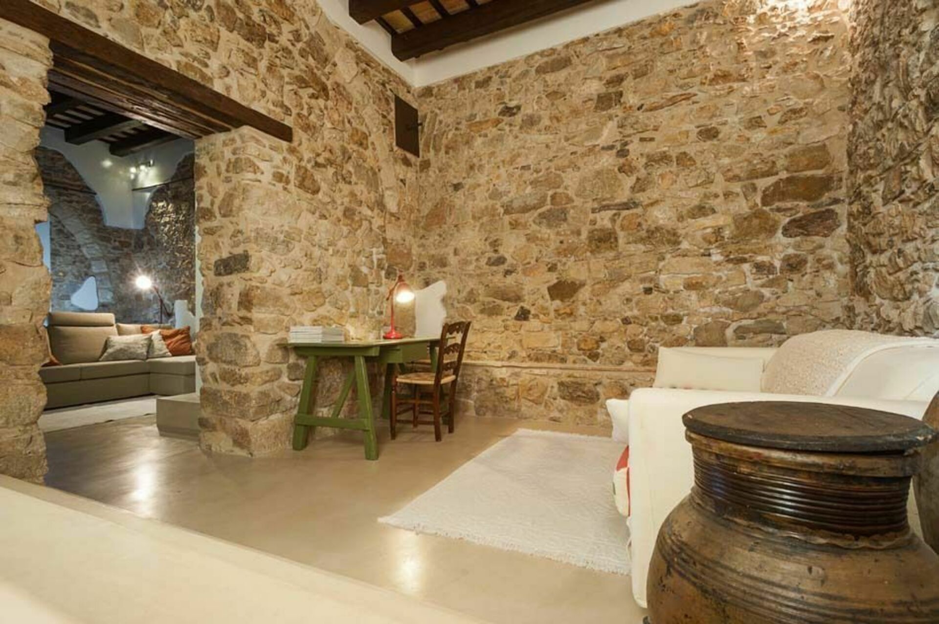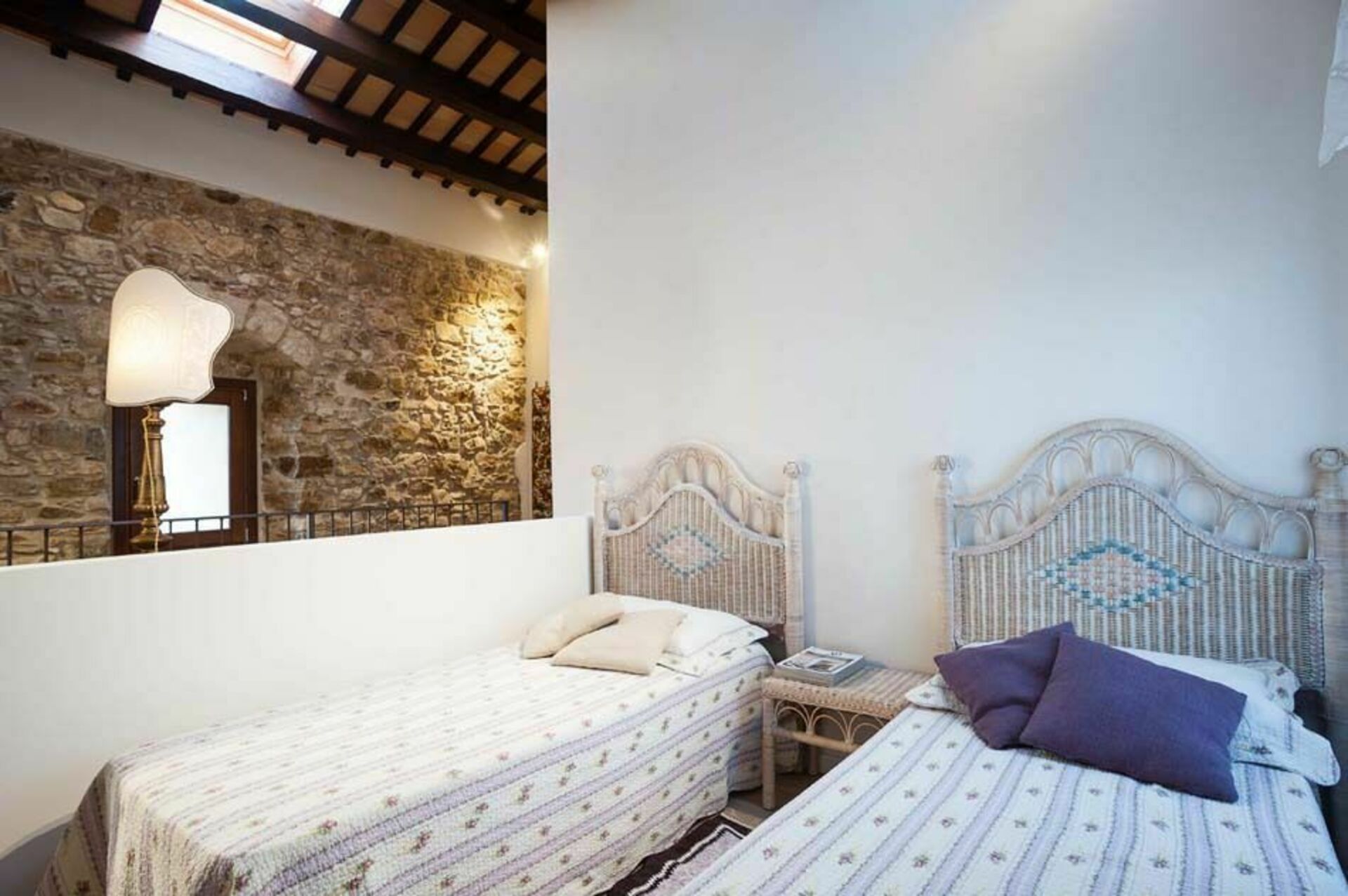 Træbjælker i loftet og tykke stenvægge, stue med pejs, et veludstyret køkken, der åbner ud til terrassen, to komfortable dobbeltværelser, et gennemgående soveværelse med to enkeltsenge og to badeværelser.