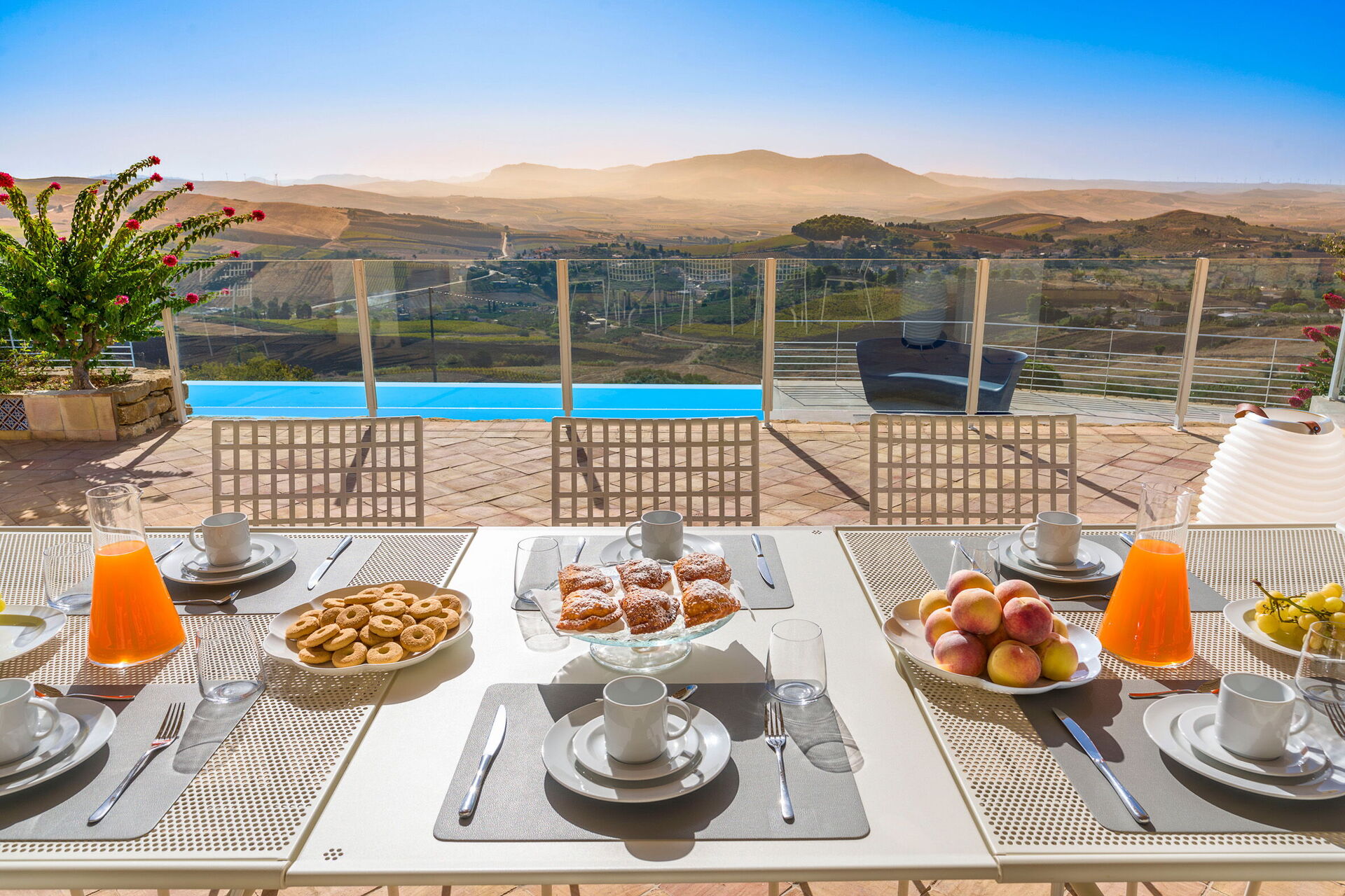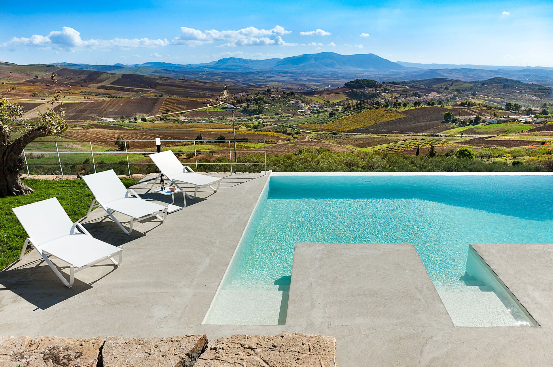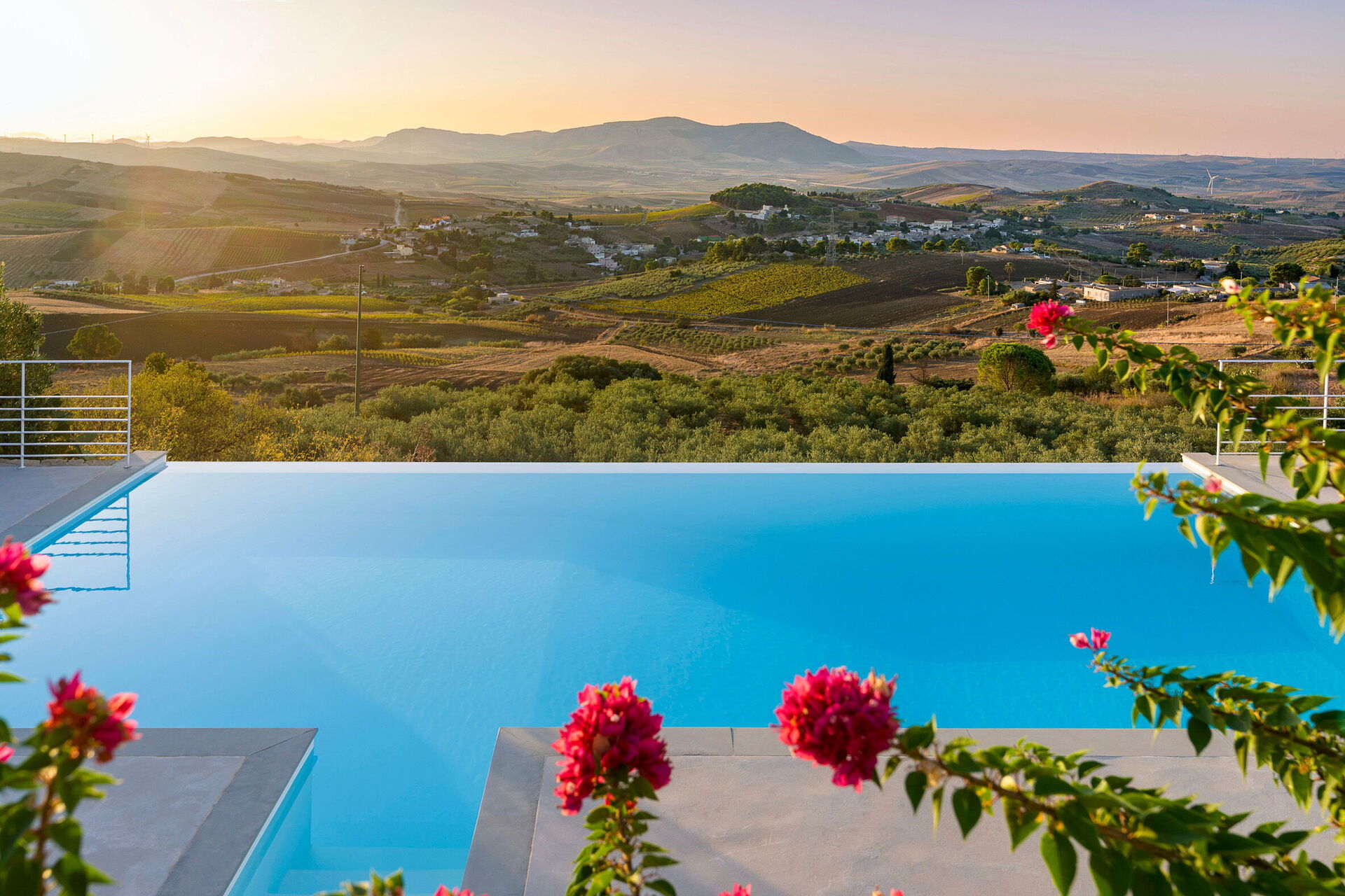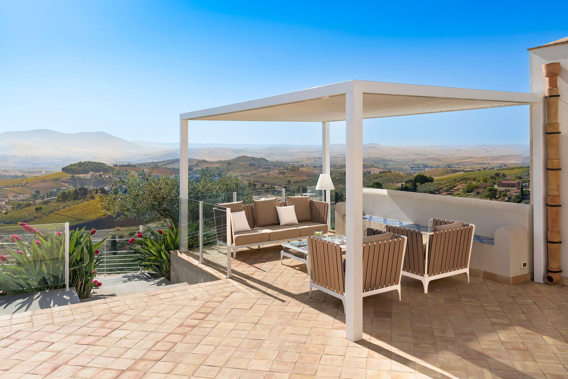 Luksus villa med privat swimmingpool i en pragtfuld panoramisk beliggenhed på landet i nærheden Trapani, en gammel og elegant by på den nordvestlige spids af Sicilien. Villa Tangi er mukt indrammet af bløde bølgende bakker og frodige dale. Ejendommen er en oase af fred og ro med sin velholdte have, infinity-pool og store solrige terrasser. Ejendommen, der er bygget ved hjælp af naturlige materialer i overensstemmelse med lokale traditionelle arkitektur, blander elegant ind i de landlige omgivelserne. Den godt gennemtenkte interiør er både hyggelig og lyst. Sommerhuset er udstyret med alle moderne faciliteter og har en smagfuld blanding af moderne og gamle familie møbler. Feriehuset omfatter fire komfortable soveværelser og fire badeværelser, et veludstyret køkken, spisestue og en rummelig stue med pejs. Ideel for familier eller grupper af venner på udkig efter at særlige afslappende ferie, Villa Tangi er også den perfekte base for at udforske den charmerende provinsen Trapani: fra de smukke strande i Cornino, Makari og San Vito Lo Capo til Zingaro naturreservatet, fra den middelalderlige landsby Erice til templerne i Segesta og Selinunte og fra de livlige historiske centre i Trapani og Marsala til de gamle salt pander med deres vindmøller og Egadiøerne.