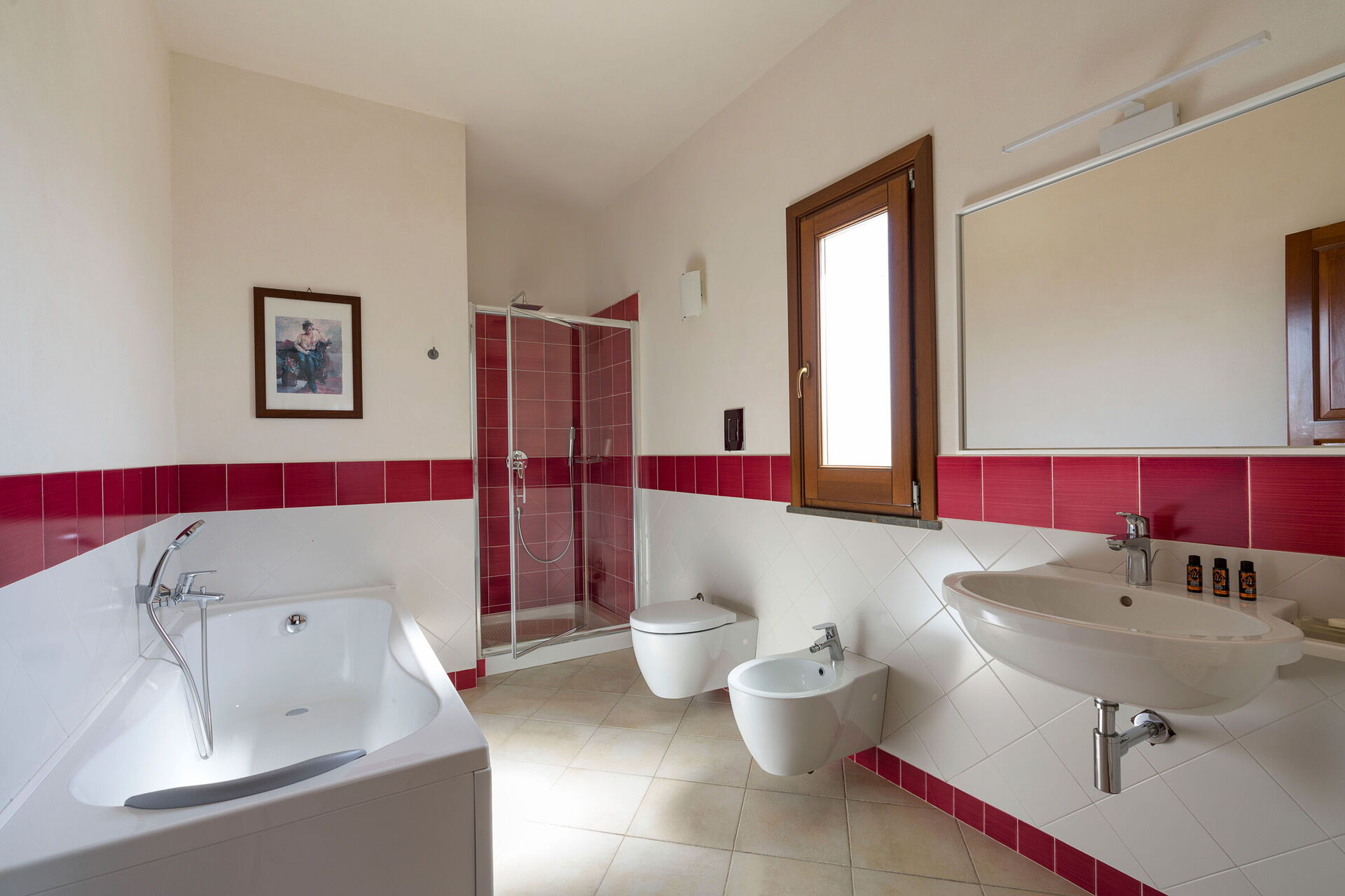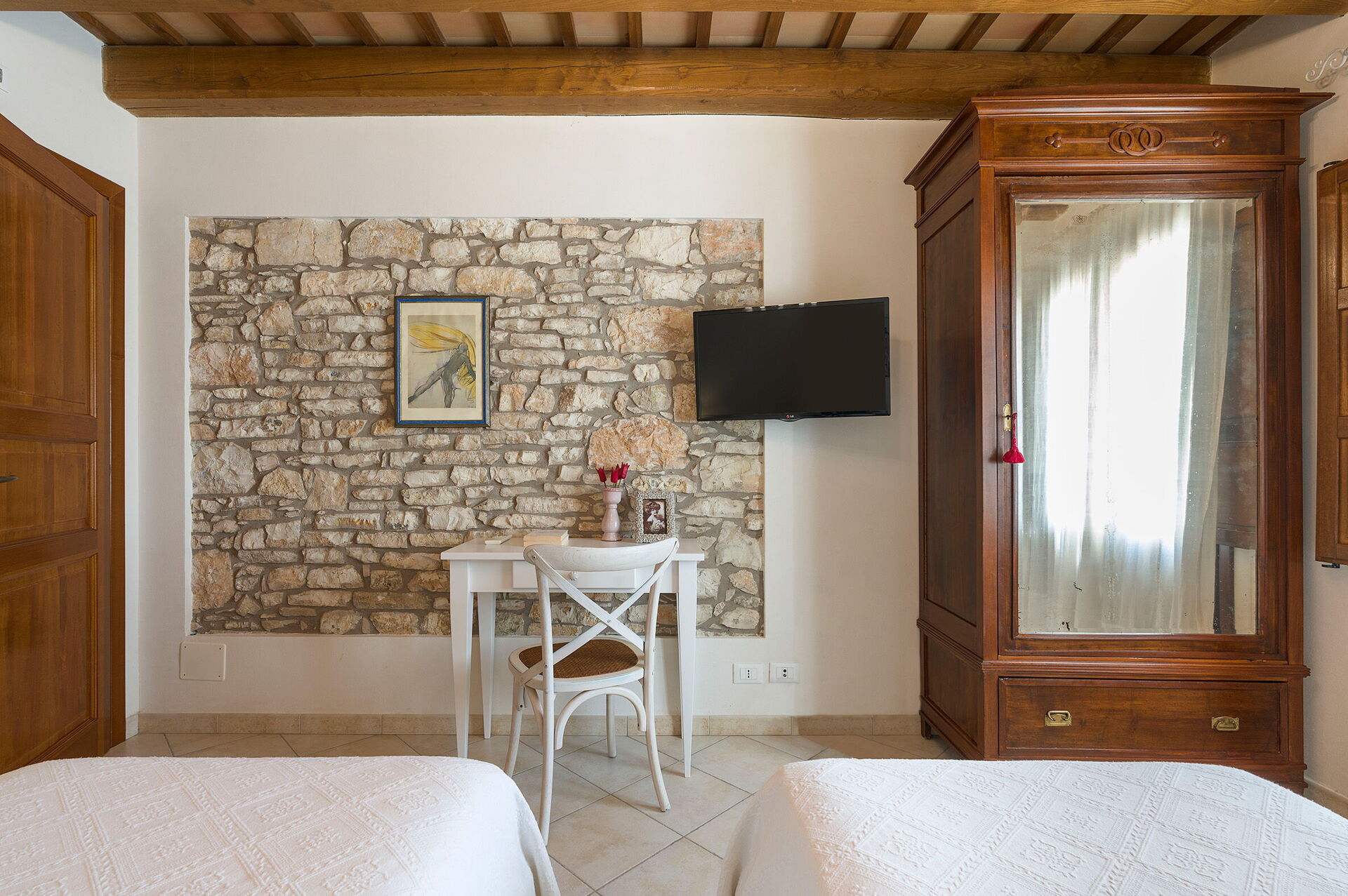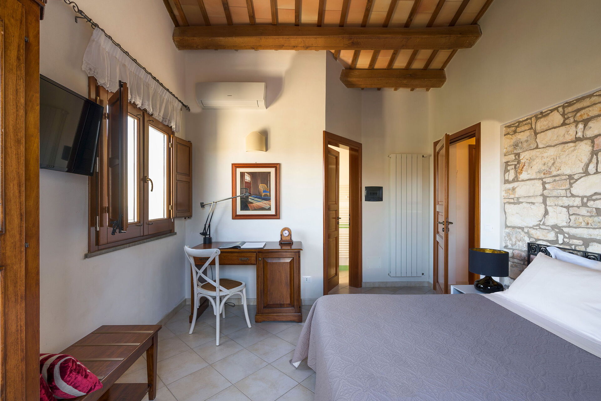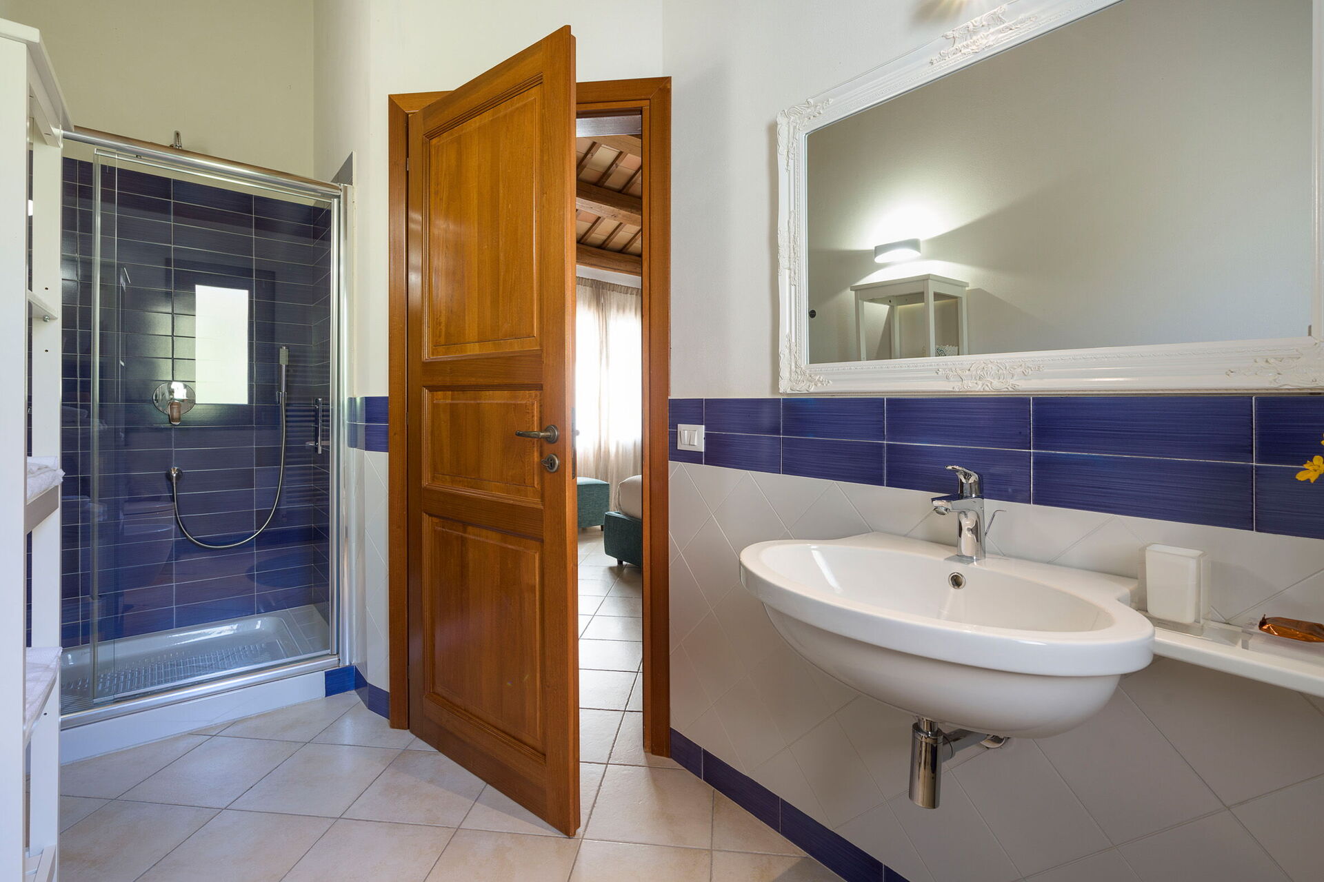 Stueetagen: stue med pejs, stue med sovesofa, spisestue, køkken, vaskeri, 1 dobbelt / soveværelse med lille terrasse, 1 badeværelse med bruser, 1 soveværelse med dobbeltseng med en-suite brusebad, 1 soveværelse med dobbeltseng + 1 enkeltseng med en-suite brusebad.