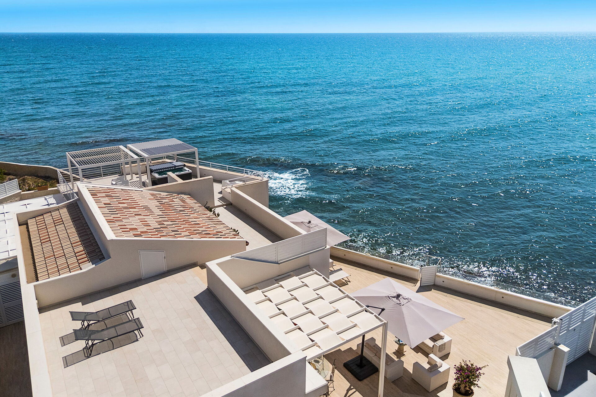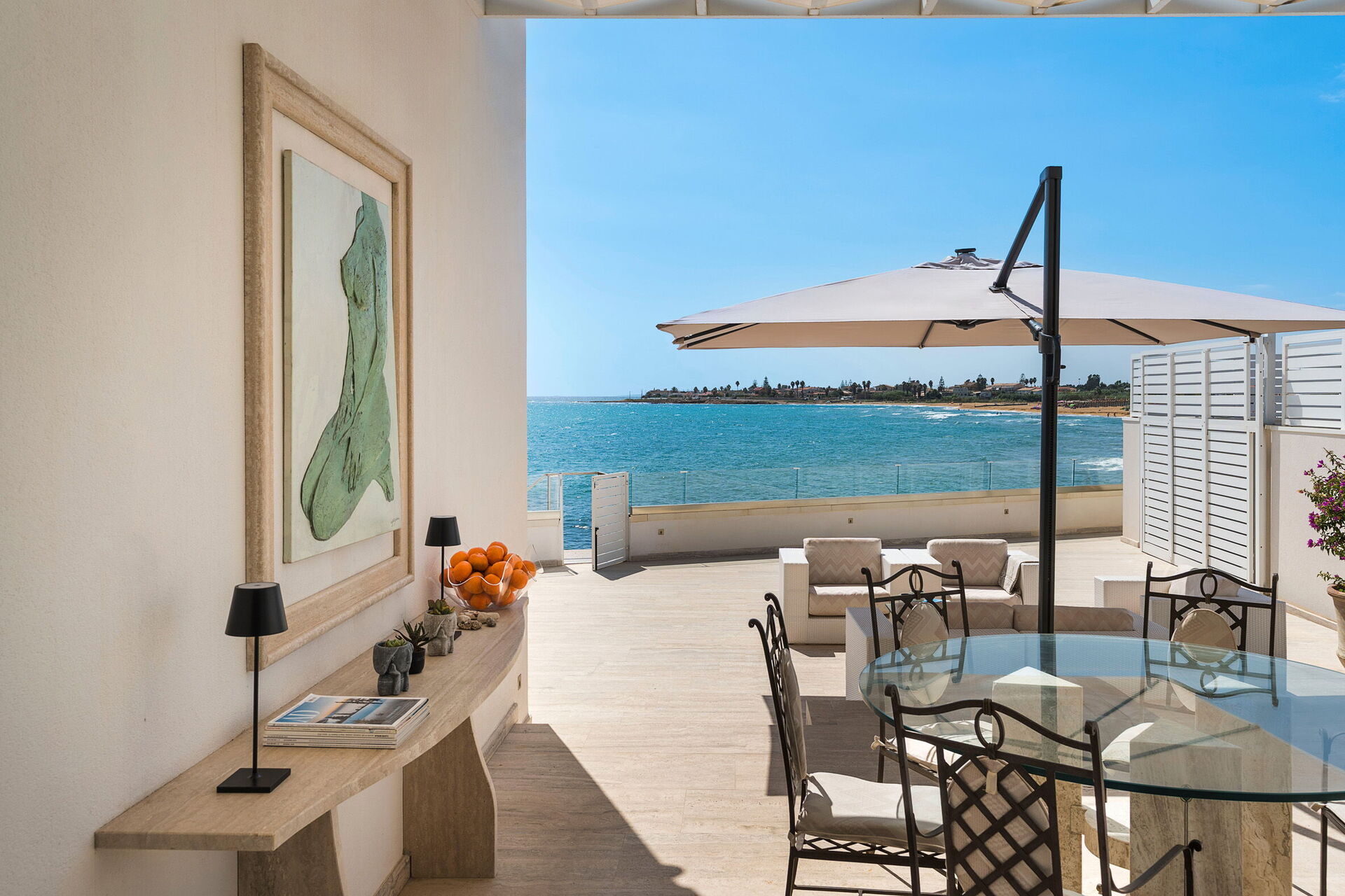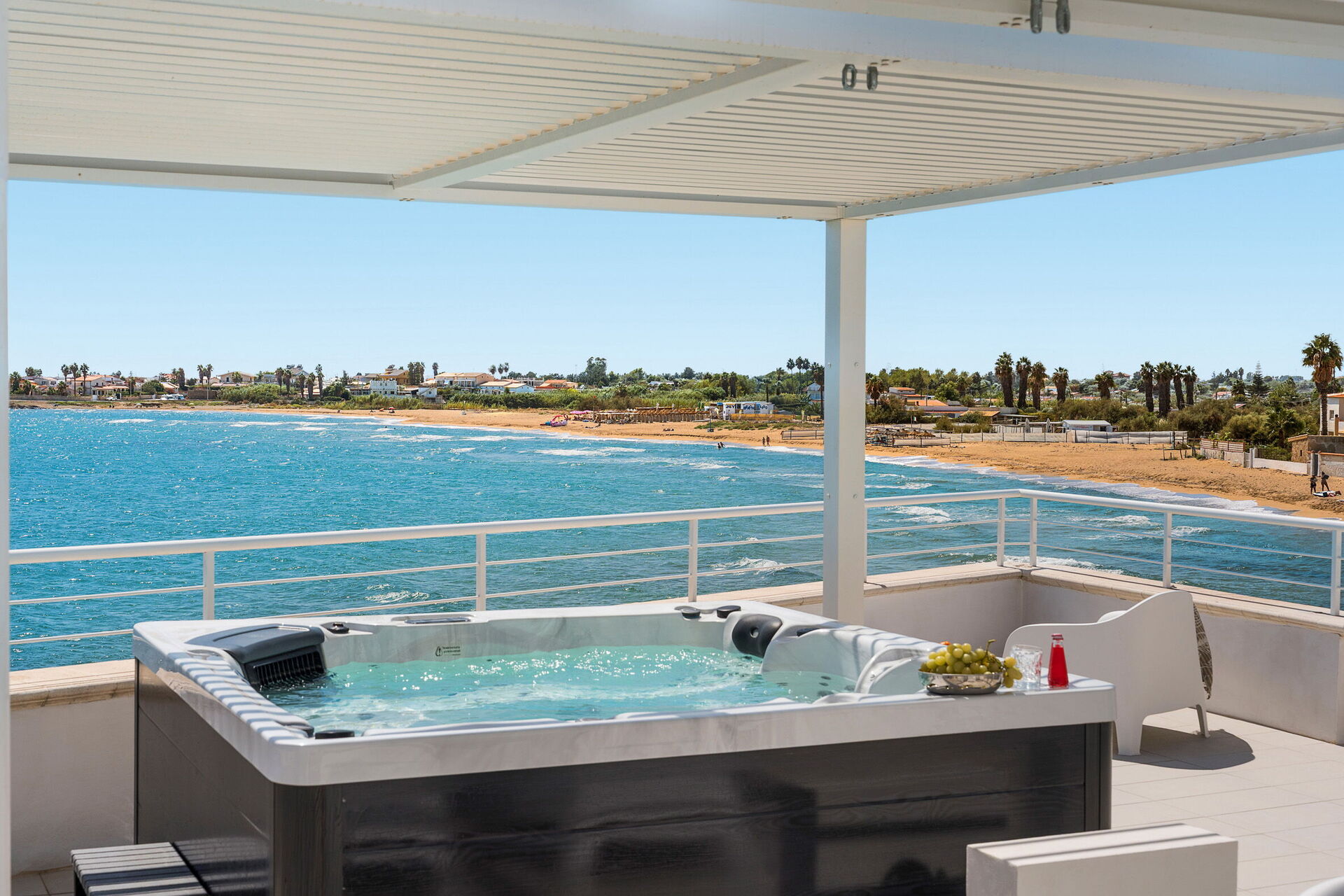 Den smukke terrasse er ejendommens fremtrædende punkt: Møbleret med solsenge, parasoller og havemøbler byder den på en fortryllende udsigt over havet og kysten ved Avola. Der er også andre skønne områder, såsom den møblerede pavillon, hvor man kan nyde måltider udendørs og solterrasserne. Dette gør huset til et perfekt udgangspunkt for en afslappende ferie med familie eller venner under den varme sol på Sicilien.