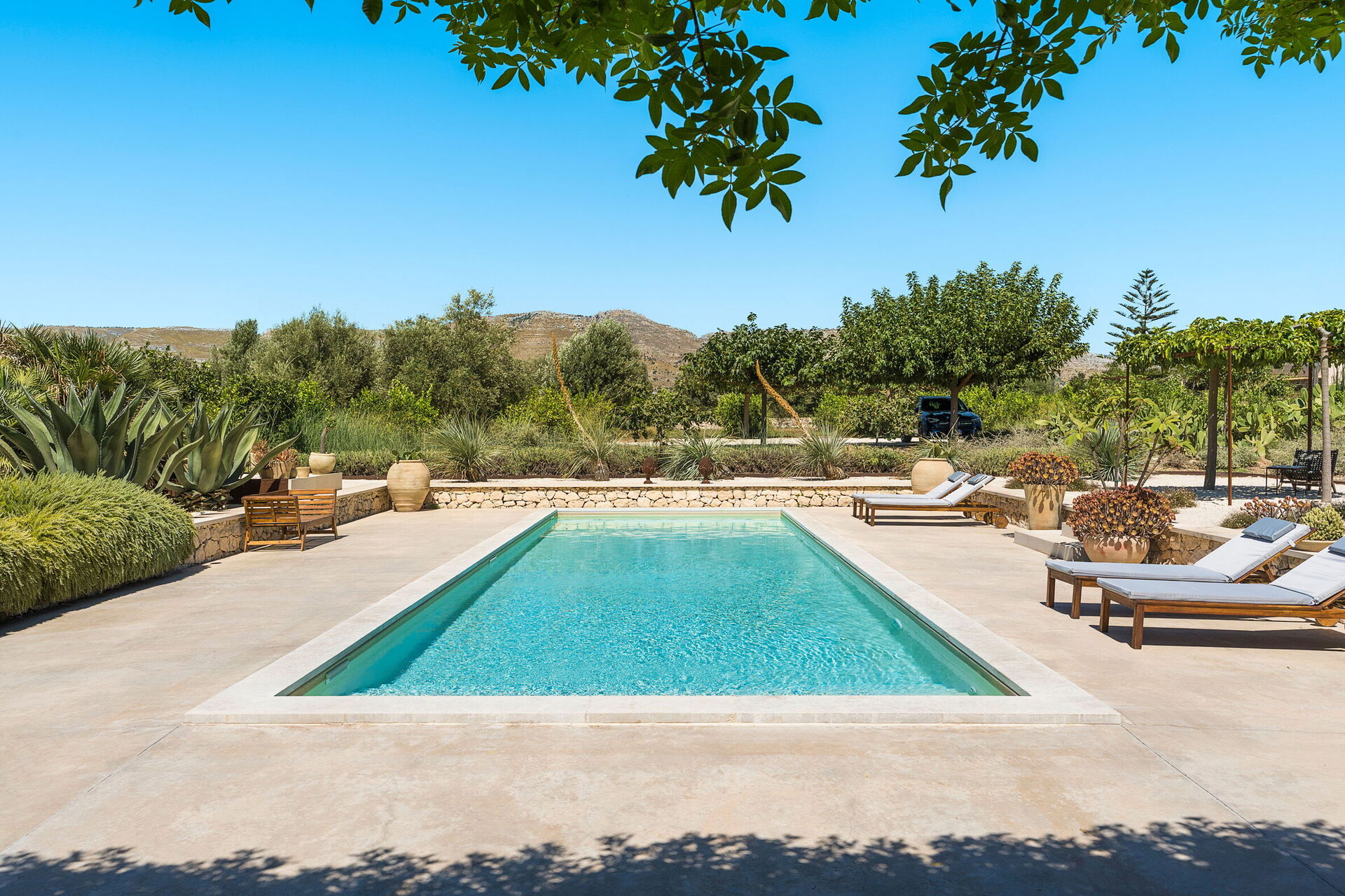 I det udendørs område er der en velplejet og blomstrende have samt en privat swimmingpool, det ideelle sted at slappe af og nyde solen på Sicilien om sommeren. Der er også en legeplads i haven.