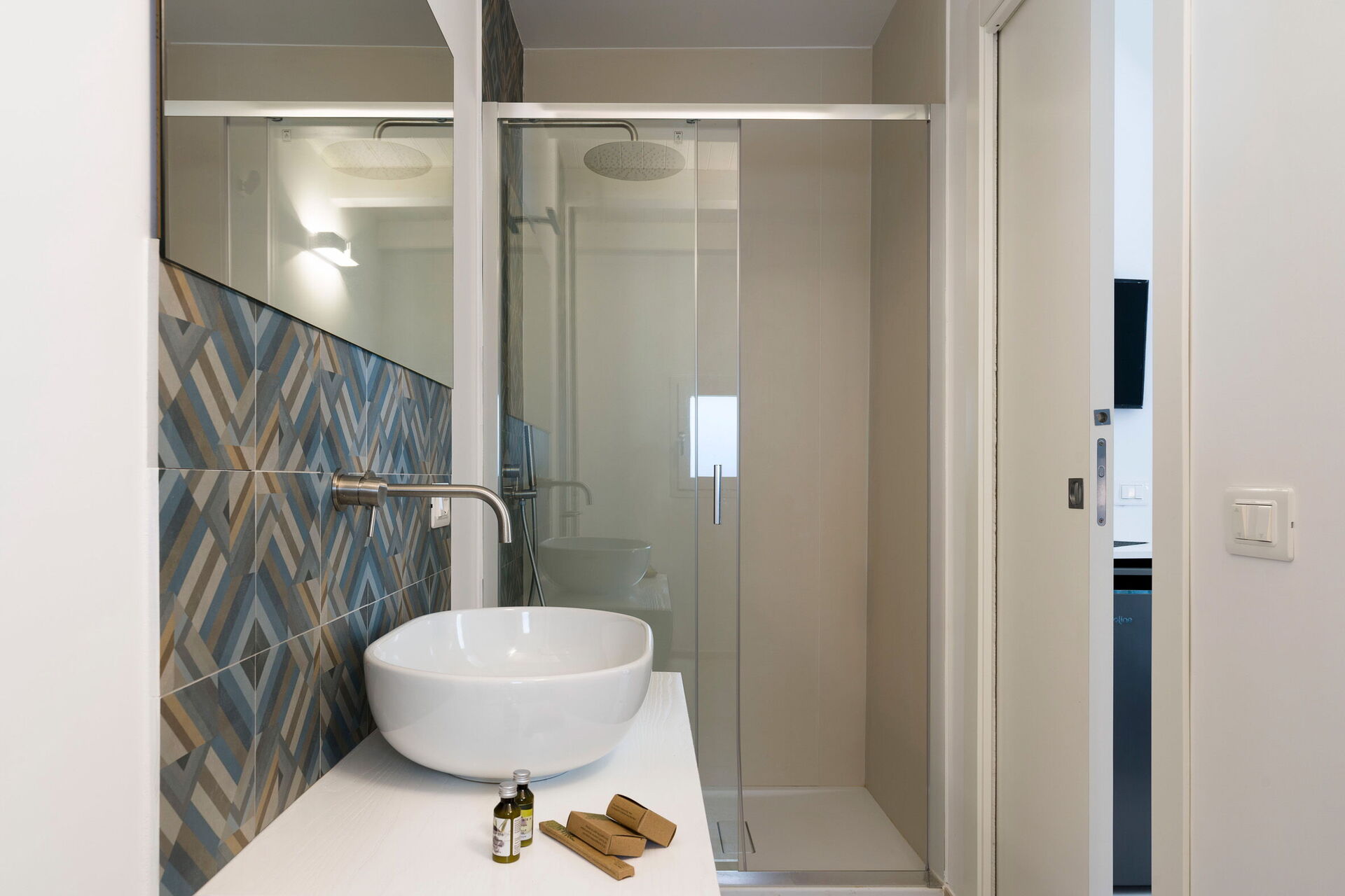 Første sal: soveværelse med dobbeltseng (aircondition, minibar, myggenet) med eget badeværelse med bruser.