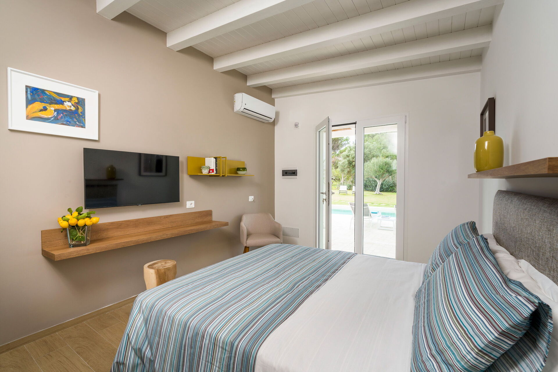 Første sal (kun tilgængelig udefra og ikke forbundet internt med resten af villaen): soveværelse med dobbeltseng (aircondition, minibar, myggenet) med eget badeværelse med bruser.