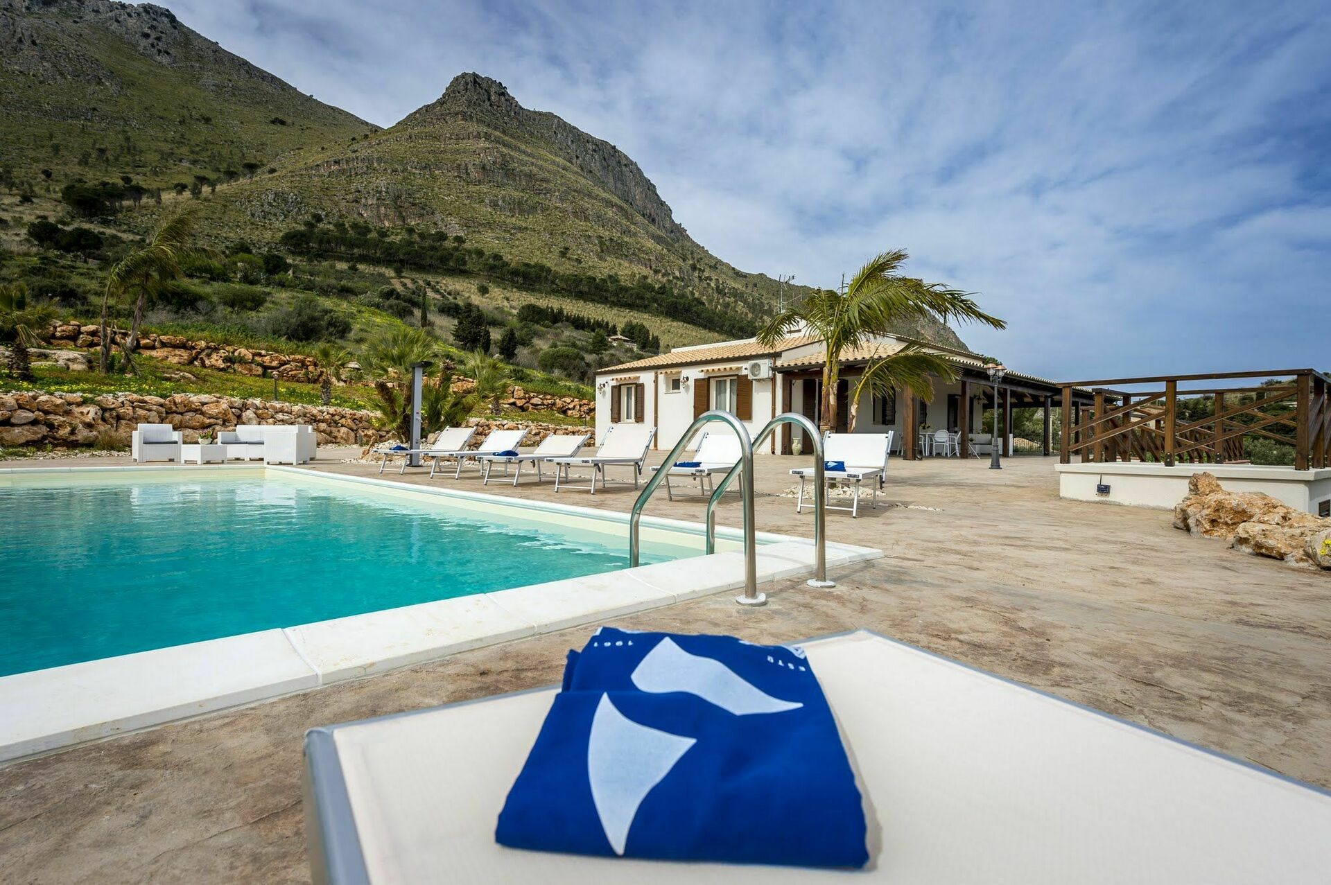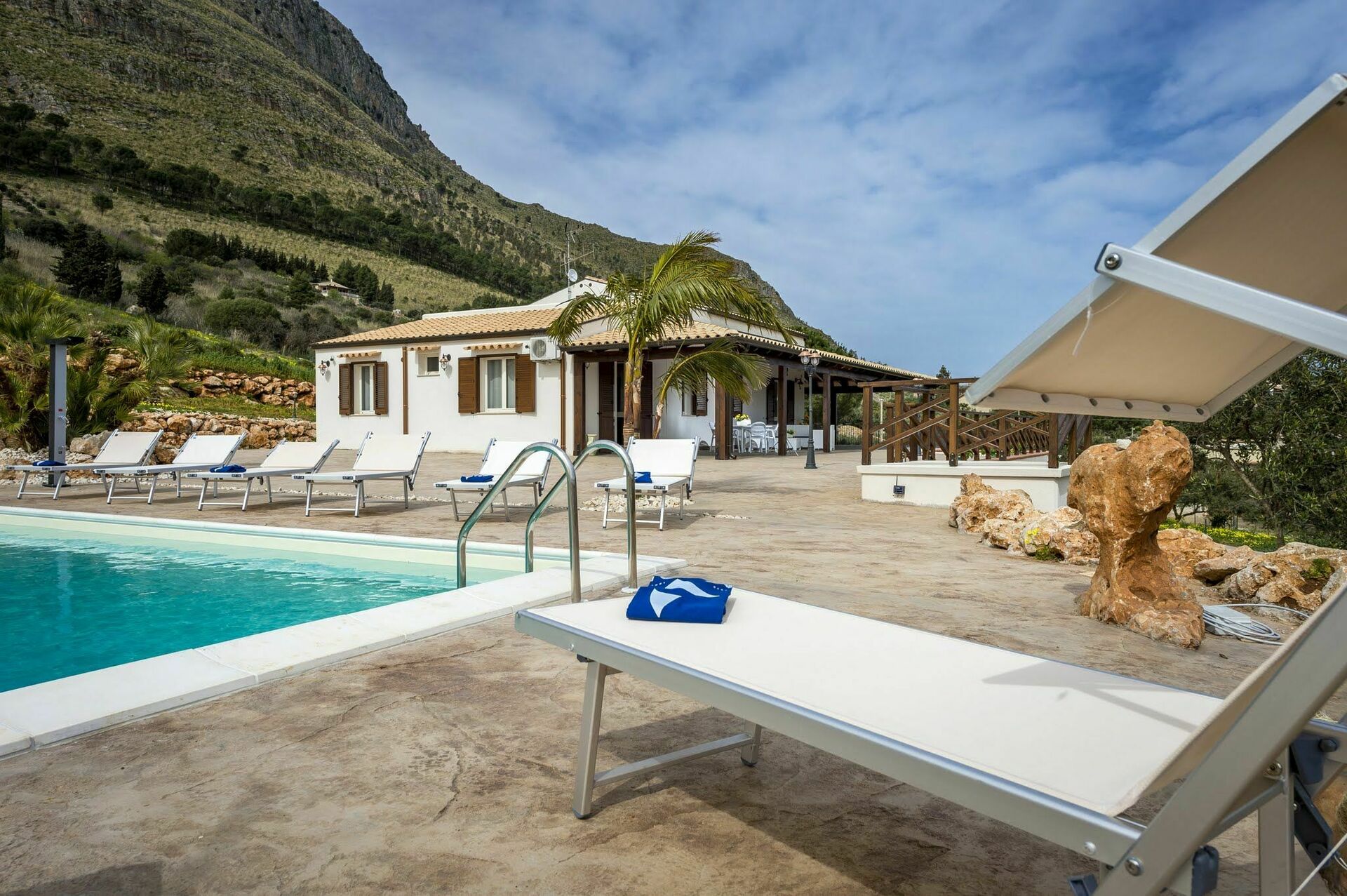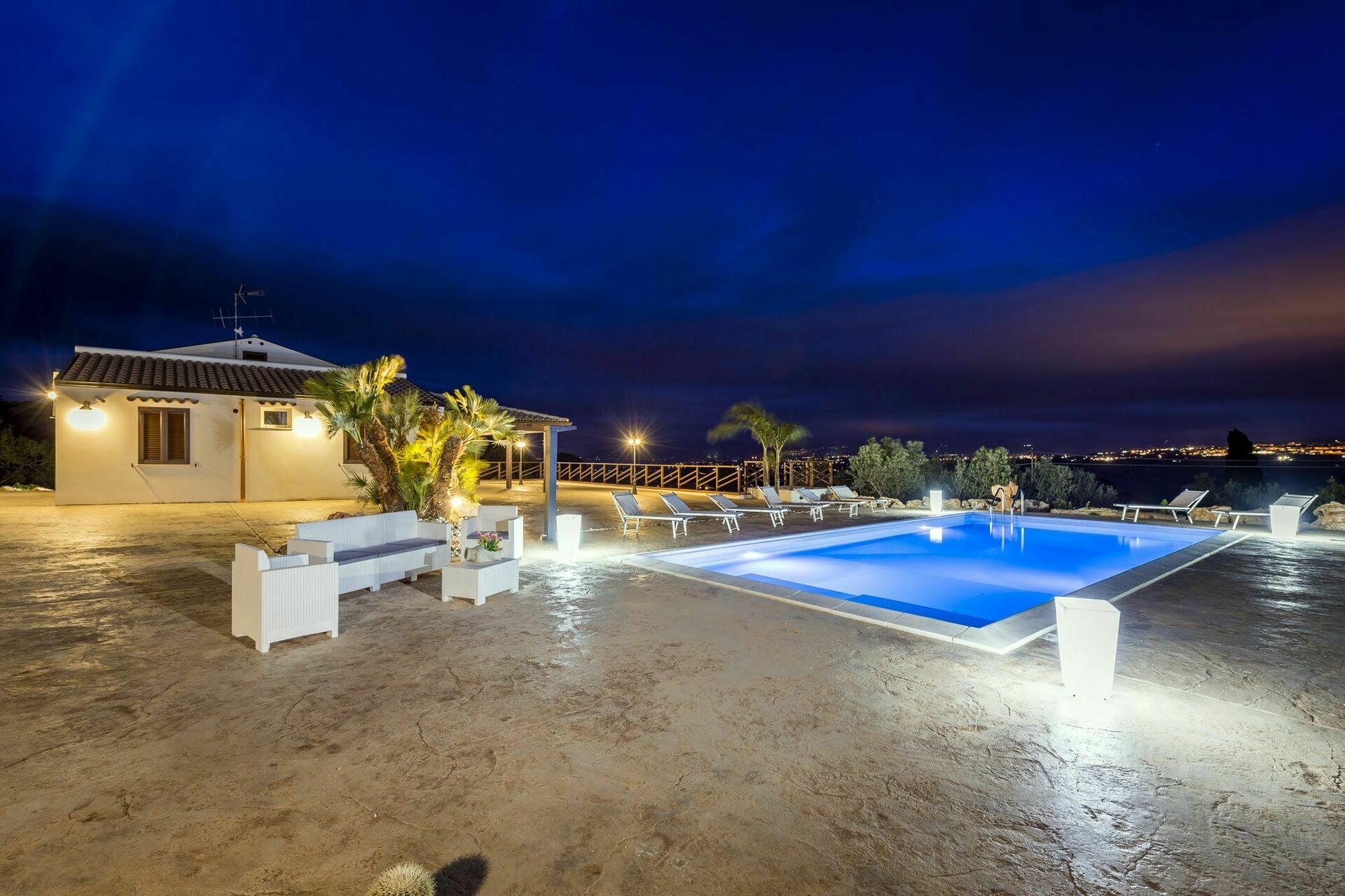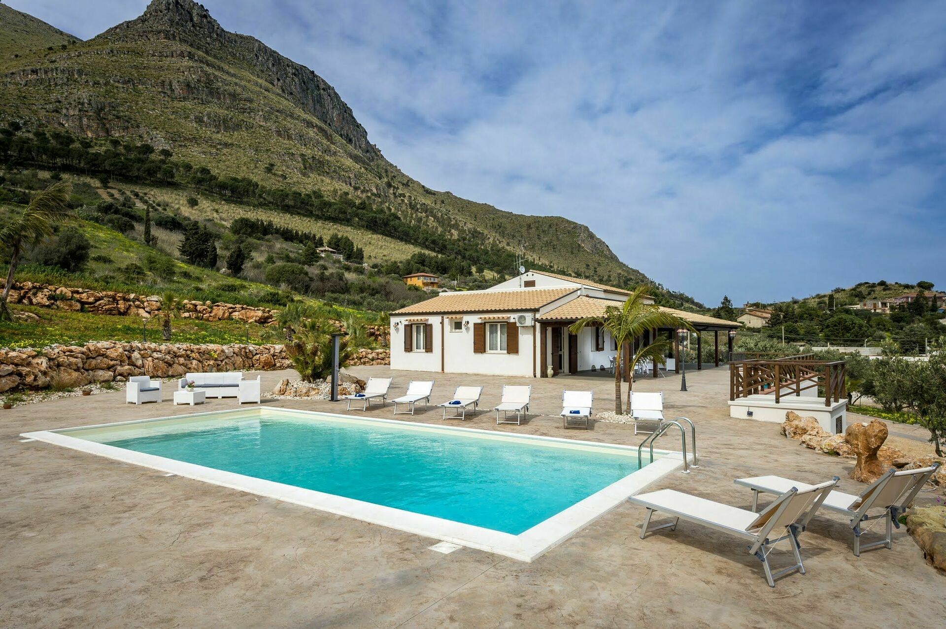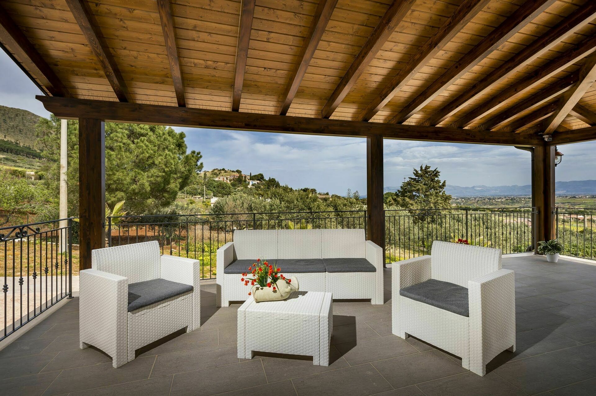 Villaen har en stor veranda med komfortable havemøbler, hvor gæsterne kan slappe af og nyde udsigten over poolen, det omkringliggende landskab og havet.