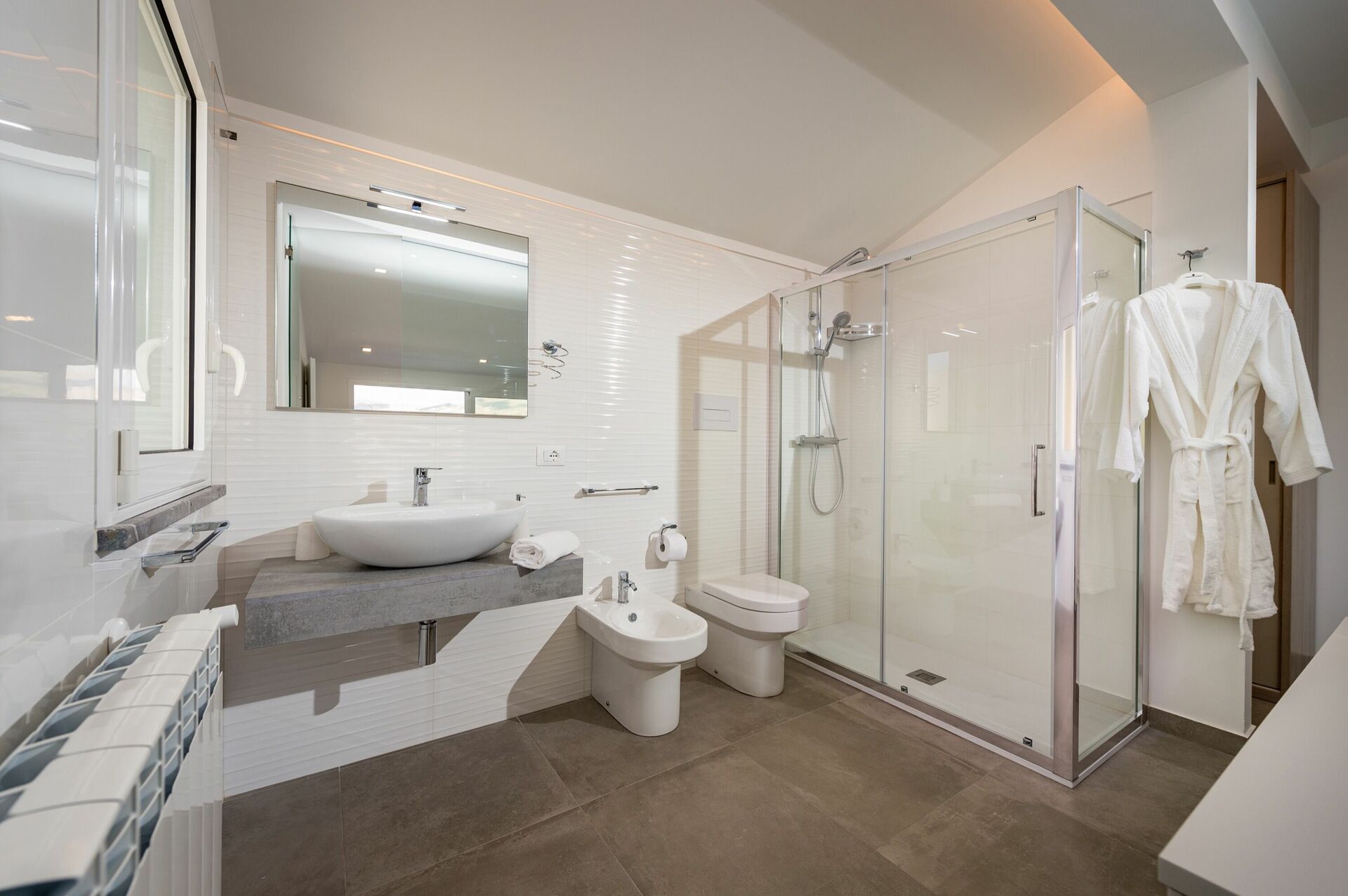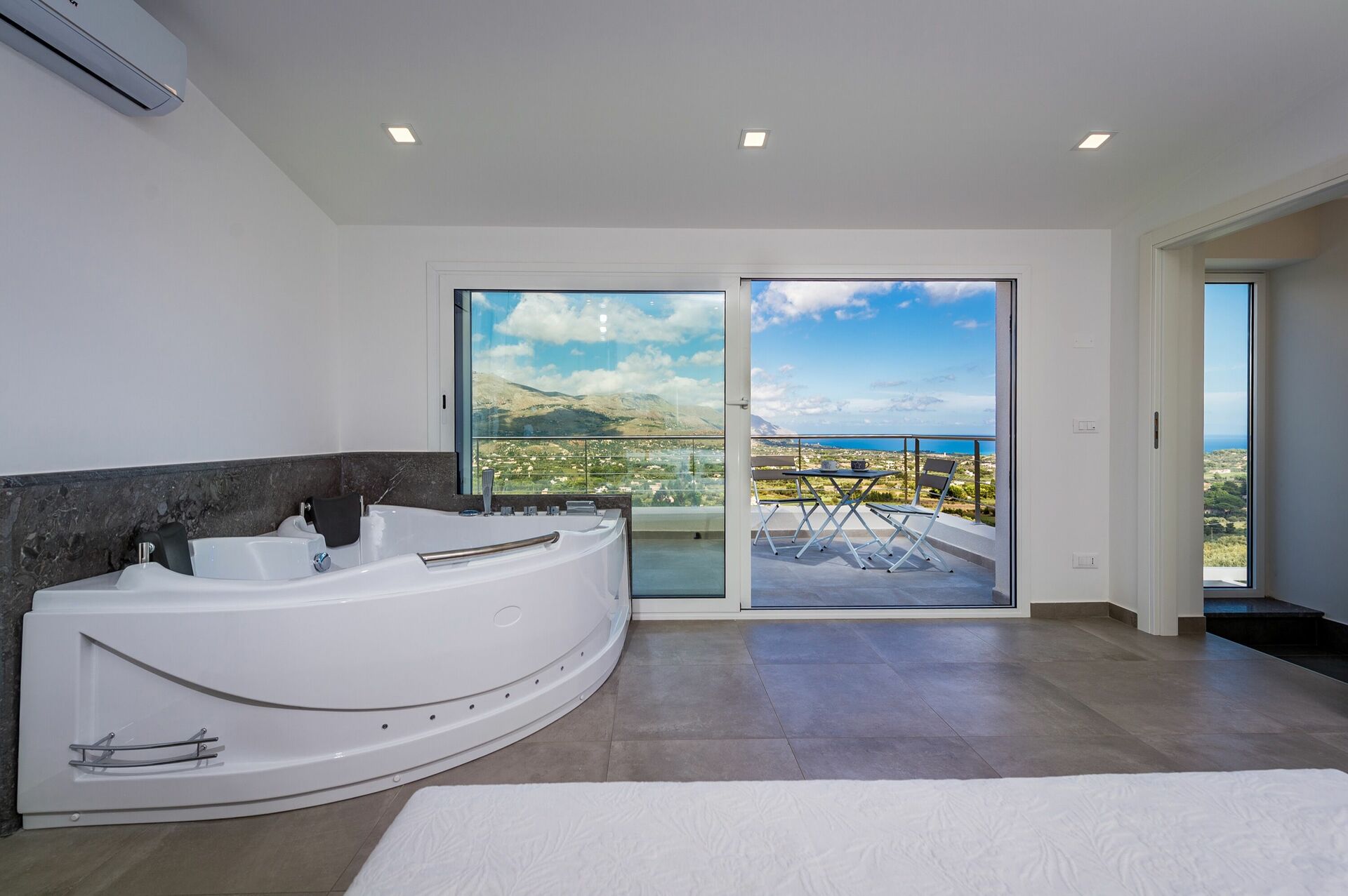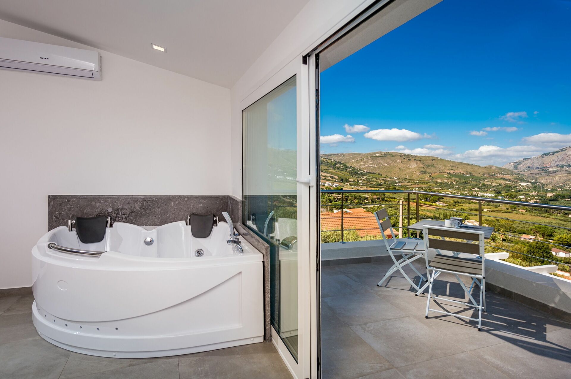 Første sal: dobbeltværelse med boblebad og privat badeværelse med bruser, panoramaterrasse.