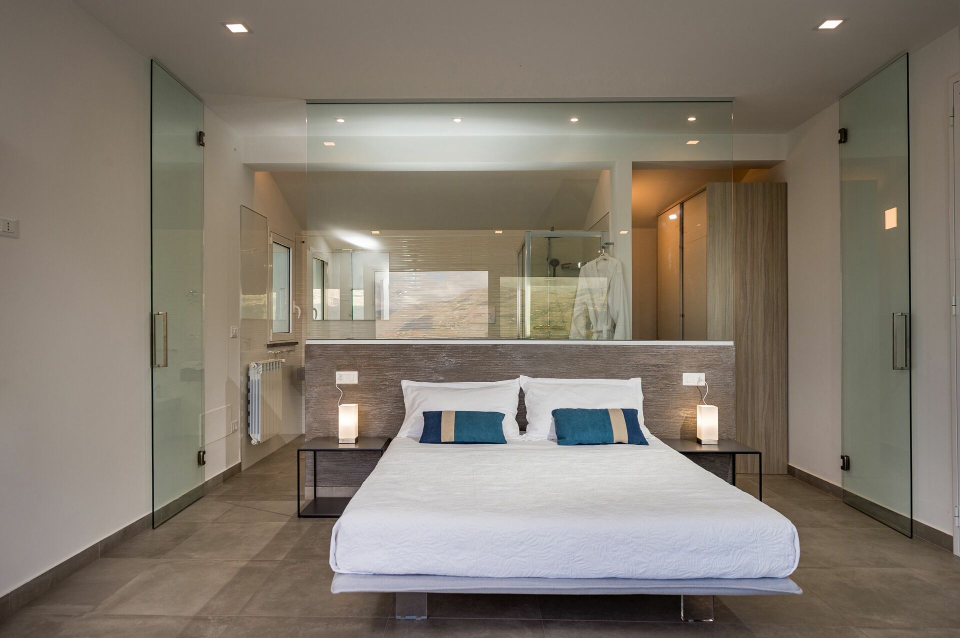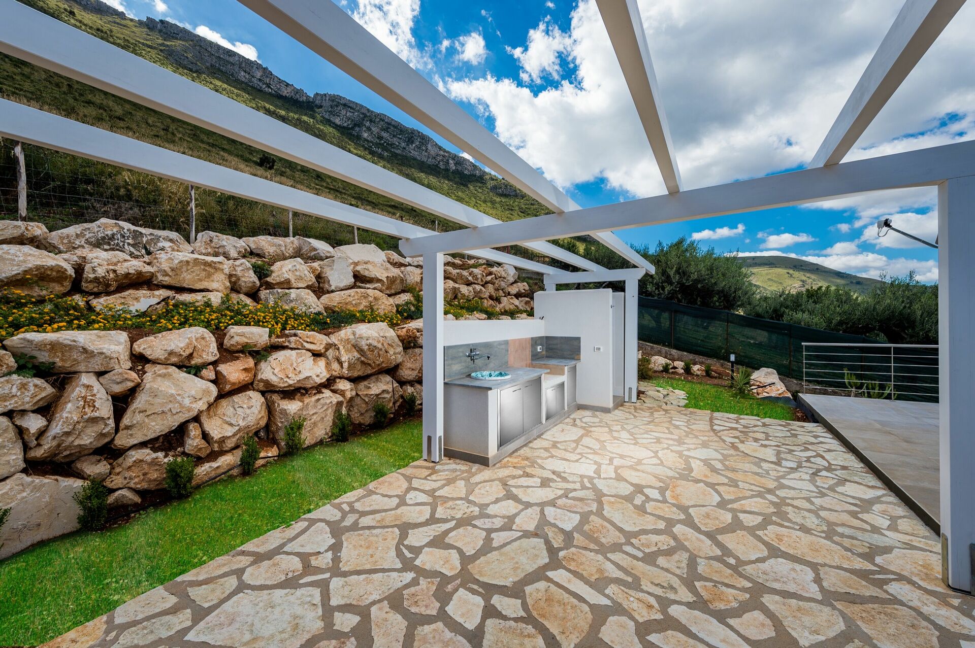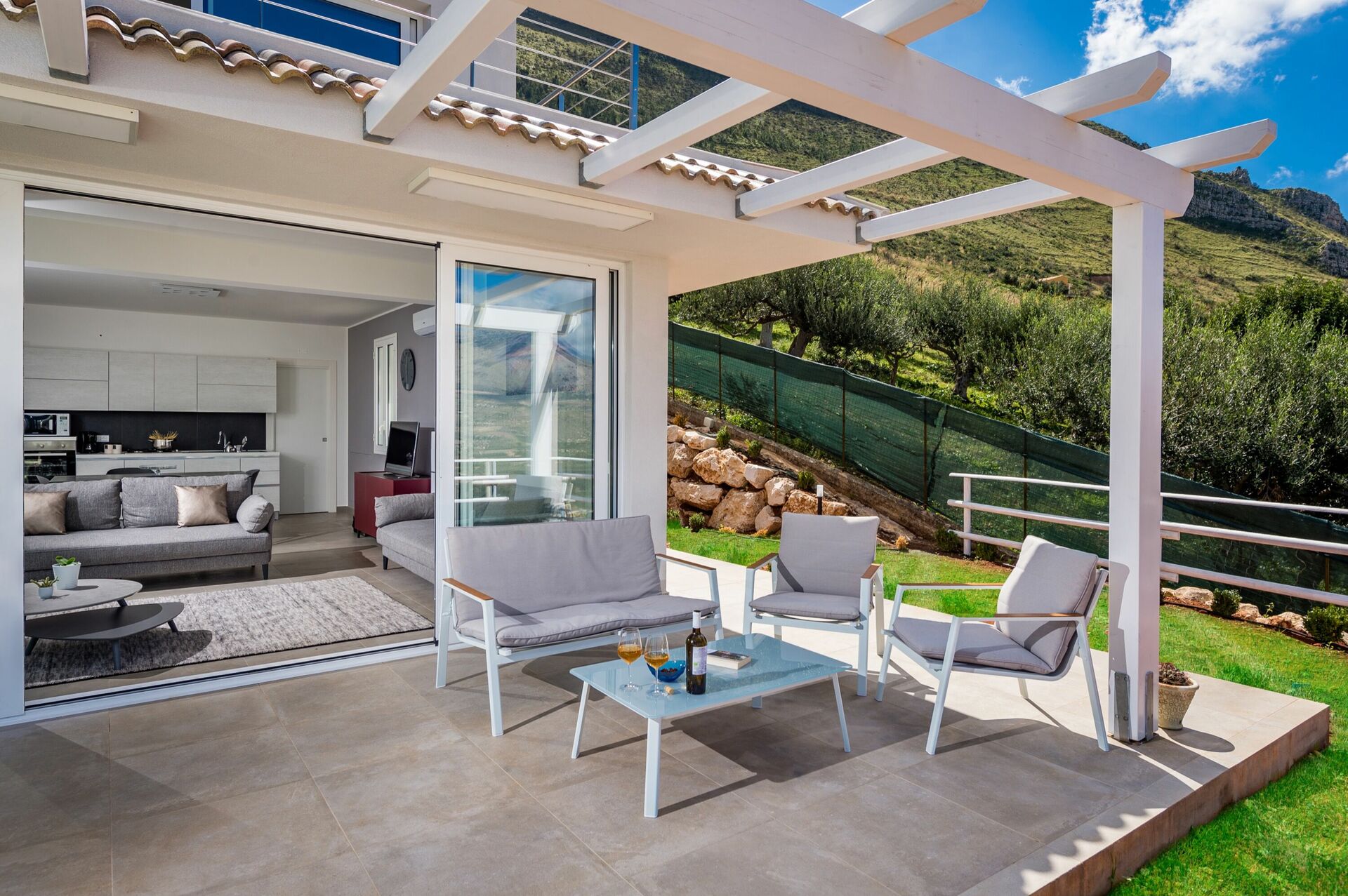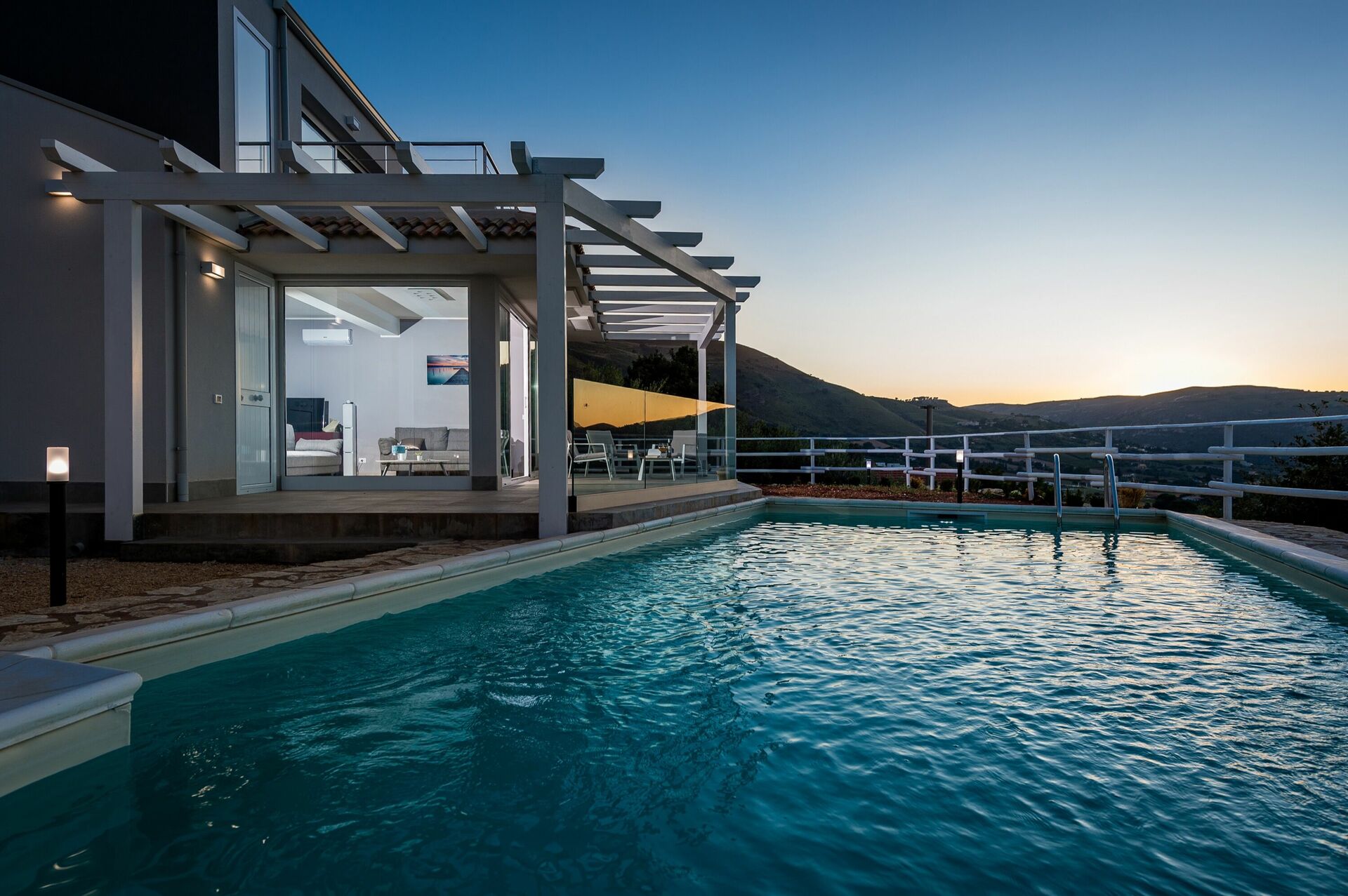 Feriehuset er indrettet i moderne stil og er på to niveauer. De store vinduer giver følelsen af at være udenfor, selv når du sidder behageligt i stuen. Fra hjørnet af huset har du panoramaudsigt over det fantastiske sicilianske landskab og med havet i det fjerne.