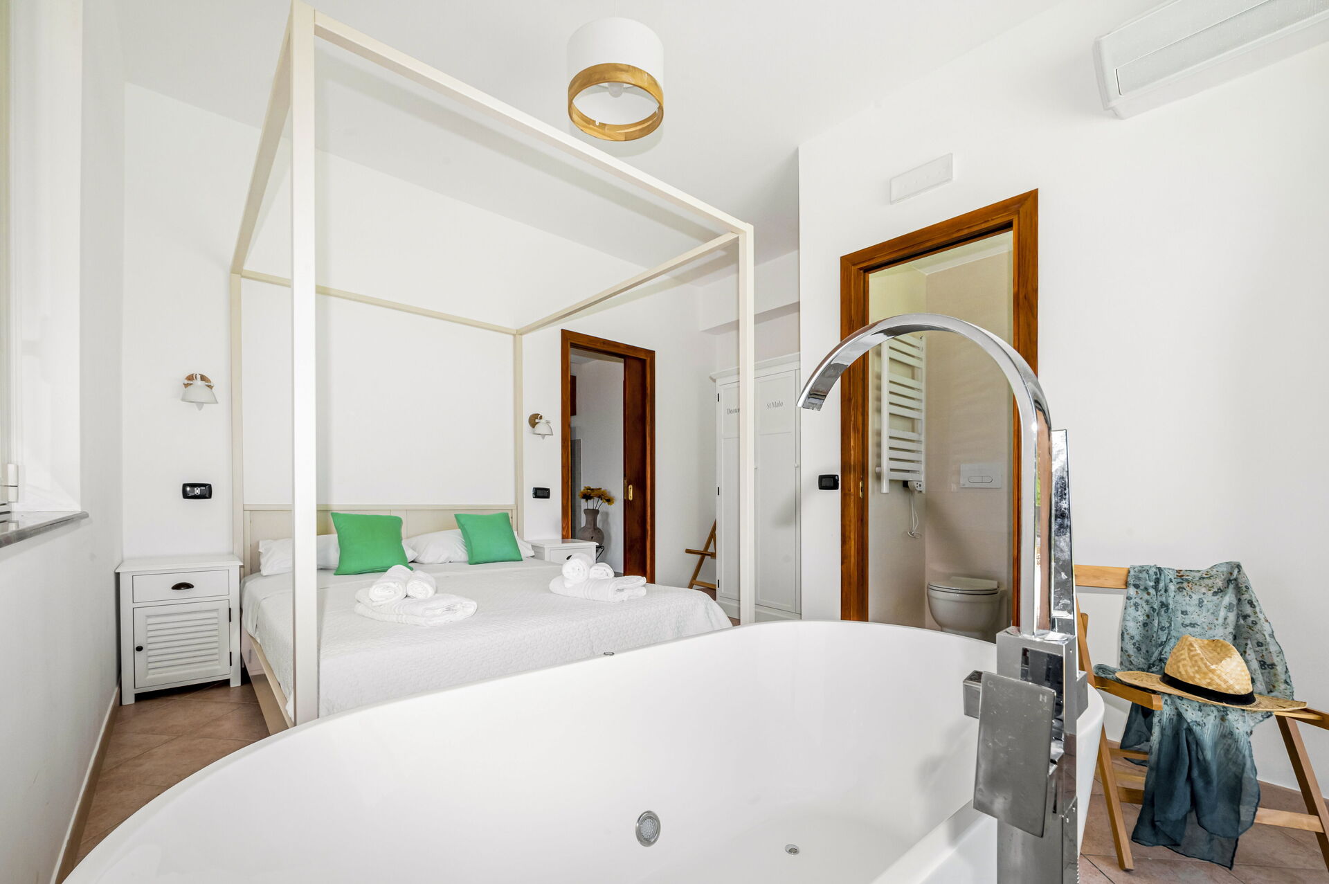 Indgang til stue med dobbelt sovesofa og køkken (aircondition, tv, induktionskomfur, ovn, køleskab, fryser, opvaskemaskine, mikroovn, brødrister, espressomaskine) med spiseplads, 1 dobbeltværelse (aircondition, kingsize seng) med privat badeværelse med hydromassagebadekar, 1 dobbeltværelse (med aircondition, super-king-size seng) med badeværelse med badekar, 1 dobbeltværelse (aircondition, king-size seng), 1 twin værelse, badeværelse med bruser