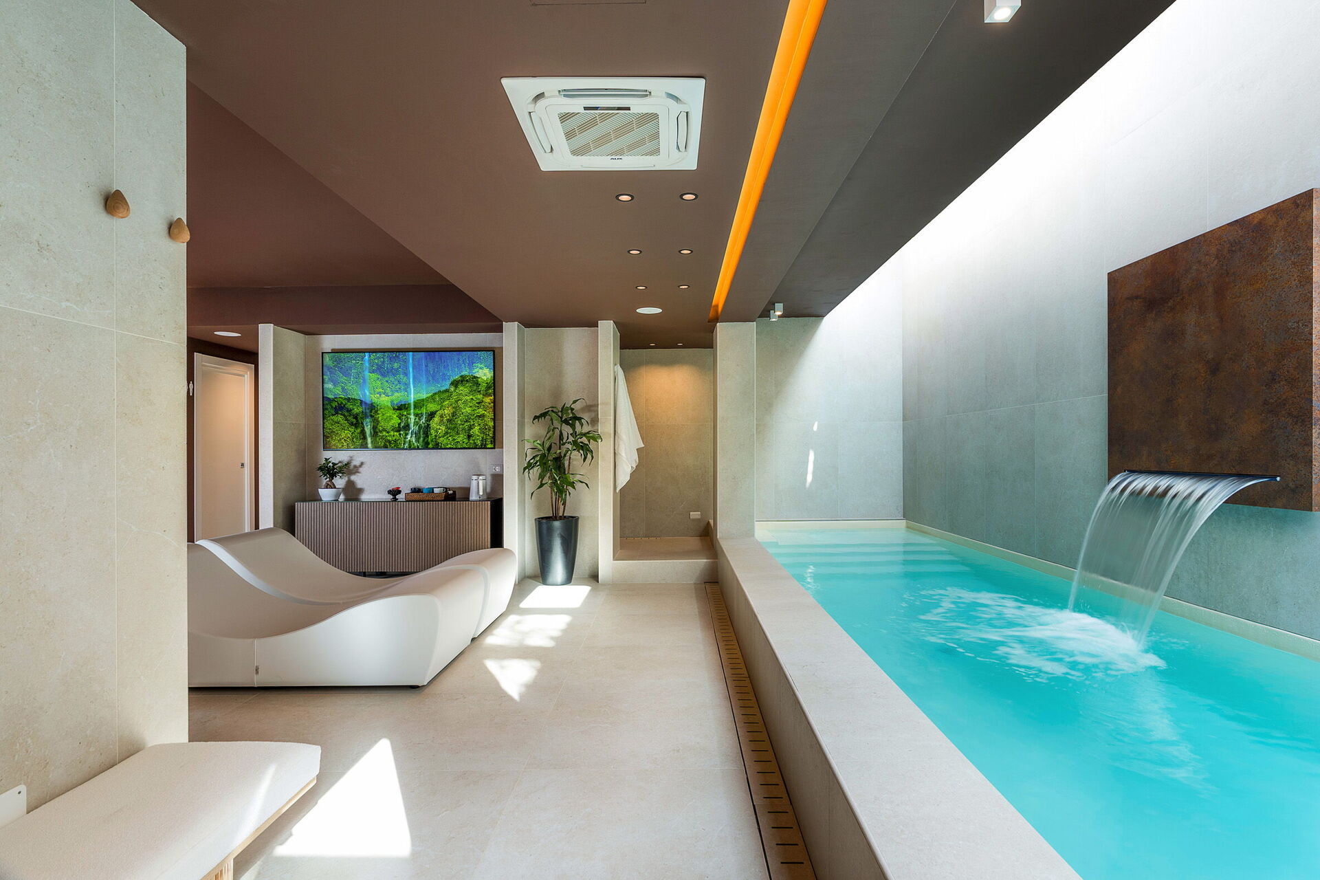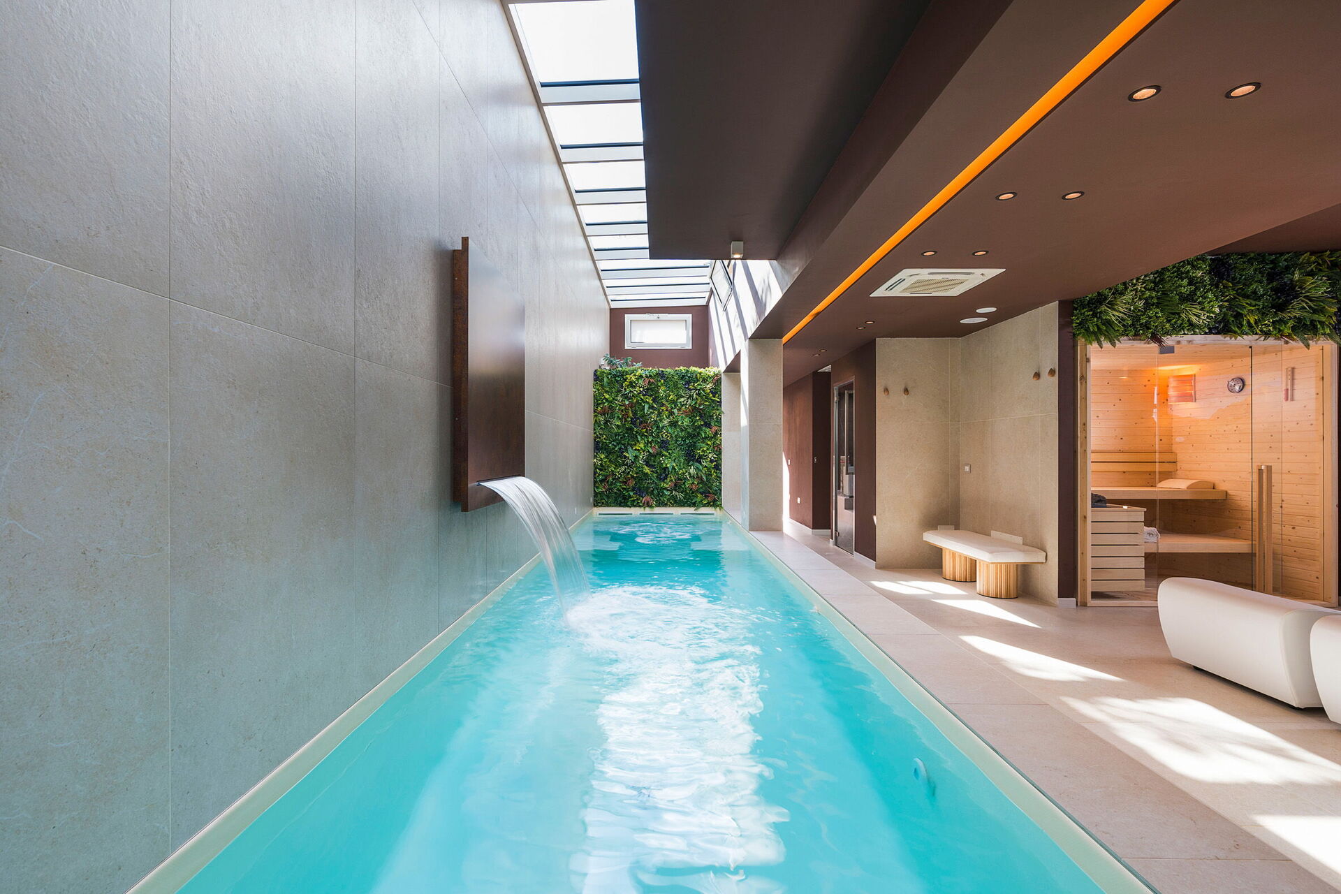 - Privat indendørs pool med vandfald og boblehjørne (9 x 2 meter; dybde: 1,2 meter), som kan opvarmes til 28°C efter anmodning (uden ekstra omkostninger)