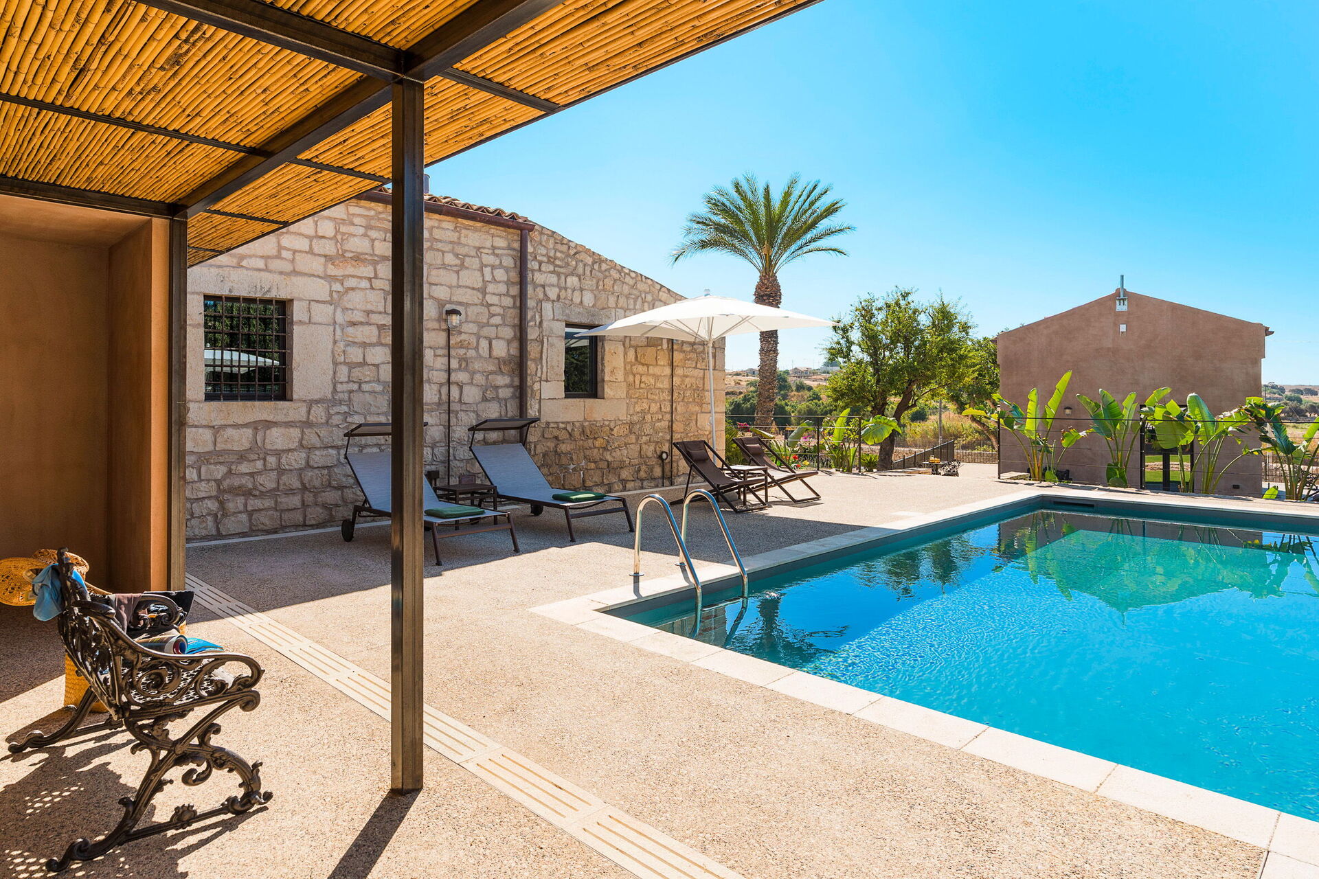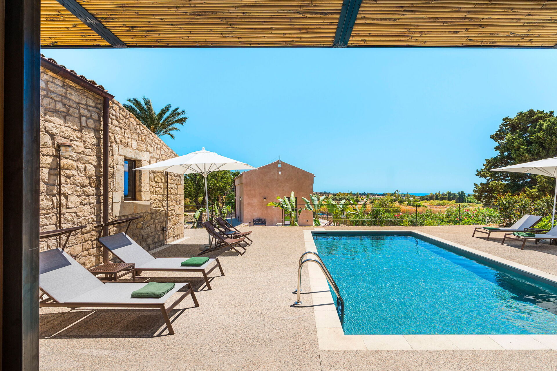 Villaen er omgivet af en stor, velplejet have indhegnet af traditionelle stenmursterrasser. Her finder du også en skøn privat pool med solsenge.