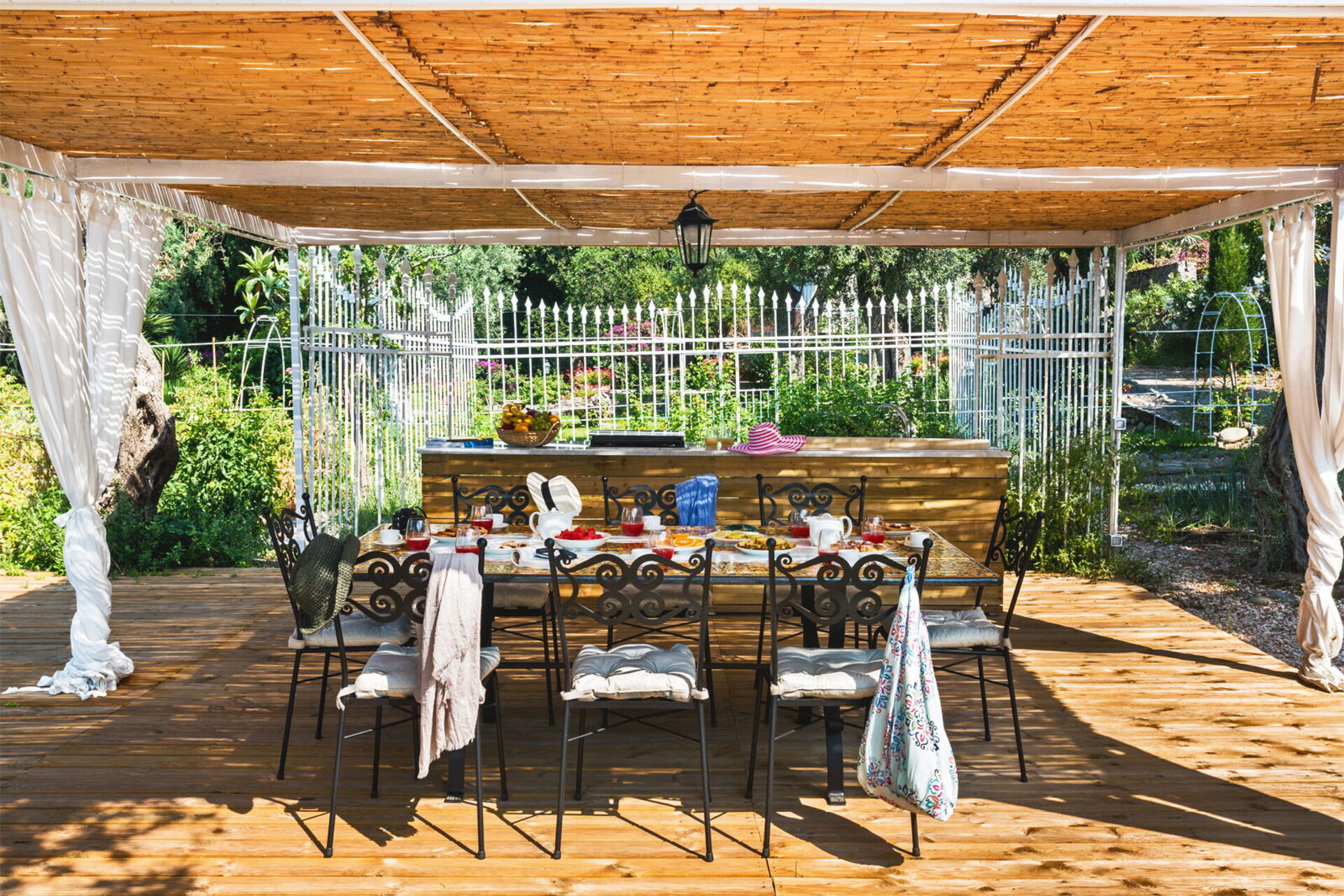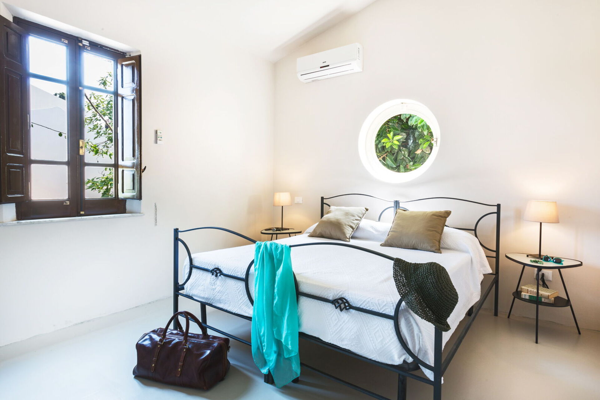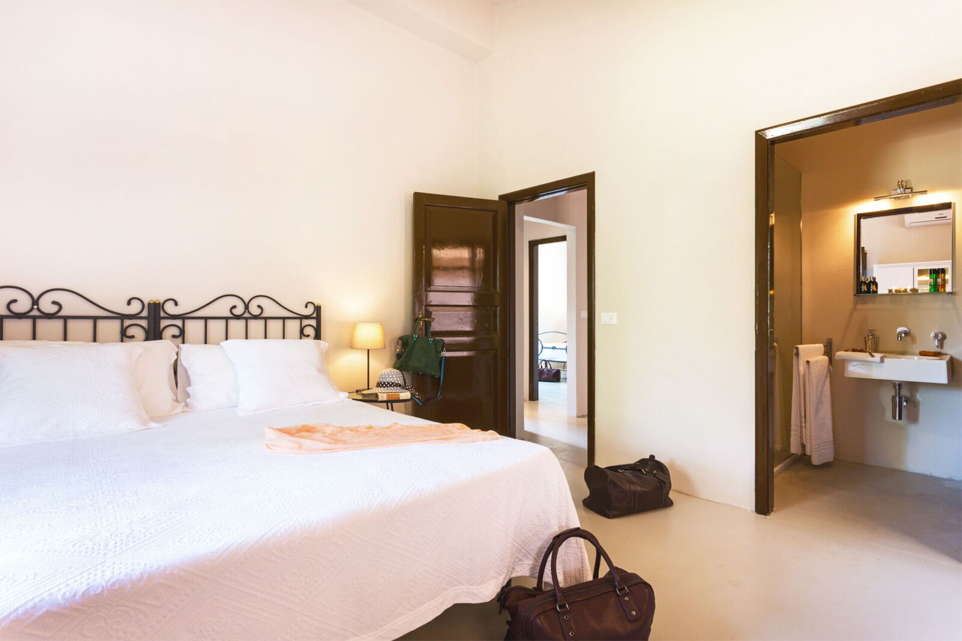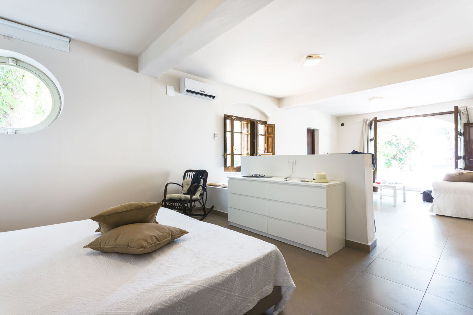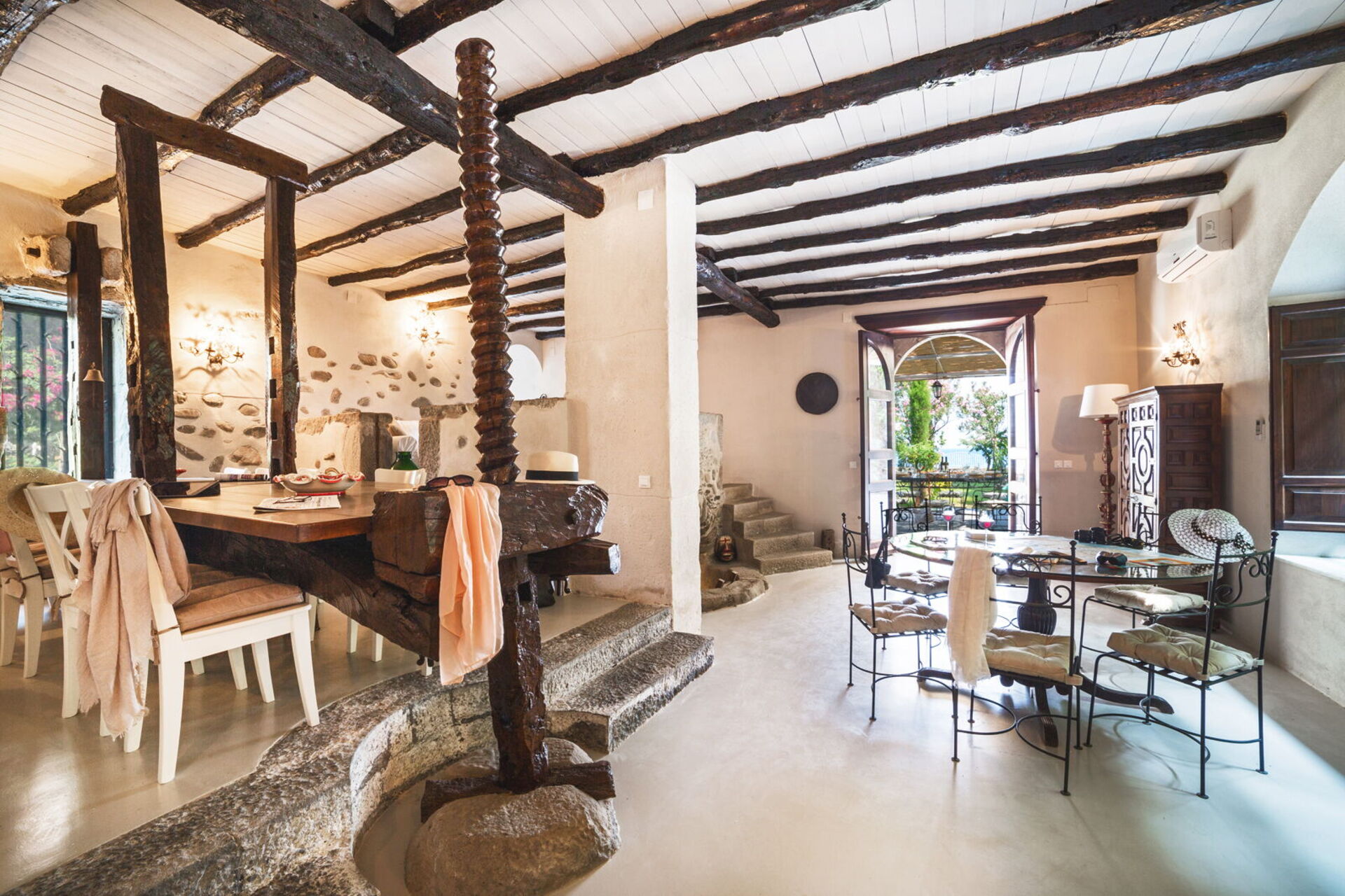 Villaen er smagfuldt indrettet med unikke elementer, såsom spisebordet, der understøttes af en vinpresse, som en hyldest til husets landbrugshistorie. Den frodige have med palmer og oliventræer, der omgiver feriehuset, bidrager til dets charme og skønhed.