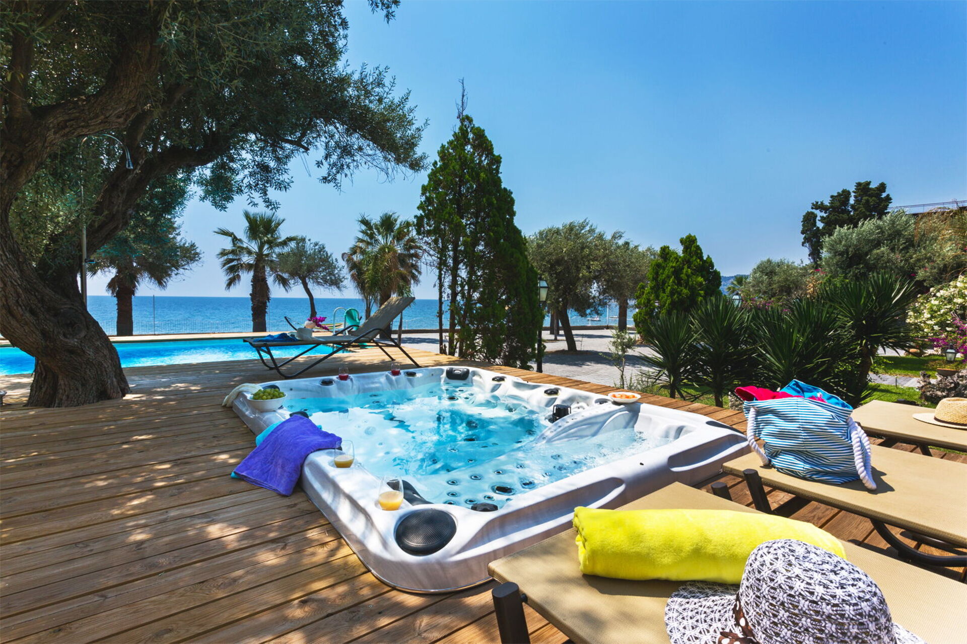 Udendørsområderne giver gæsterne masser af plads til at nyde deres ophold med familie eller venner, hvor man kan slappe af på den forhøjede terrasse, som er møbleret til udendørs spisning, eller i poolområdet med fantastisk udsigt over havet. Du kan også nyde det opvarmede boblebad med havet som baggrund.