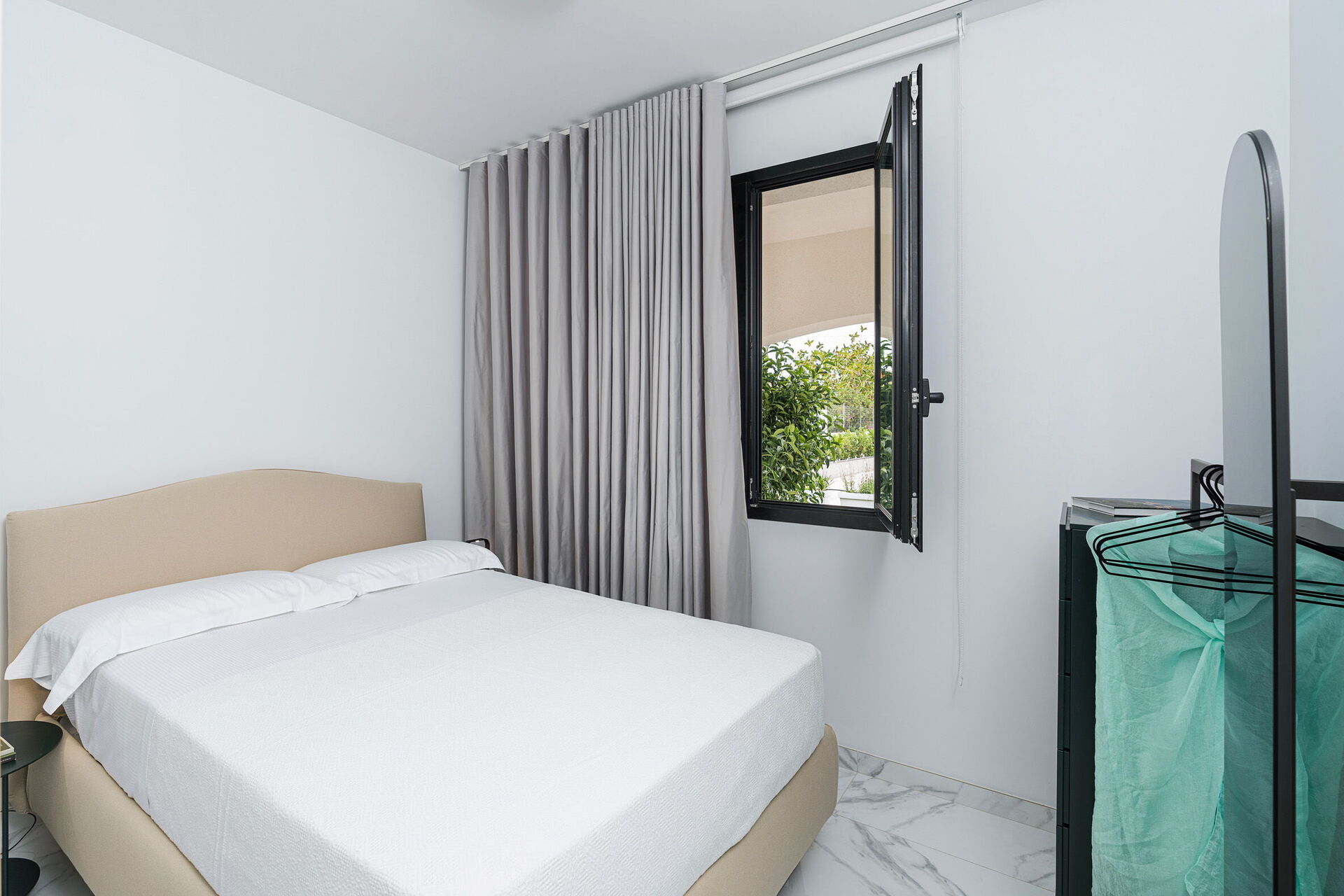 Stue (aircondition, TV) med spiseplads og køkken (kogeplader, ovn, fryser, køleskab, opvaskemaskine, kaffemaskine, brødrister), 1 dobbeltværelse (aircondition, myggenet) med eget badeværelse med bruser, 1 soveværelse med Fransk dobbeltseng (mål 140 x 200) (aircondition, myggenet), 1 dobbeltværelse (aircondition, myggenet), badeværelse med bruser