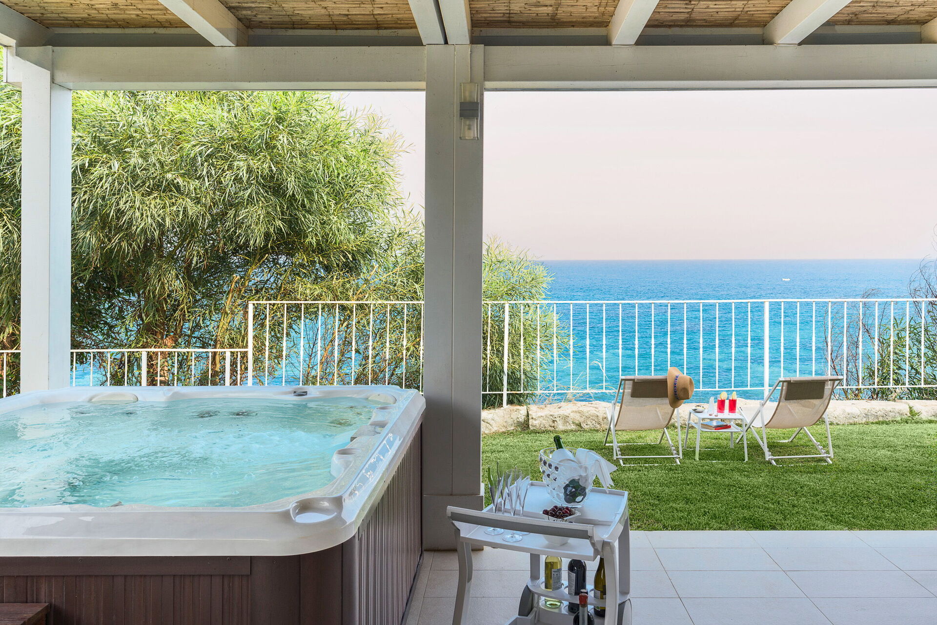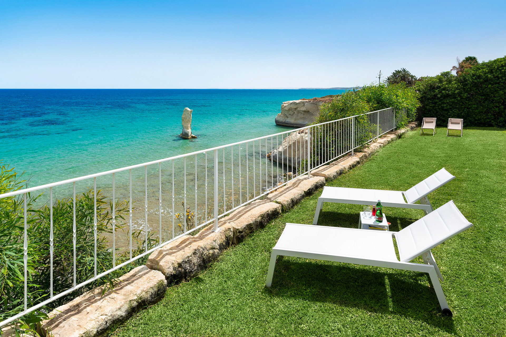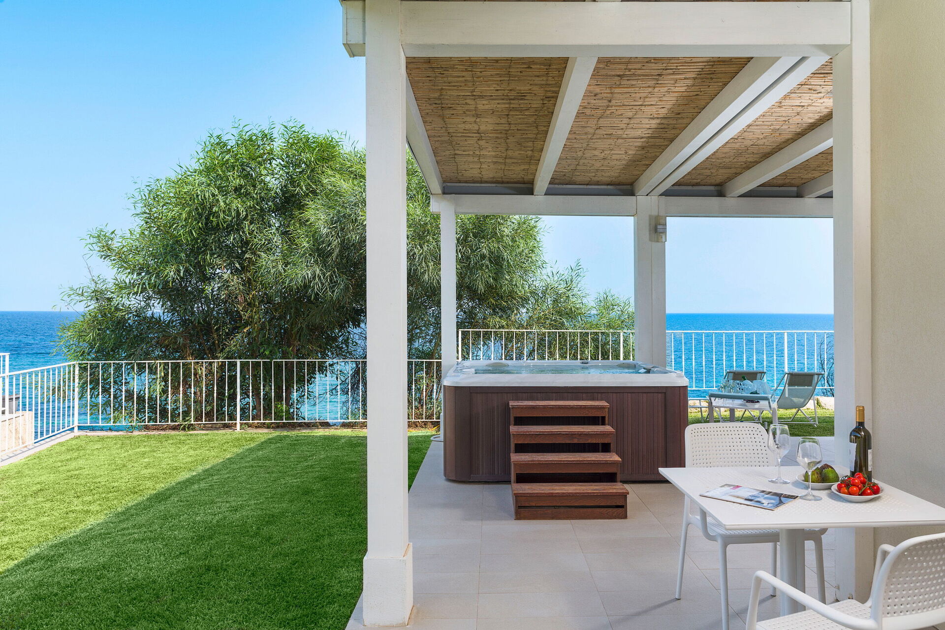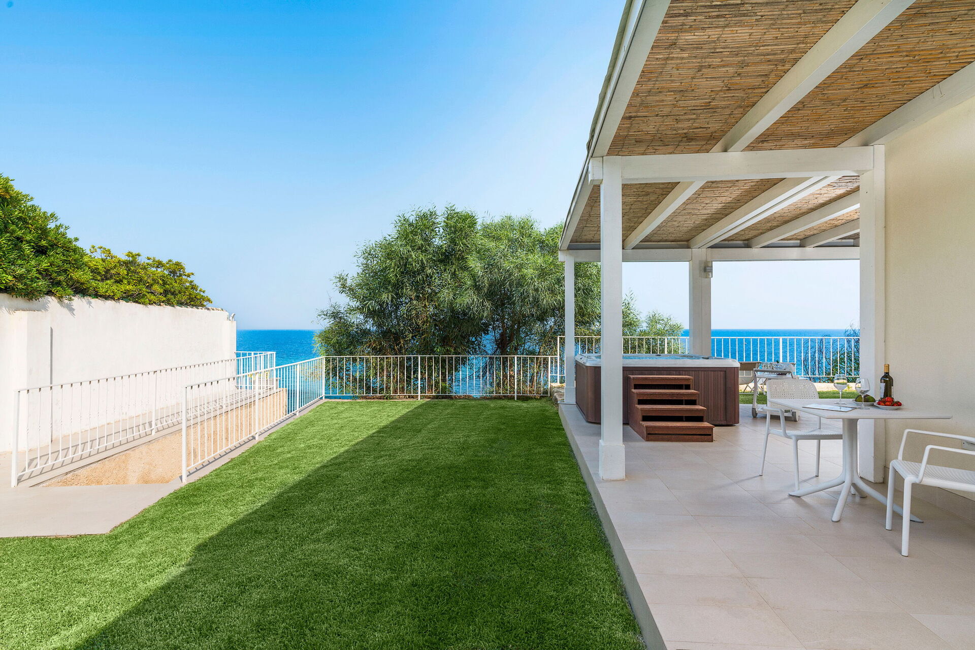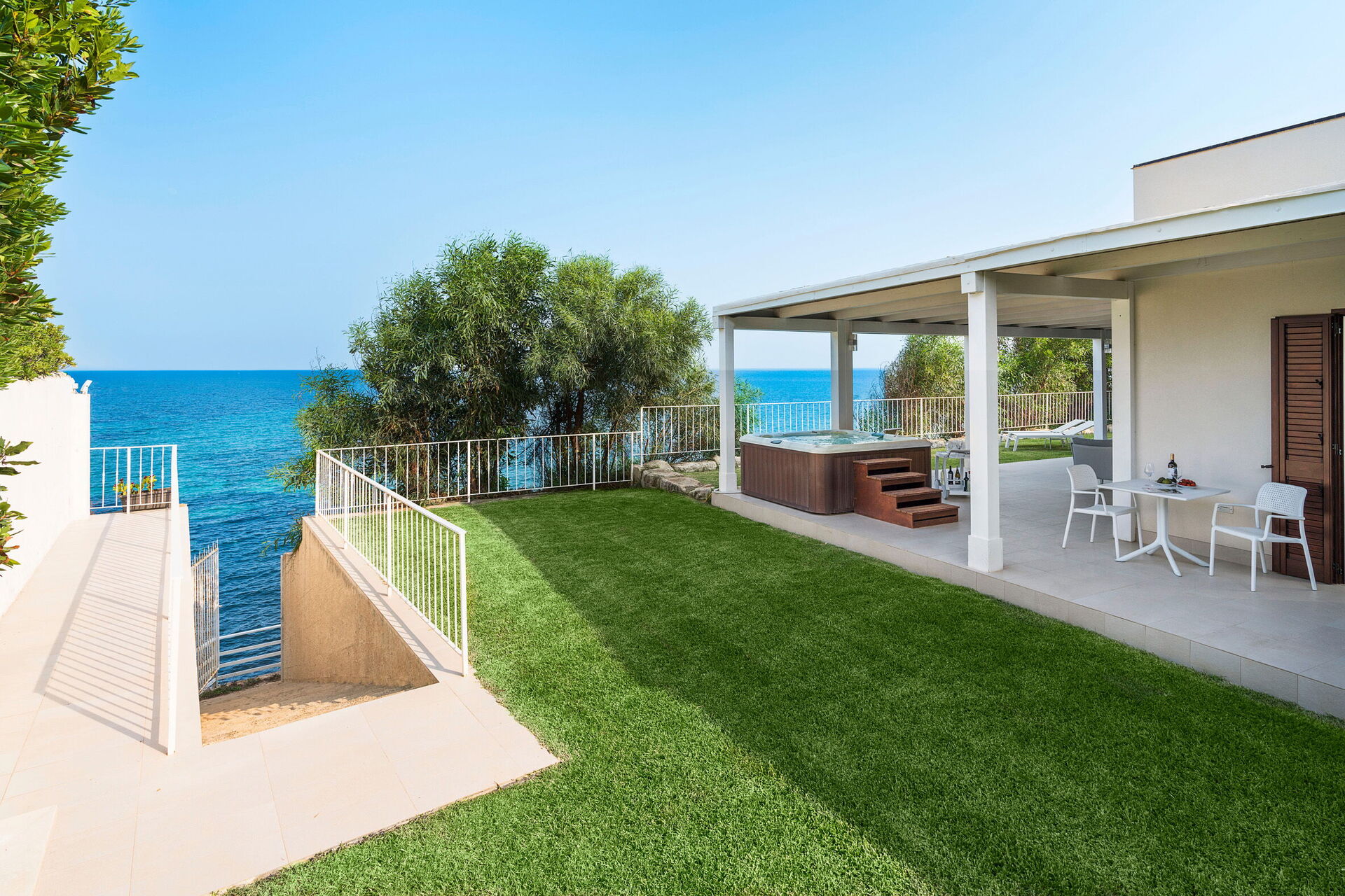 Udearealerne med panoramaudsigt har mange fællesarealer, perfekt til hyggelige stunder med familie eller venner. Der er også et udendørs og opvarmet boblebad, direkte adgang til klinten og havet.