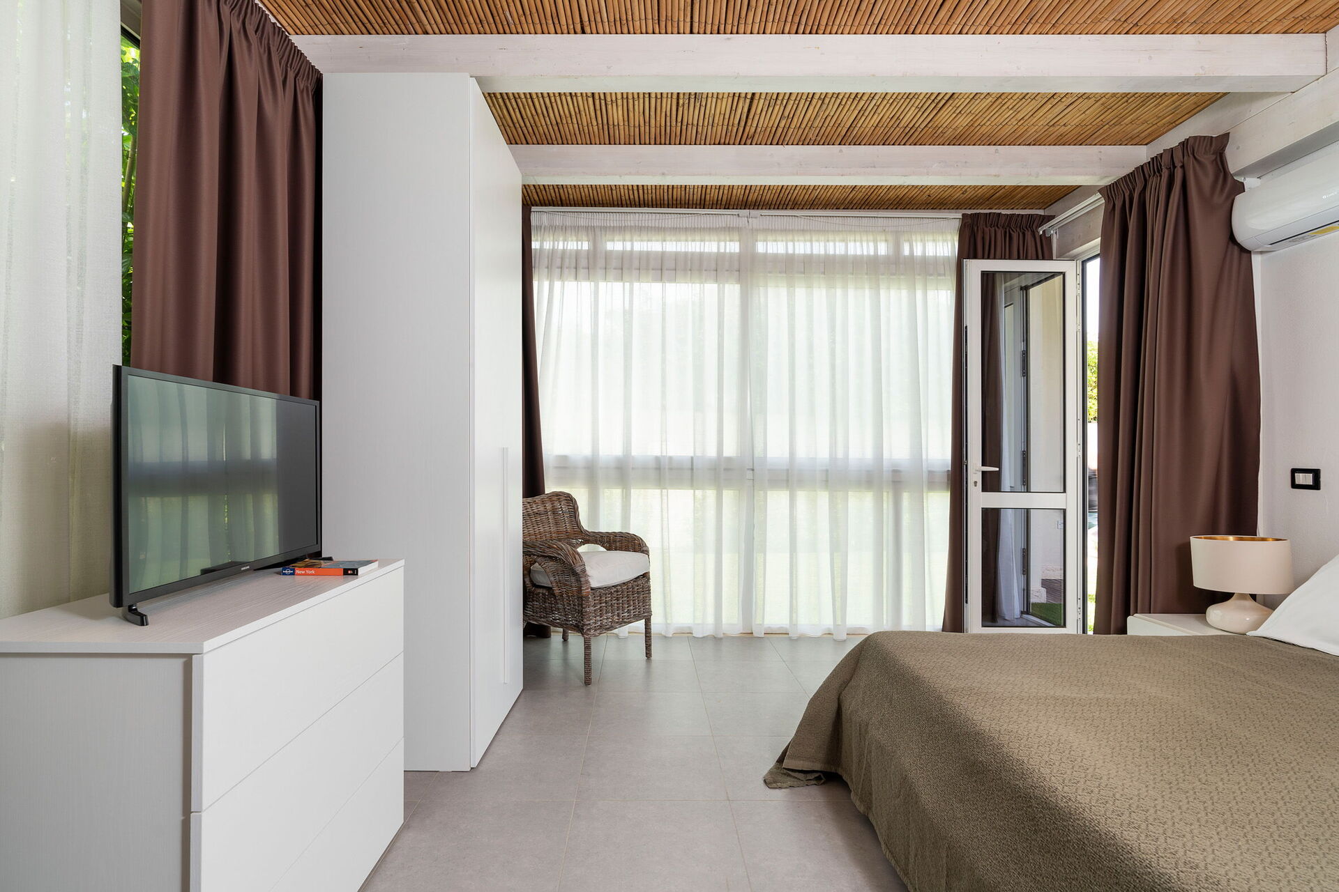Stue (aircondition, TV) med spiseplads og køkken (kogeplader, ovn, fryser, køleskab, opvaskemaskine, kaffemaskine, brødrister), 1 dobbeltværelse (aircondition, myggenet) med eget badeværelse med bruser, 1 dobbeltværelse (aircondition, myggenet), badeværelse med bruser